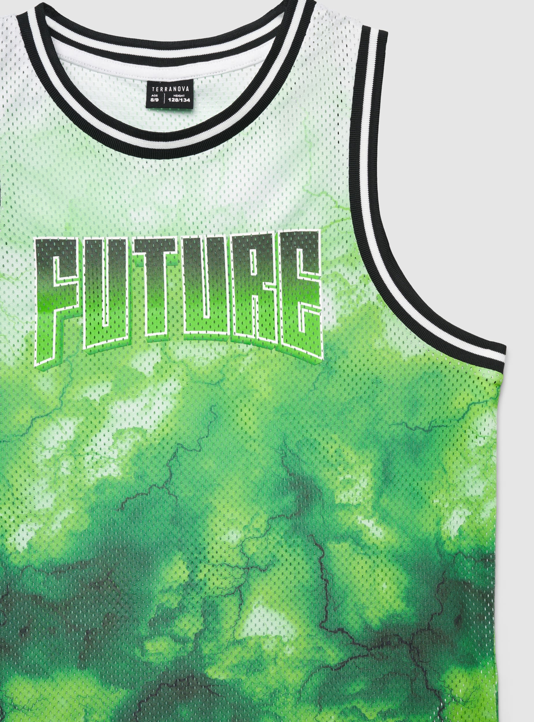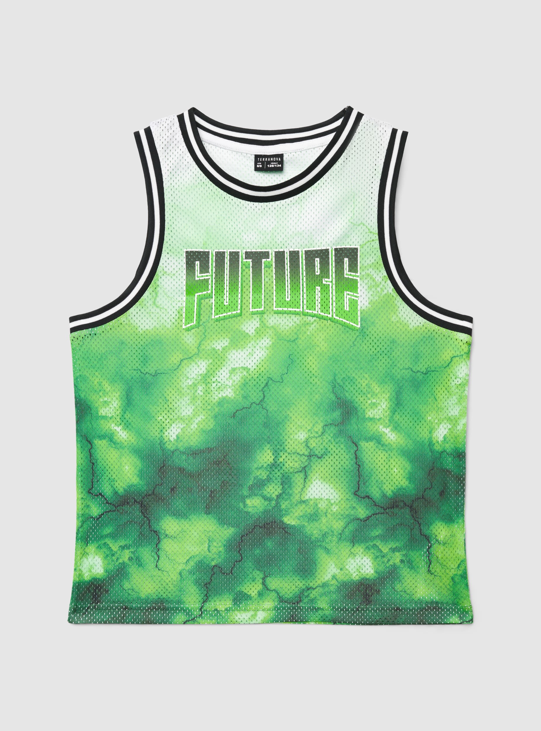 Canotta da bambino in rete con girocollo e taglio senza maniche, pensata per il tempo libero e le attività sportive. Il design con profili a righe e stampa all over effetto fulmini è completato dalla scritta sul davanti. Vestibilità regular, ideale con pantaloncini, jogger o jeans e sneakers per un look dinamico.Dettagli