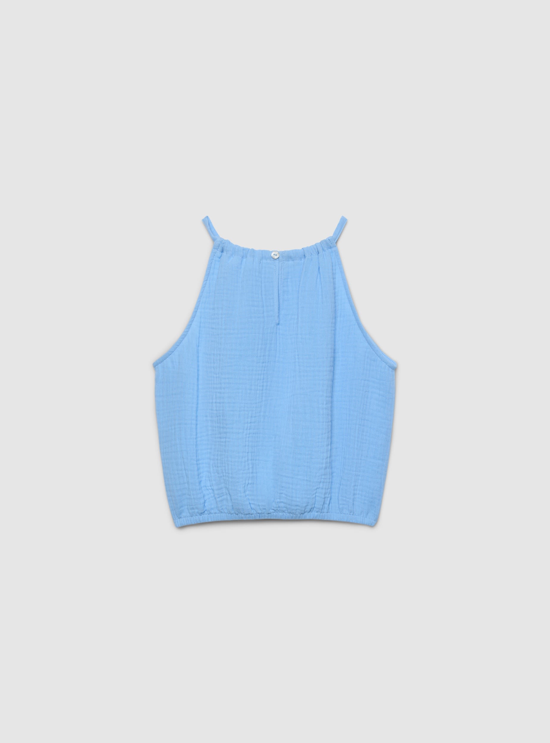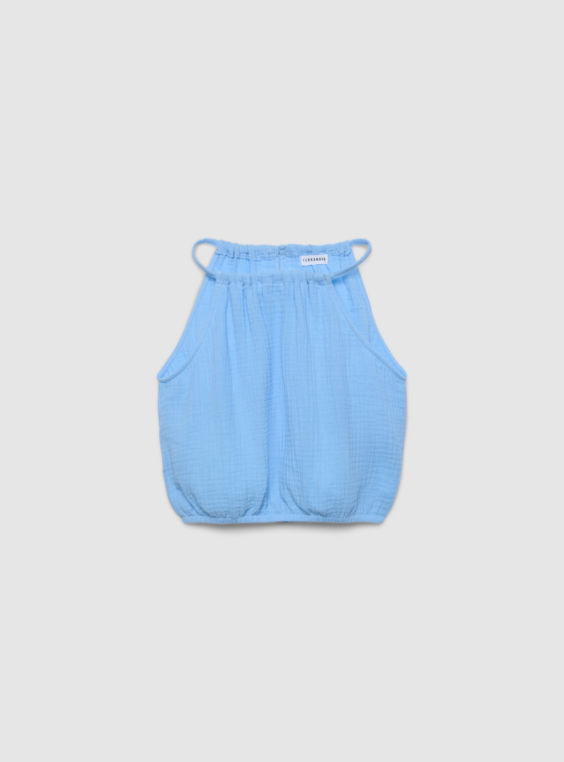 Top da bambina a tinta unita con spalle scoperte e sottili spalline. Modello corto con bordo elasticizzato sul fondo che crea un effetto morbido, perfetto per giornate estive e tempo libero. Chiusura posteriore con piccolo bottone. Si abbina facilmente a pantaloncini o gonne per look freschi e leggeri.Dettagli