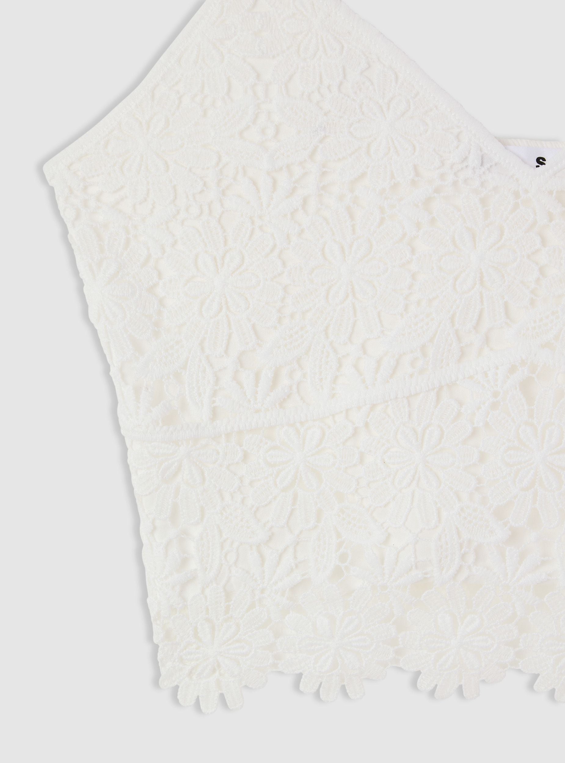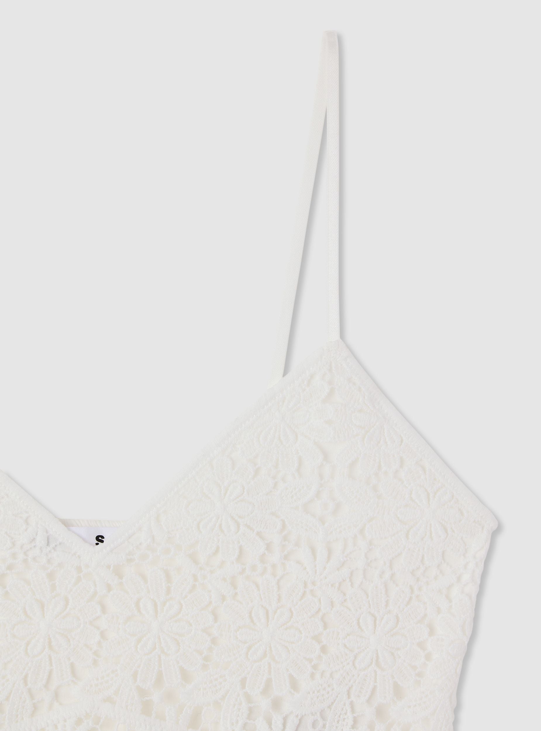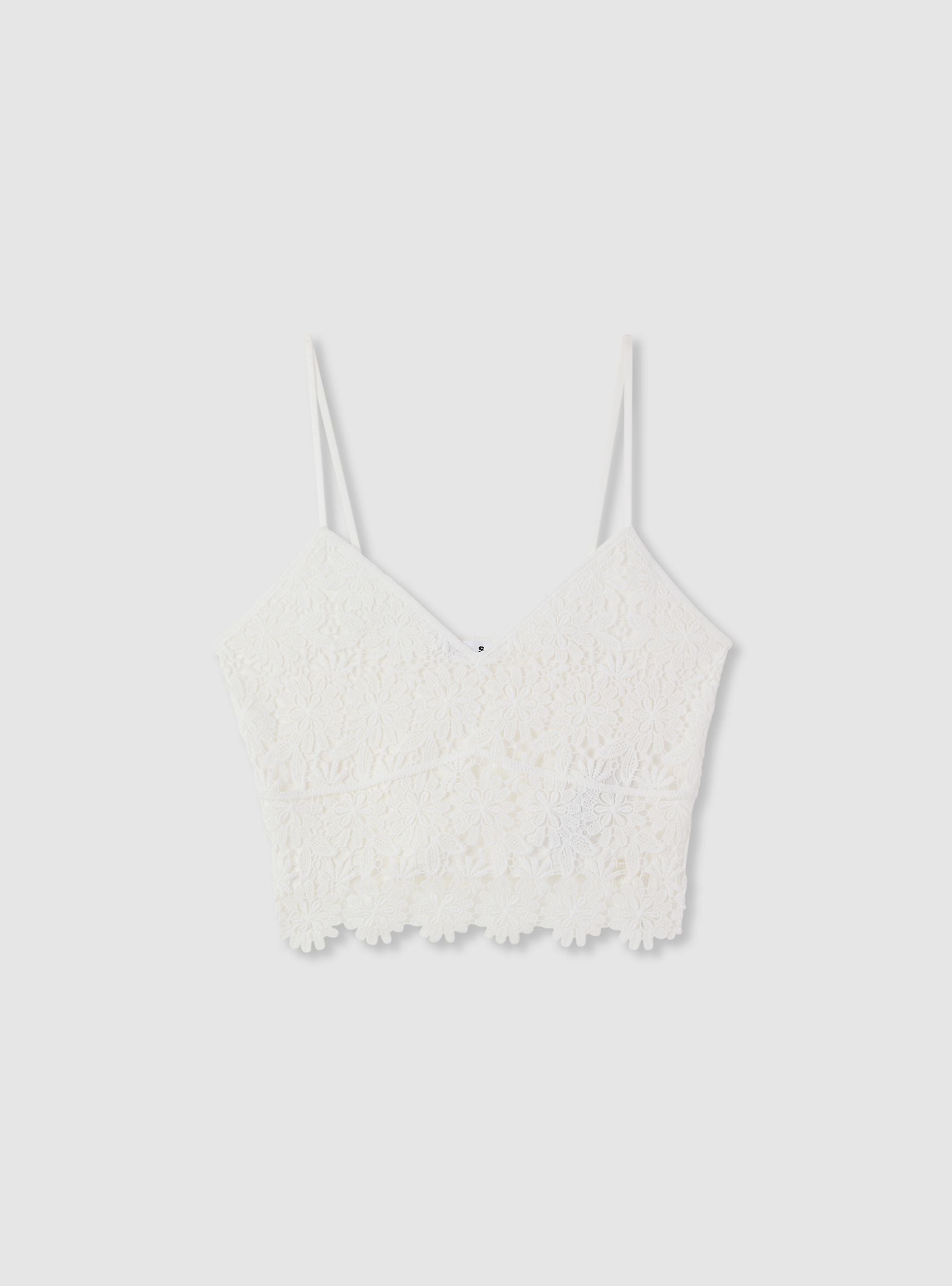 Top da donna a tinta unita con lavorazione in macramè a motivo floreale, ideale per look estivi e serate speciali. Scollo a V e spalline sottili valorizzano la linea, mentre la lunghezza corta con bordo smerlato aggiunge carattere. Modello senza chiusura, con fodera interna per maggiore coprenza. Perfetto con jeans a vita alta o gonne fluide.Dettagli