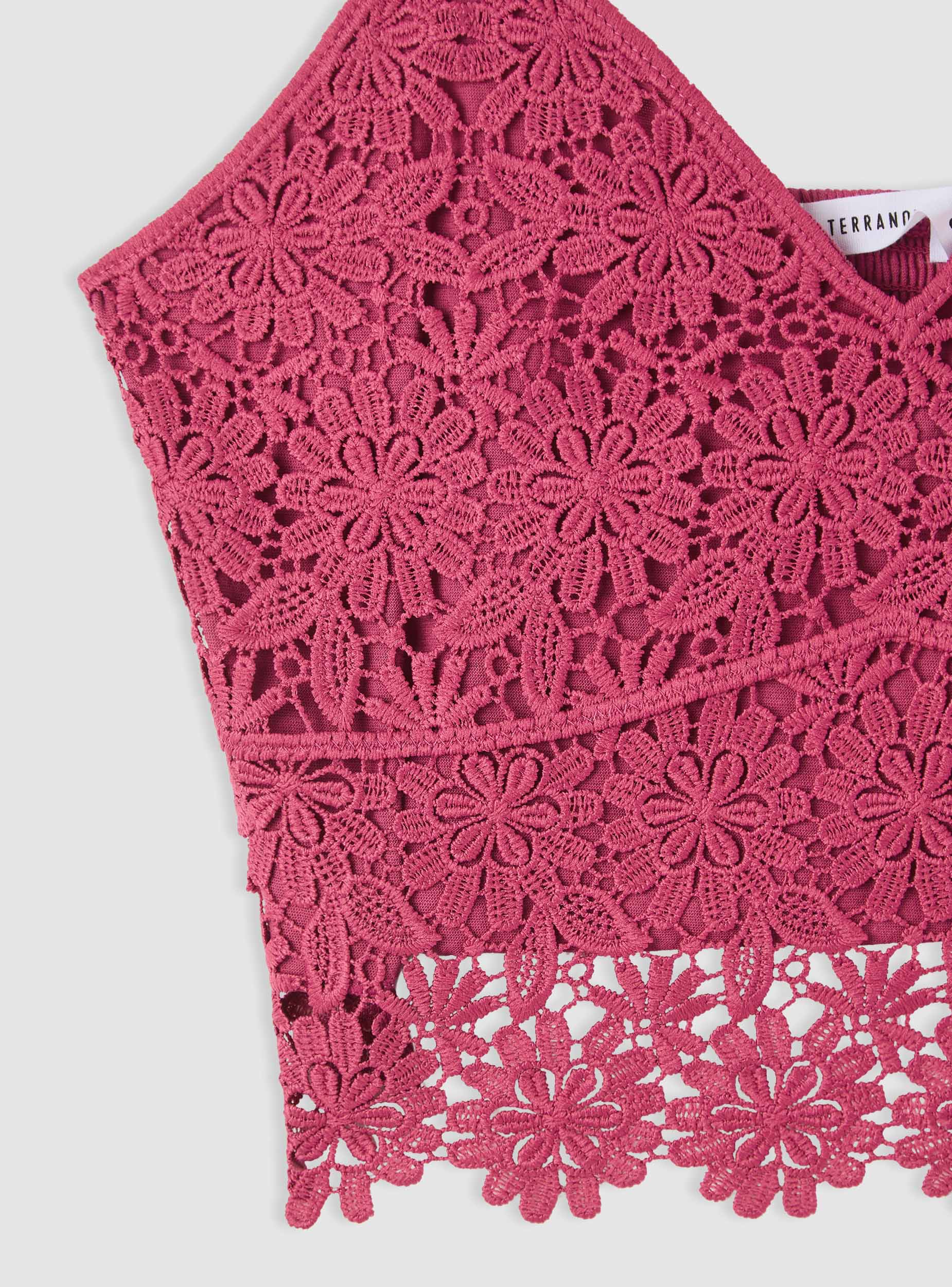 Top da donna a tinta unita con lavorazione in macramè a motivo floreale, ideale per look estivi e serate speciali. Scollo a V e spalline sottili valorizzano la linea, mentre la lunghezza corta con bordo smerlato aggiunge carattere. Modello senza chiusura, con fodera interna per maggiore coprenza. Perfetto con jeans a vita alta o gonne fluide.Dettagli