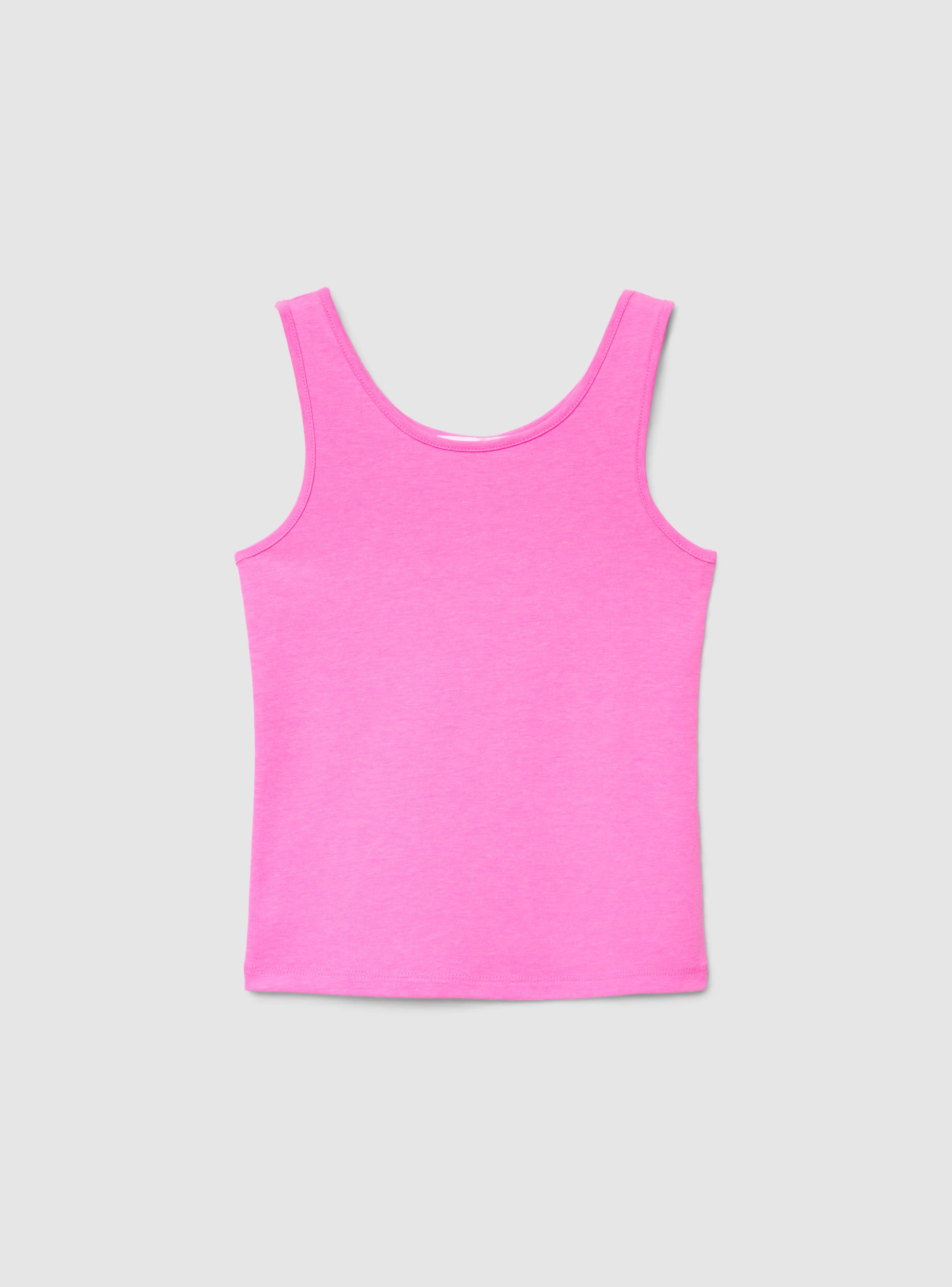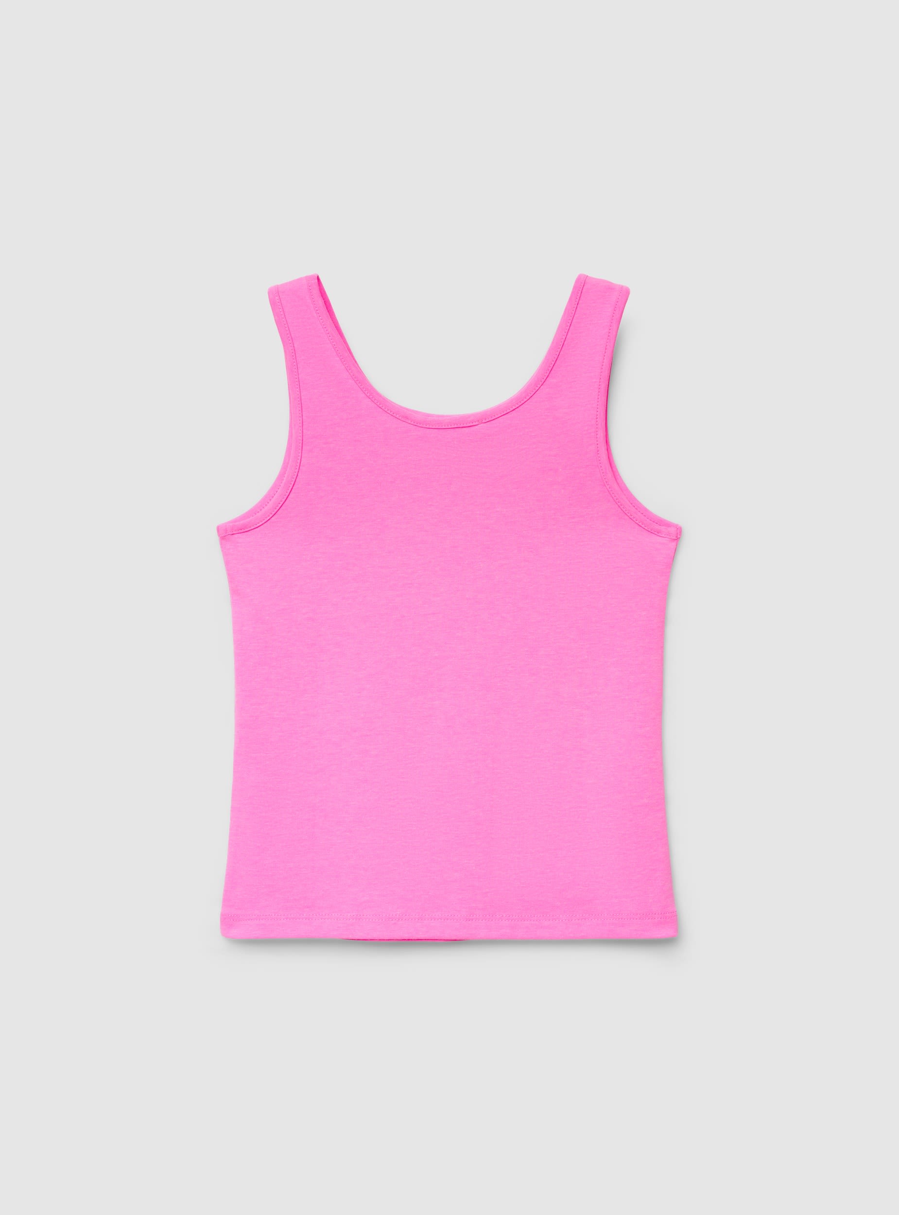 Canotta da bambina a tinta unita con spalla larga e scollo rotondo davanti e dietro. Taglio regular e lunghezza standard, ideale sotto felpe e magliette aperte oppure da sola con jeans, gonne o pantaloncini. Perfetta per il tempo libero e la scuola grazie al design essenziale e comodo, si infila facilmente senza chiusure e si abbina a look casual o sporty.Dettagli