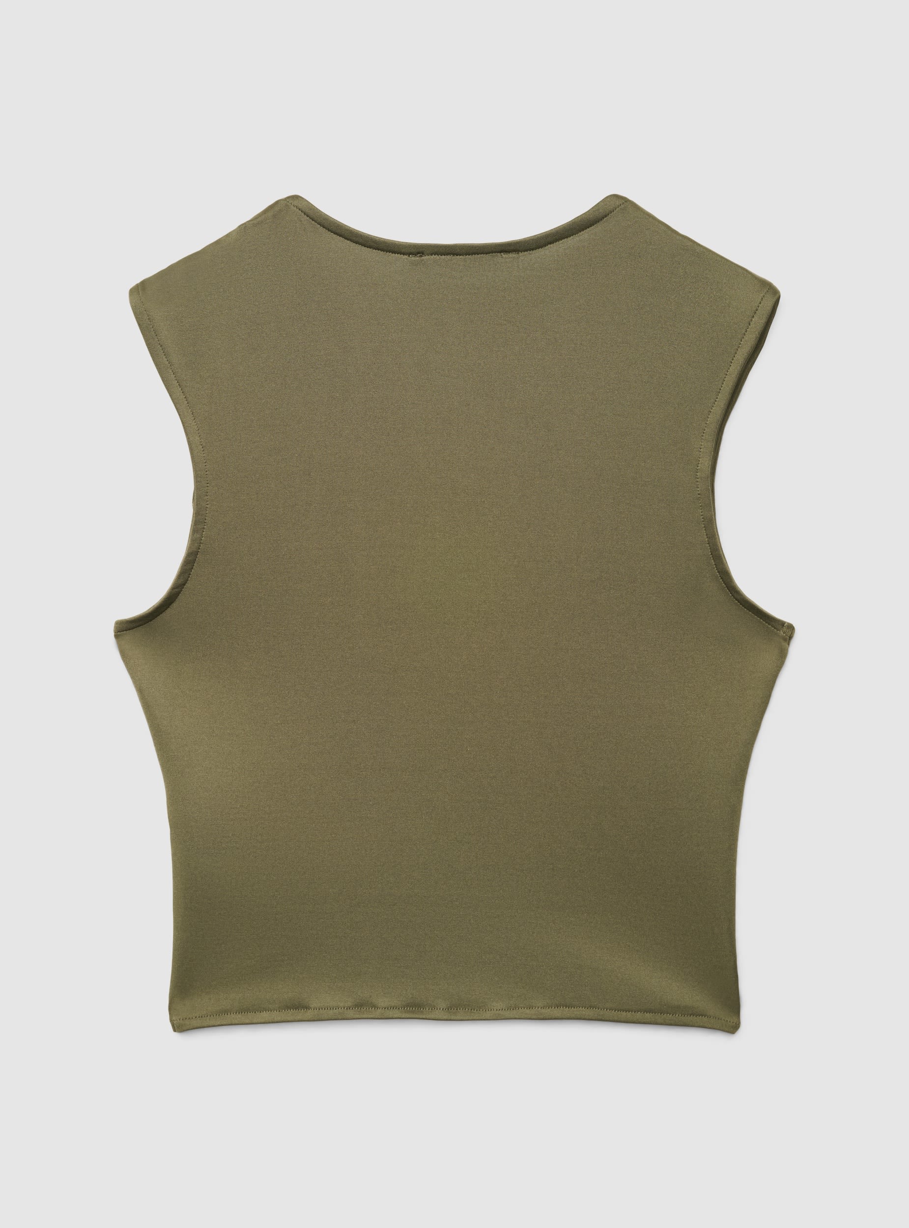 Top da donna a tinta unita dal taglio crop, pensato per valorizzare la silhouette con una linea pulita. Lo scollo squadrato e le spalline larghe donano sostegno e un look deciso, ideale sia da solo sia sotto blazer o camicie aperte. Modello senza maniche, con vestibilità elasticizzata perfetta con jeans, gonne o pantaloni a vita alta.Dettagli