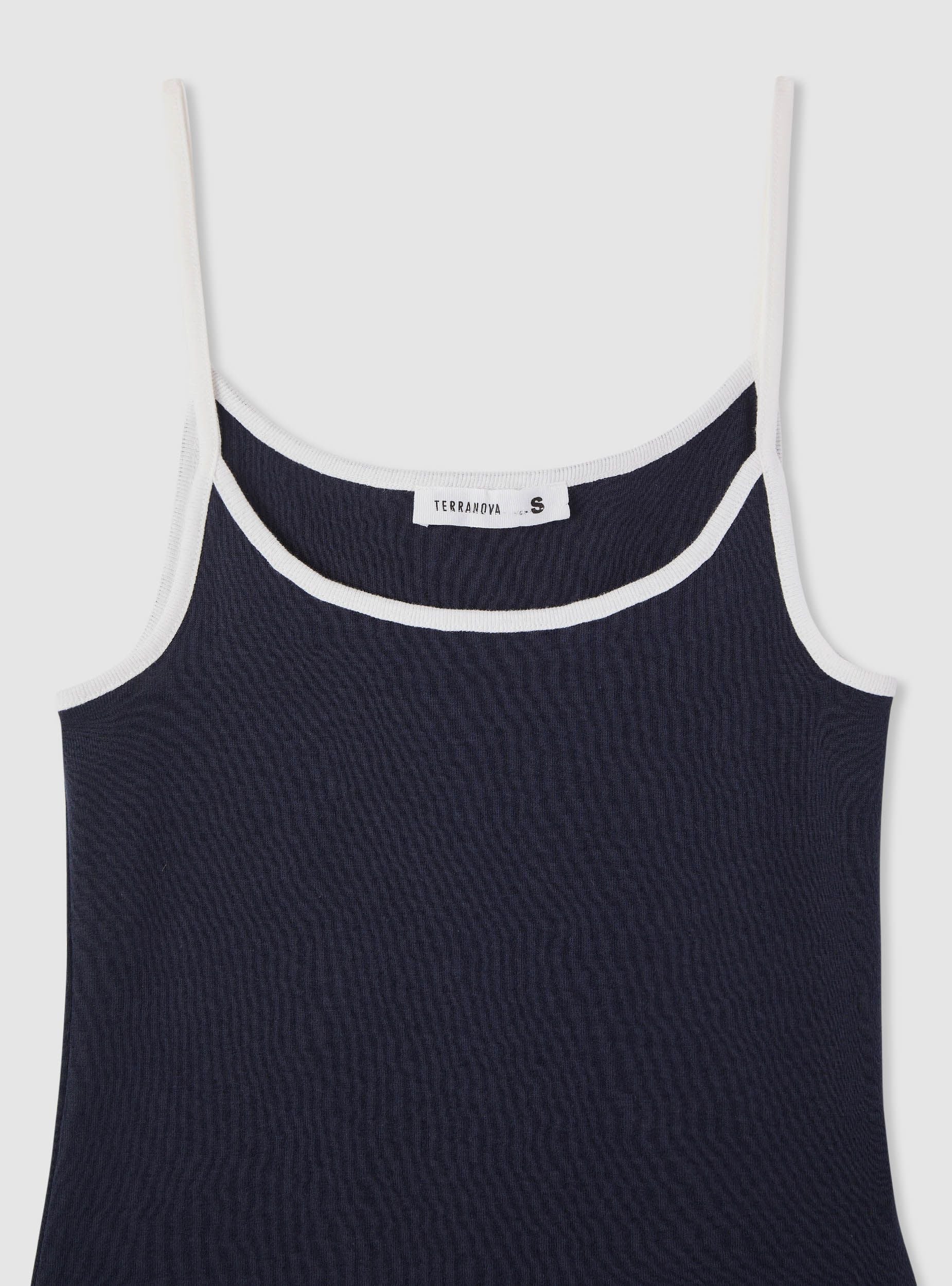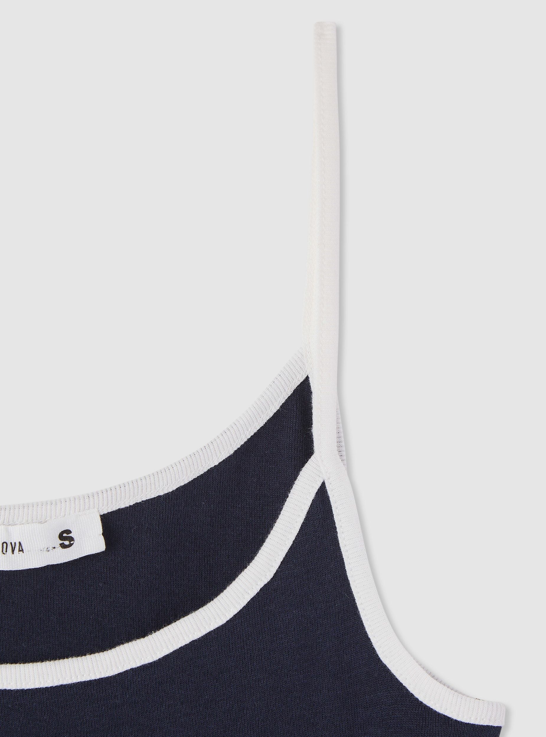 Top da donna a tinta unita con spalline sottili e bordi a contrasto. Vestibilità regular e lunghezza al punto vita, ideale per look casual e urban. Collo rotondo rifinito, silhouette pulita perfetta sotto camicie leggere o cardigan, oppure abbinata a jeans o pantaloncini per il tempo libero.Dettagli