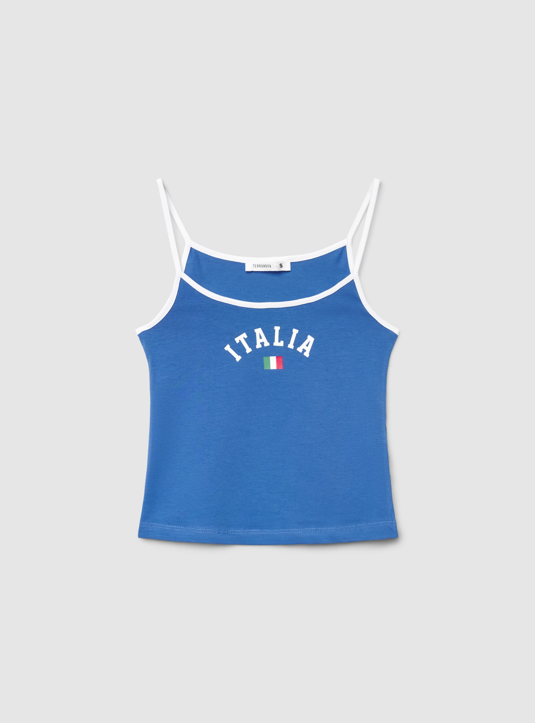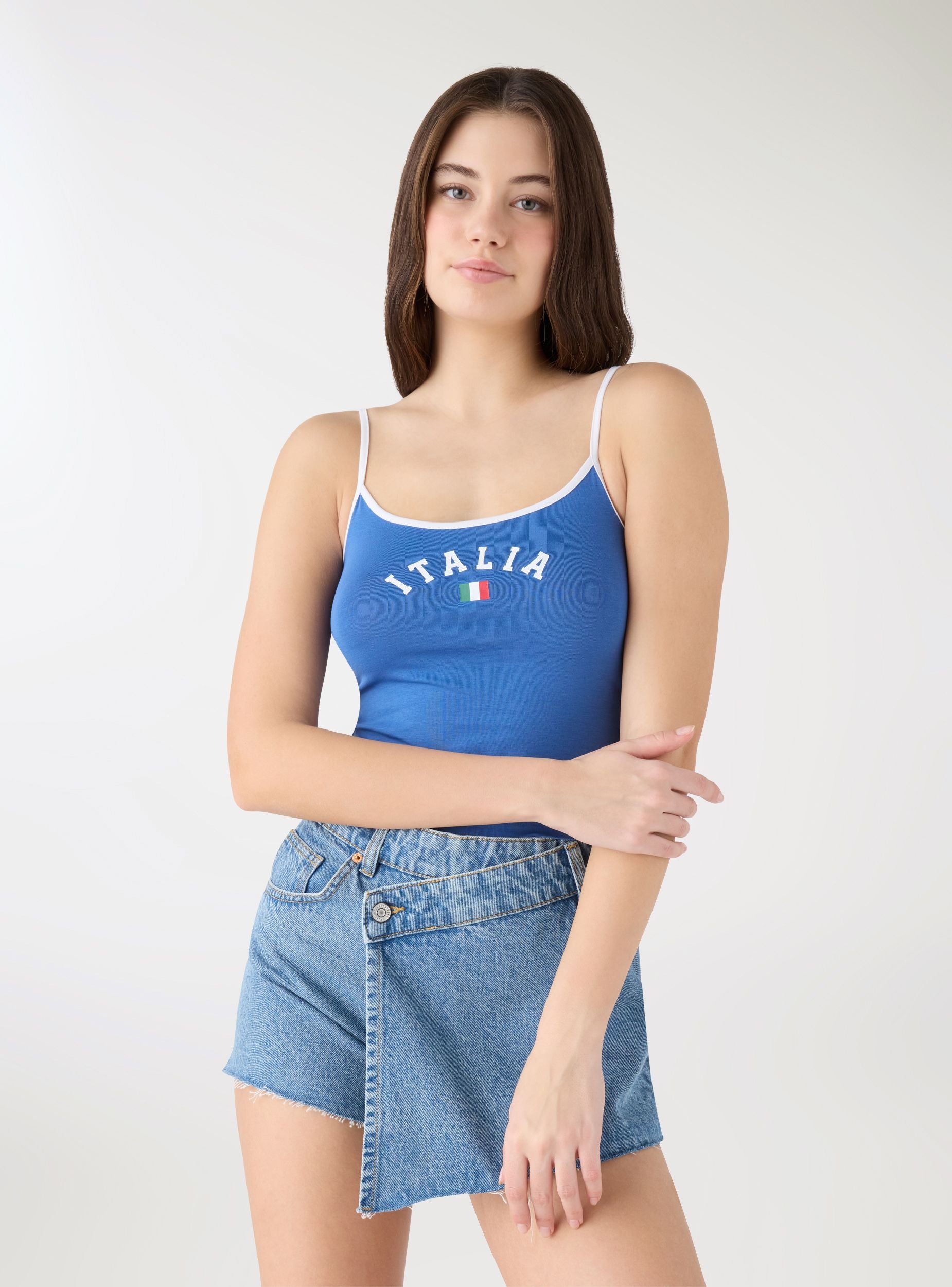 Canotta da donna con spalline sottili e profilo in contrasto, stampa frontale con scritta e bandiera. Linea aderente e lunghezza normale, ideale per look casual e sportivi. Perfetta con jeans, jorts o gonne in denim, si indossa da sola nelle giornate di sole oppure sotto camicie aperte e felpe leggere. Scollo arrotondato rifinito da bordino a vista che valorizza il design a tinta unita con scritta.Dettagli