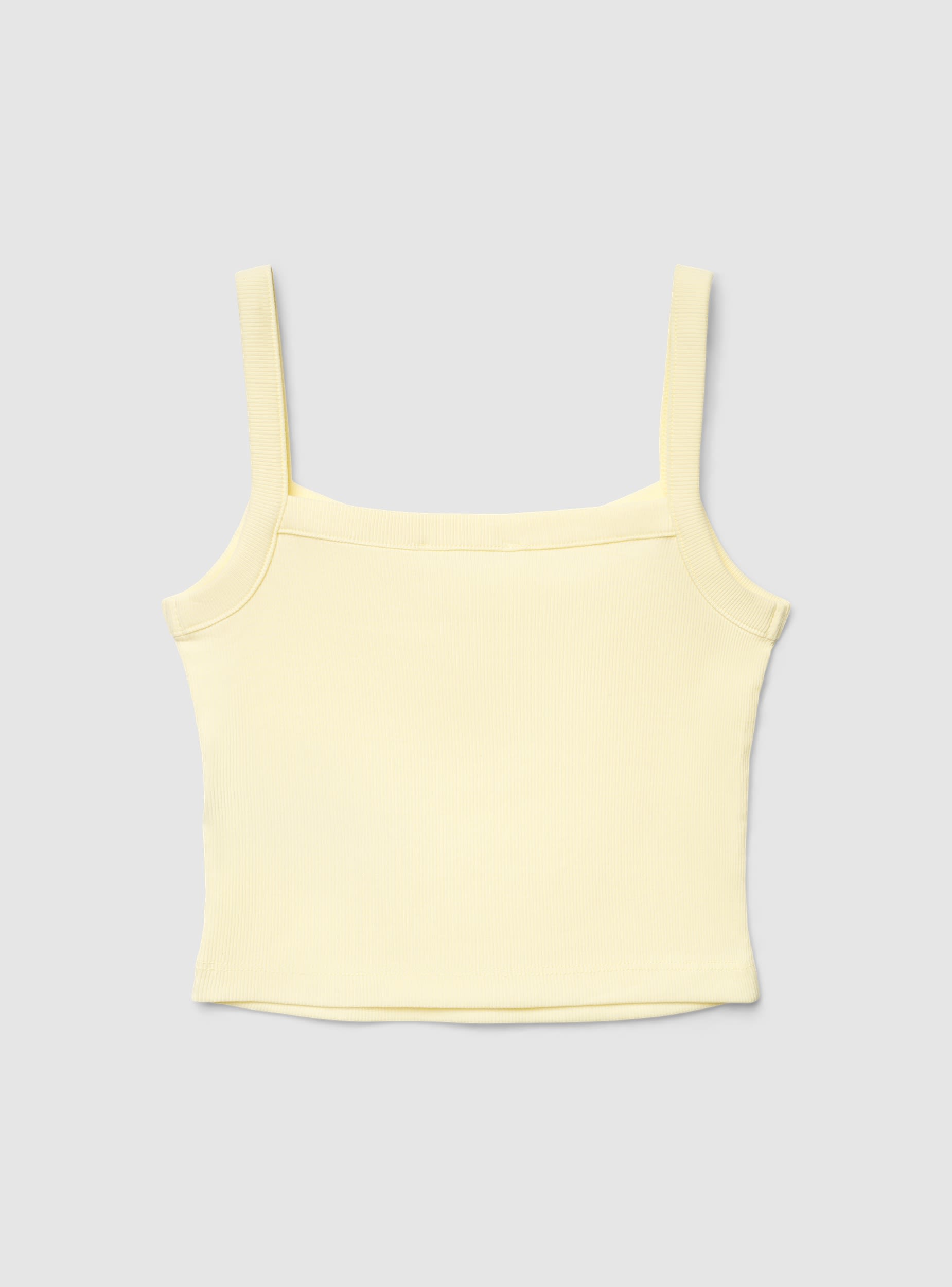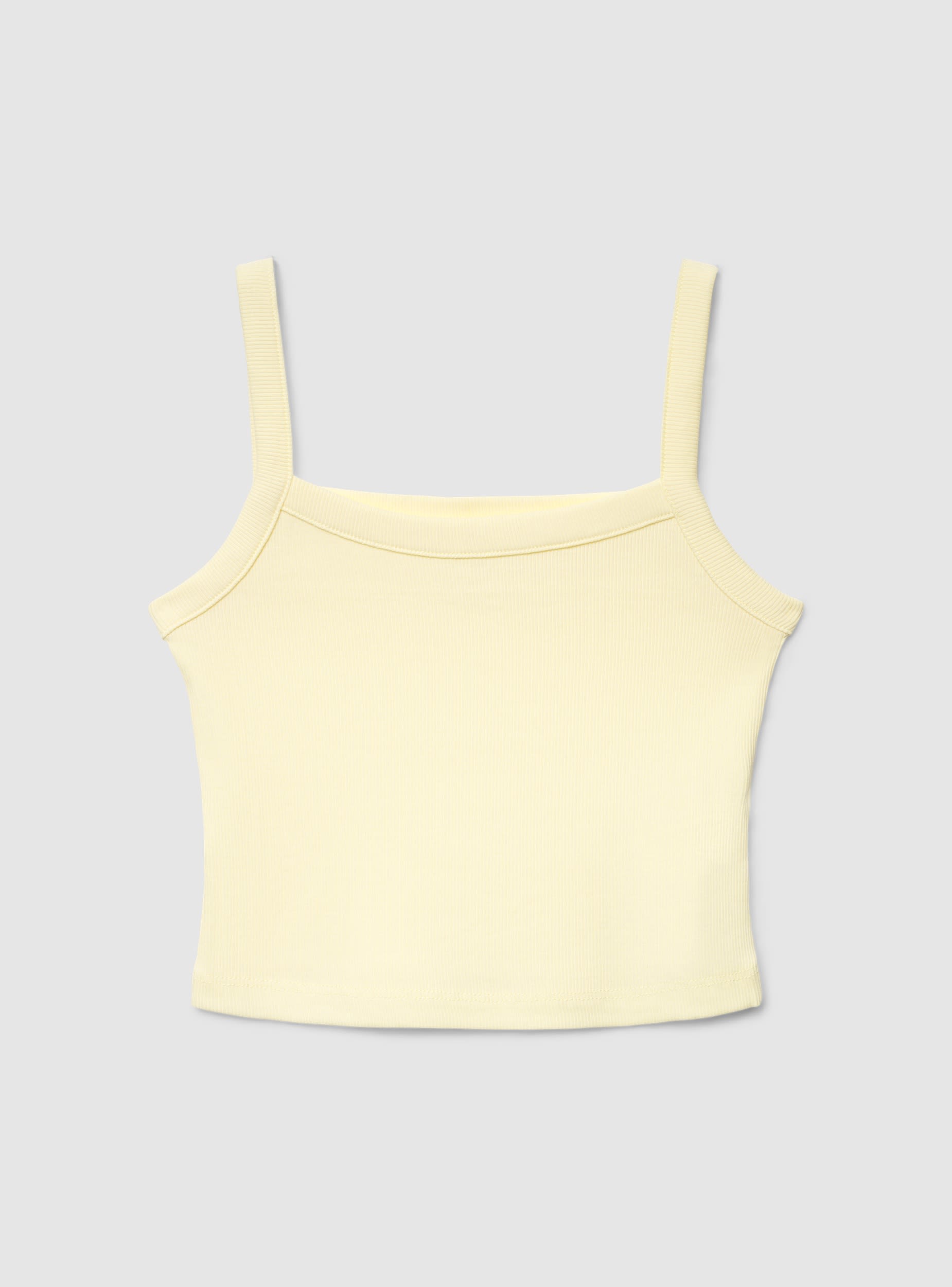 Canotta da donna con spalline sottili in tinta unita. Modello crop in maglia a costine che segue la figura senza costringere, ideale sotto camicie aperte, blazer o con pantaloncini e jeans a vita alta. Scollo dritto e bordi rifiniti, senza chiusure. Versatile per il tempo libero o per look a strati nelle mezze stagioniDettagli