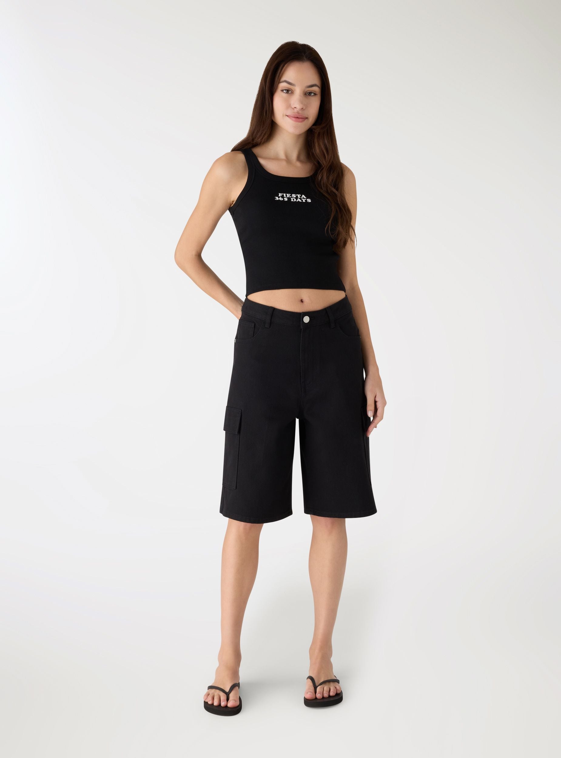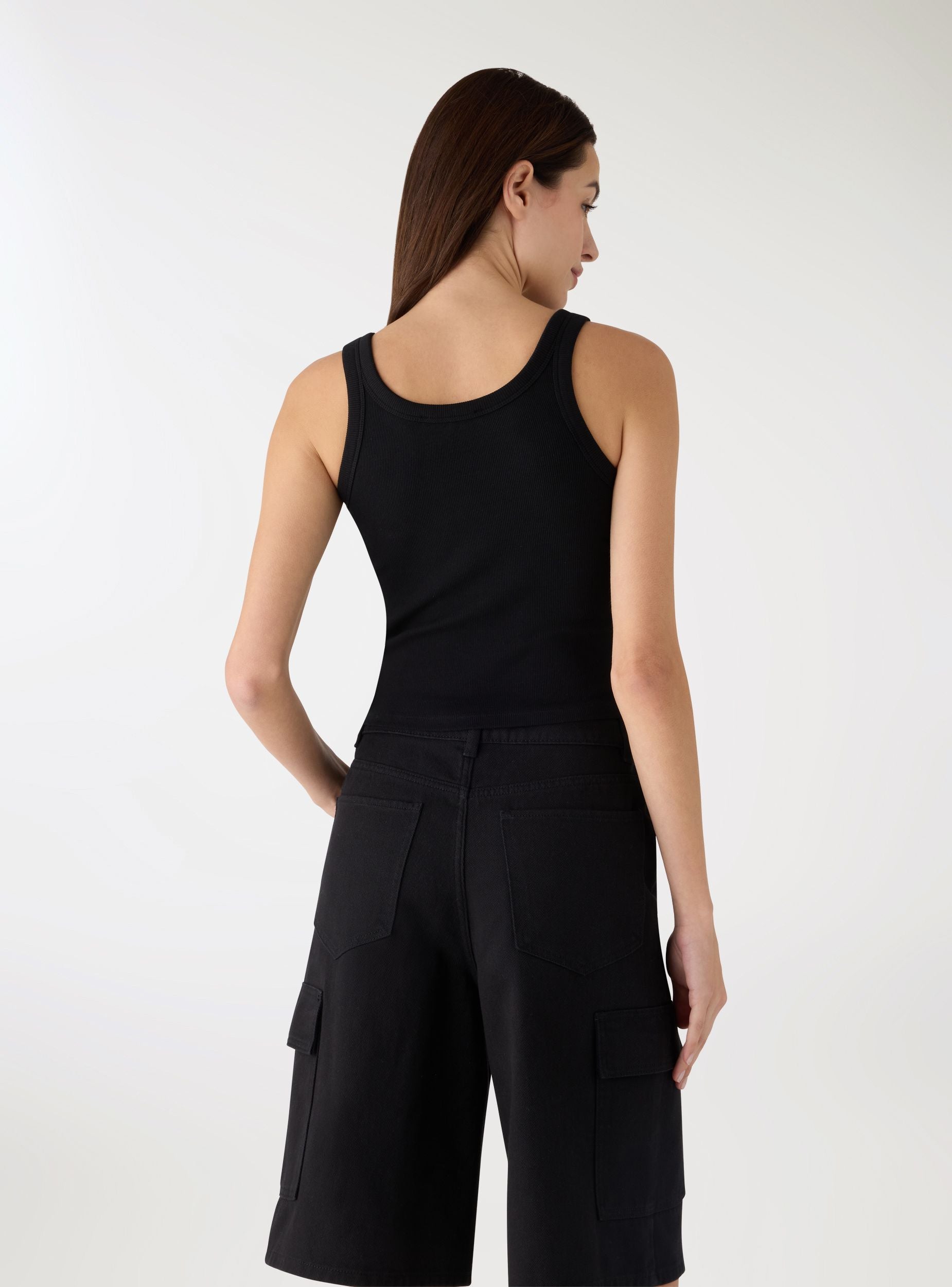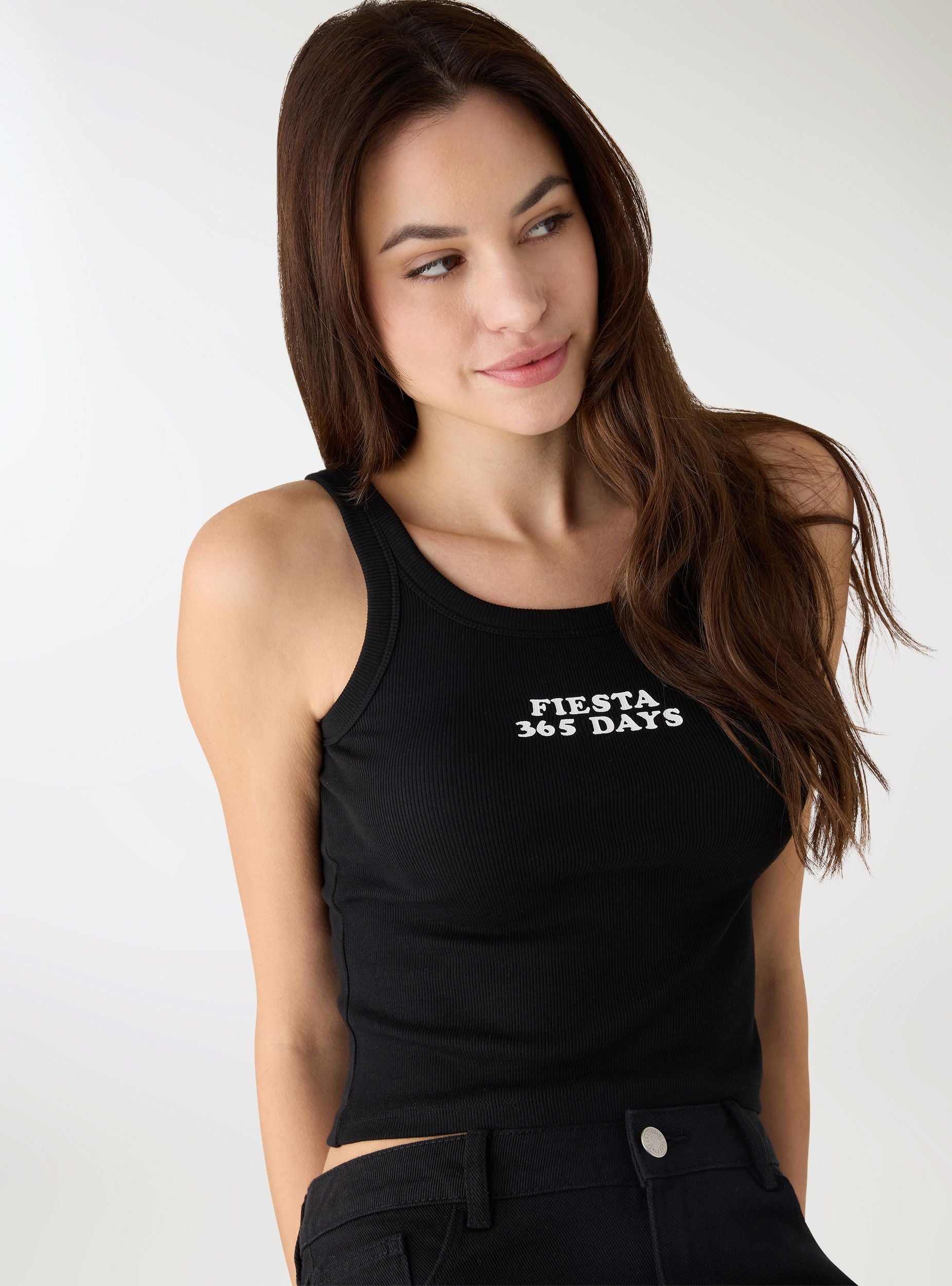 Canotta da donna in tinta unita con scritta frontale a contrasto. Il modello aderente valorizza la figura e si presta a look casual con jeans, cargo o shorts. Presenta scollo tondo profondo e spalline larghe, ideale per la stagione calda o per sovrapposizioni con camicie aperte. Il design minimal con stampa testuale aggiunge un tocco grintoso, perfetto per il tempo libero e l’uso quotidiano.Dettagli