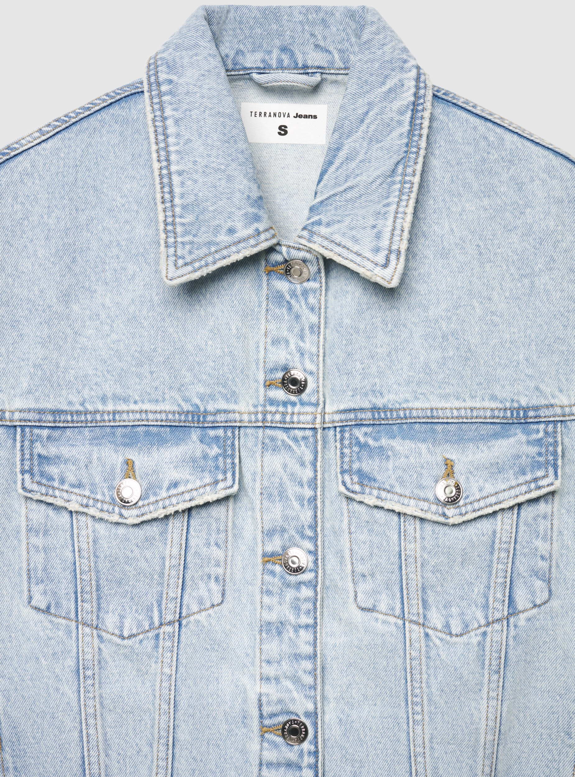 Giubbino in denim da donna in tinta unita, vestibilità over e lunghezza normale. Collo a camicia, maniche lunghe e chiusura frontale con bottoni metallici. Presenta tasche sul petto con pattina e tasche laterali a filo. Perfetta per look casual e urban, da abbinare a maglietta e jeans o a vestiti midi per uno stile rilassato. Ideale per la mezza stagione e per sovrapposizioni dinamiche.Dettagli