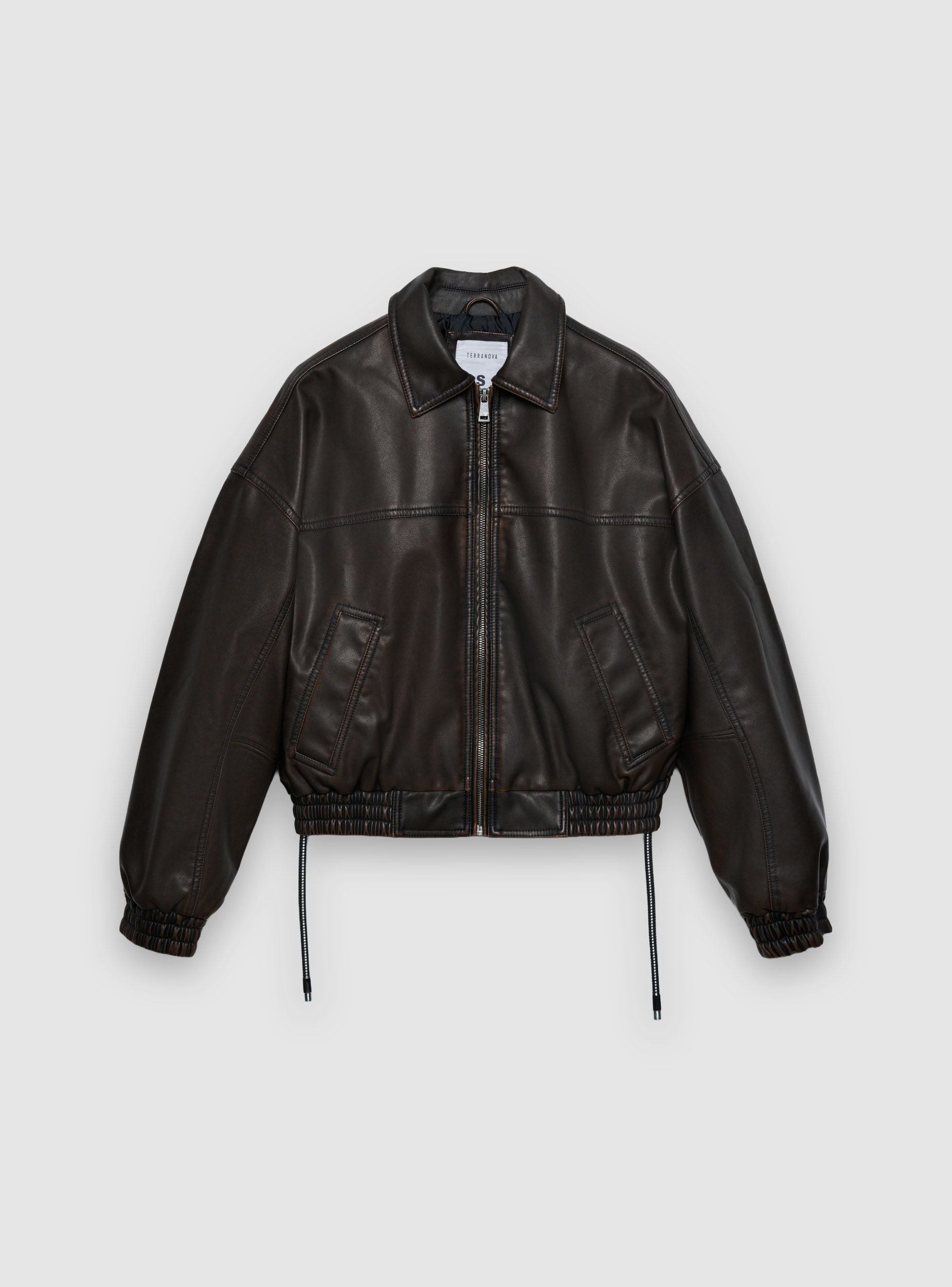 Giubbotto da donna in similpelle dallo stile bomber. Colletto a camicia, maniche lunghe e chiusura frontale con zip. Fondo e polsini elasticizzati con dettaglio arricciato, ideale per creare look urbani con jeans o pantaloni a vita alta. Tasche laterali per praticità. Vestibilità regular, perfetta per abbinamenti a strati nelle mezze stagioni.Dettagli