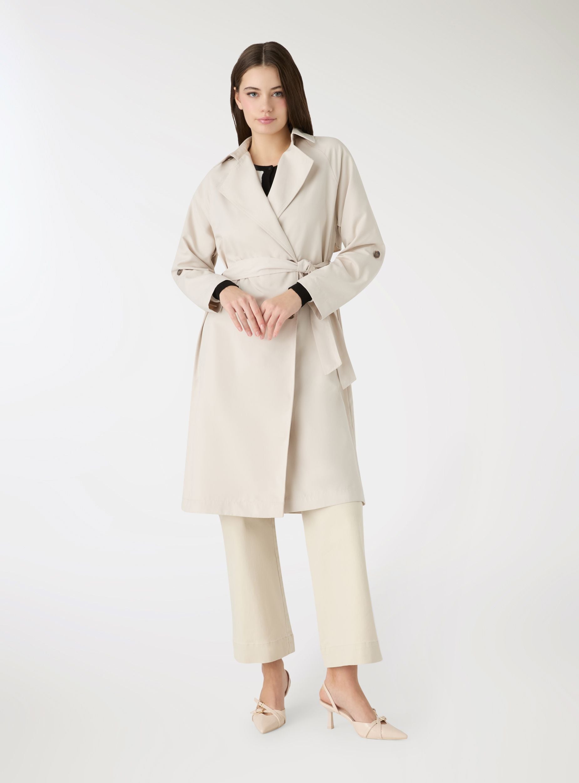 Cappotto da donna in tinta unita dallo stile trench. Modello doppiopetto con ampi revers e cintura da annodare in vita per definire la vestibilità. Maniche lunghe con linguette a bottone e spacco posteriore con pattina antivento. Tasche laterali per praticità. Ideale su outfit da ufficio o per il tempo libero, si abbina a jeans, pantaloni sartoriali o abiti midi per uno stile urbano curato.Dettagli