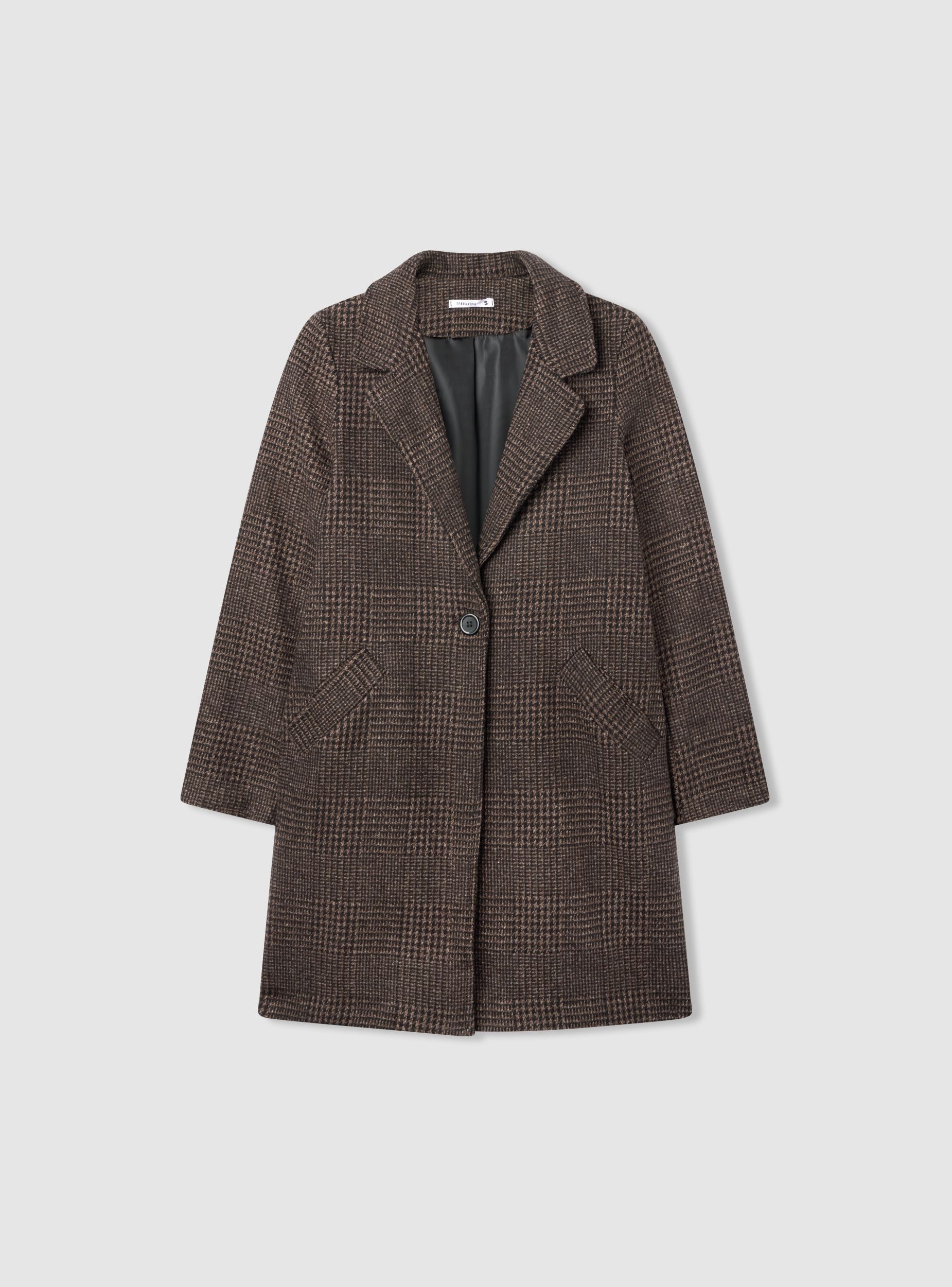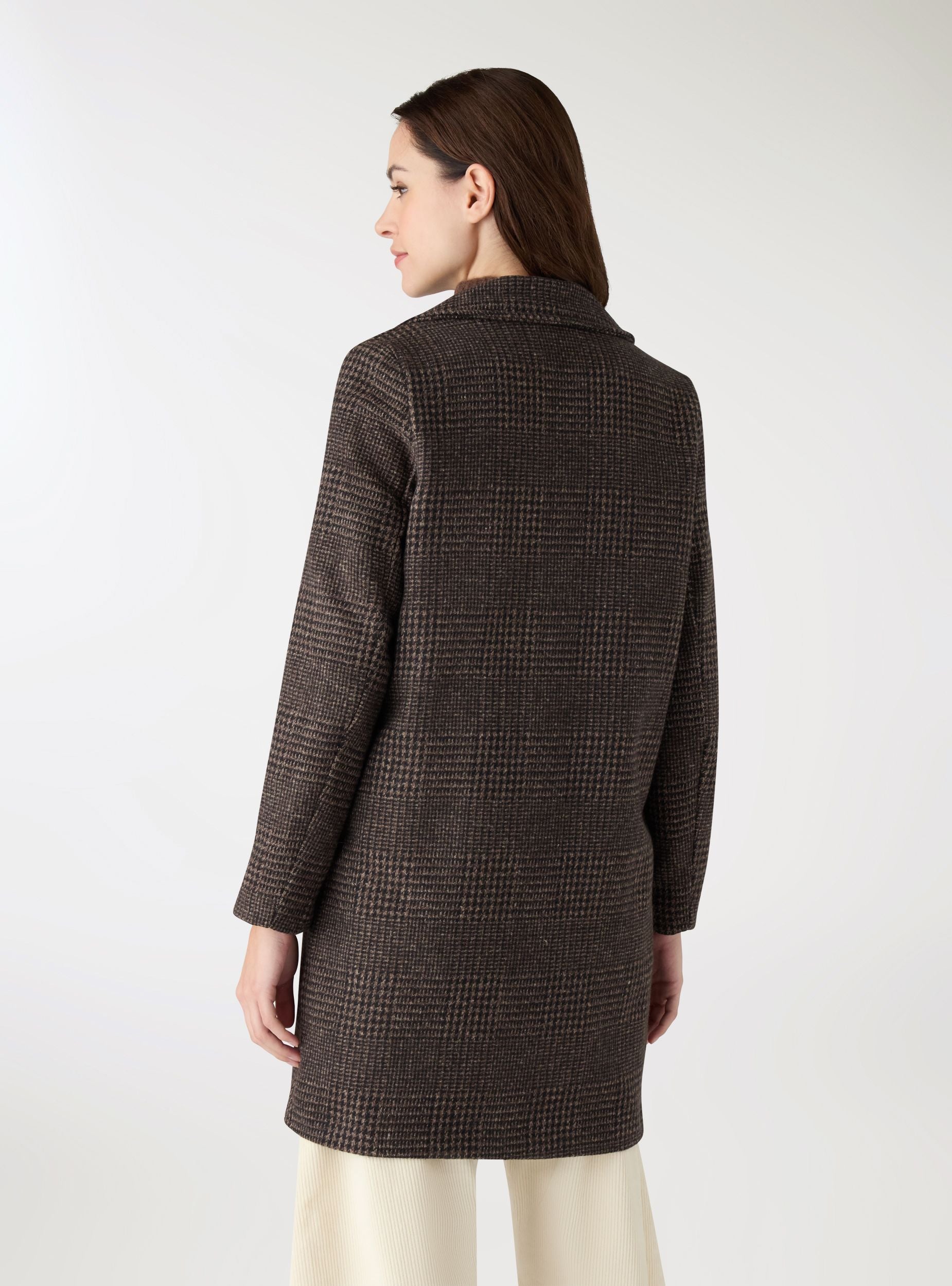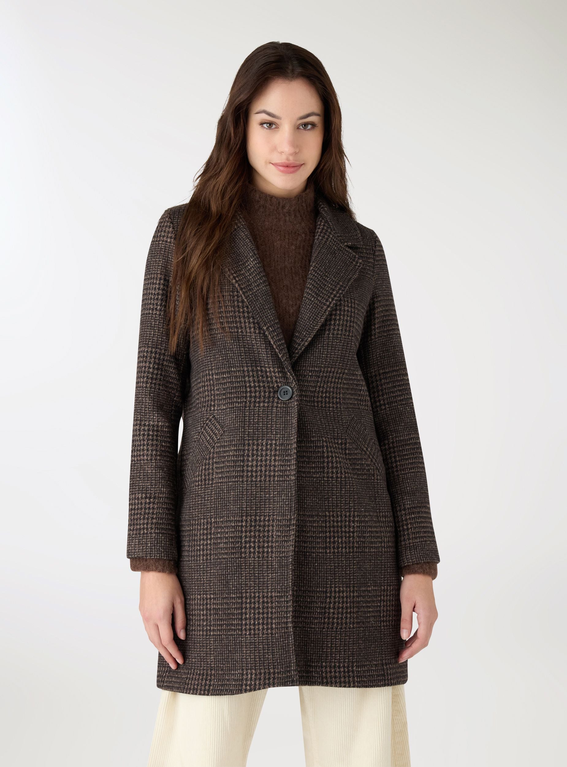 Cappotto da donna in fantasia a quadri, modello monopetto. Linea regolare con chiusura a un bottone e revers ampi, maniche lunghe e fodera interna. Tasche frontali inclinate a filetto per tenere l’essenziale. Ideale per il quotidiano in città e per l’ufficio, si abbina a jeans e stivaletti o a pantaloni sartoriali.Dettagli