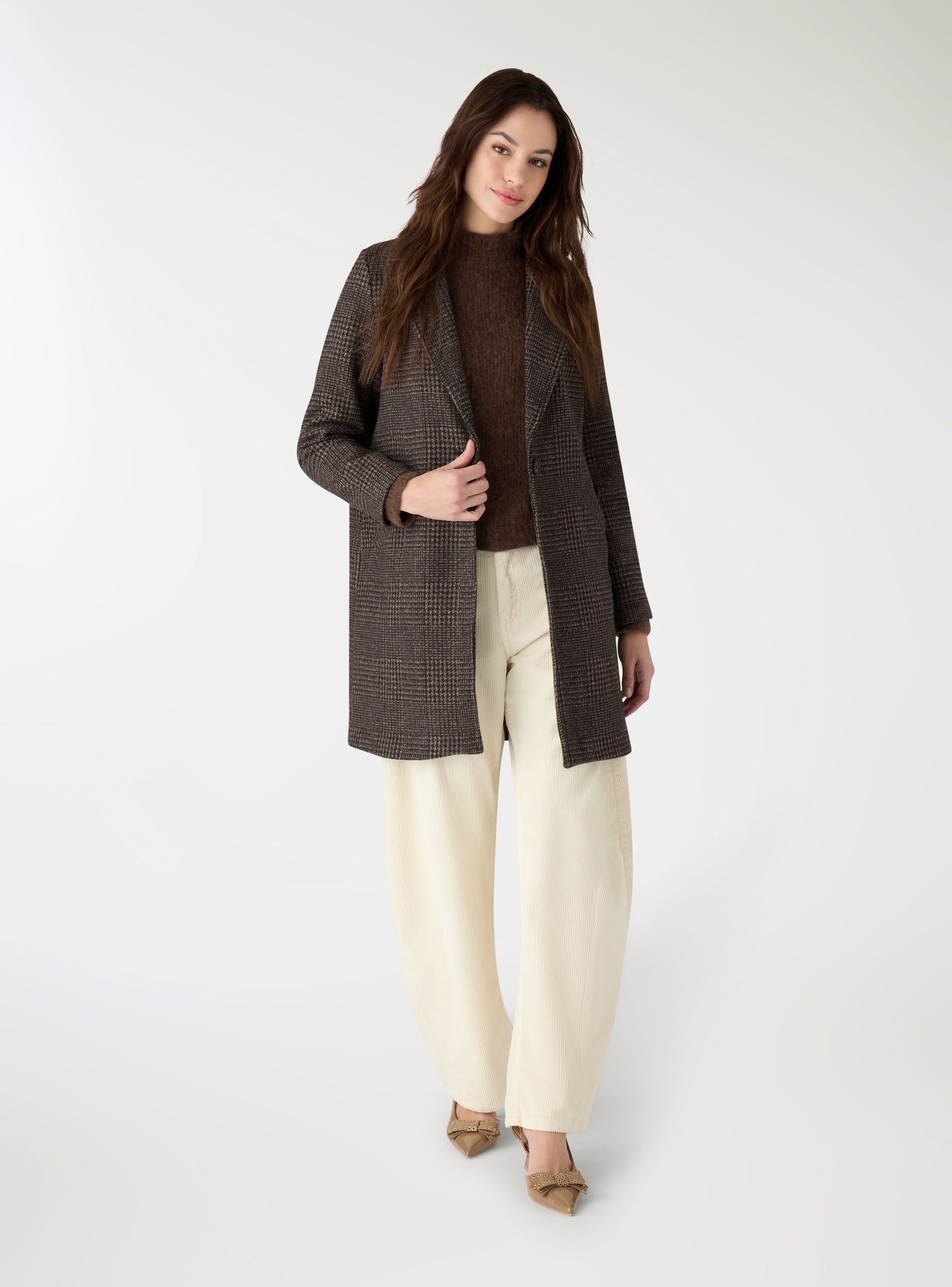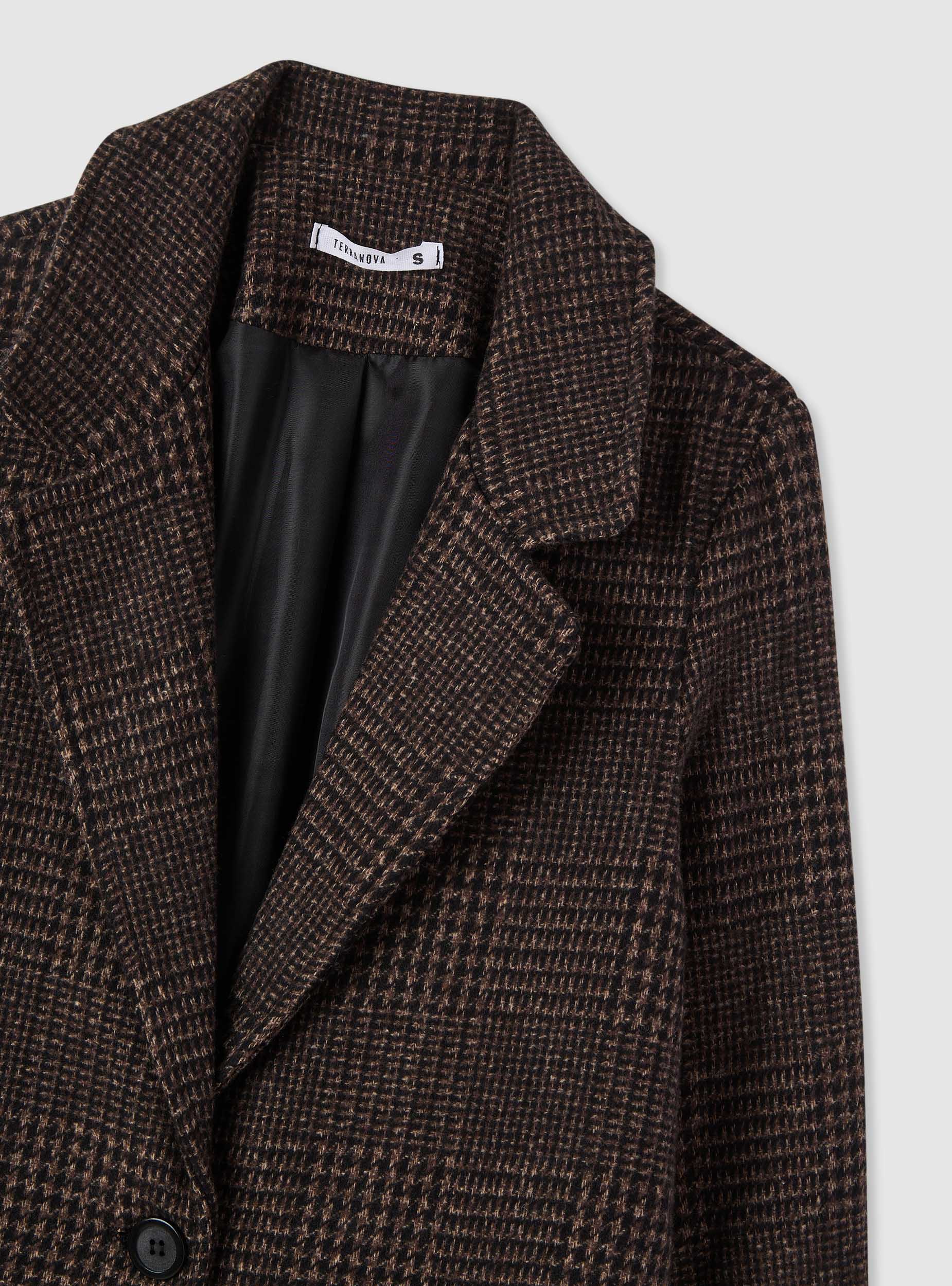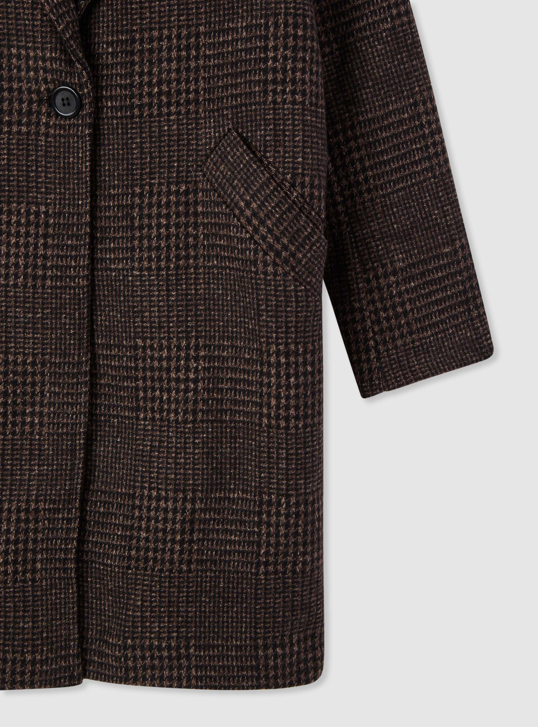 Cappotto da donna in fantasia a quadri, modello monopetto. Linea regolare con chiusura a un bottone e revers ampi, maniche lunghe e fodera interna. Tasche frontali inclinate a filetto per tenere l’essenziale. Ideale per il quotidiano in città e per l’ufficio, si abbina a jeans e stivaletti o a pantaloni sartoriali.Dettagli