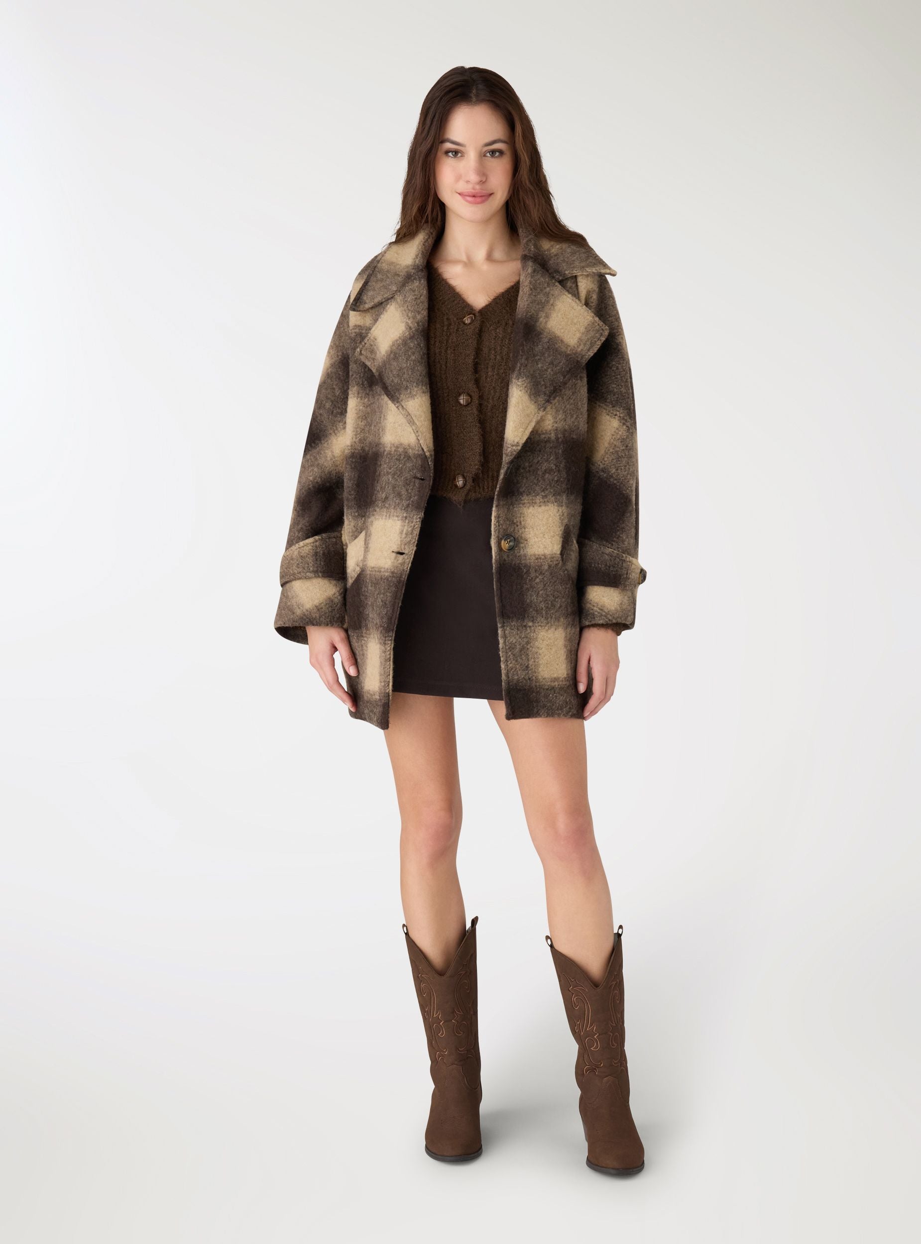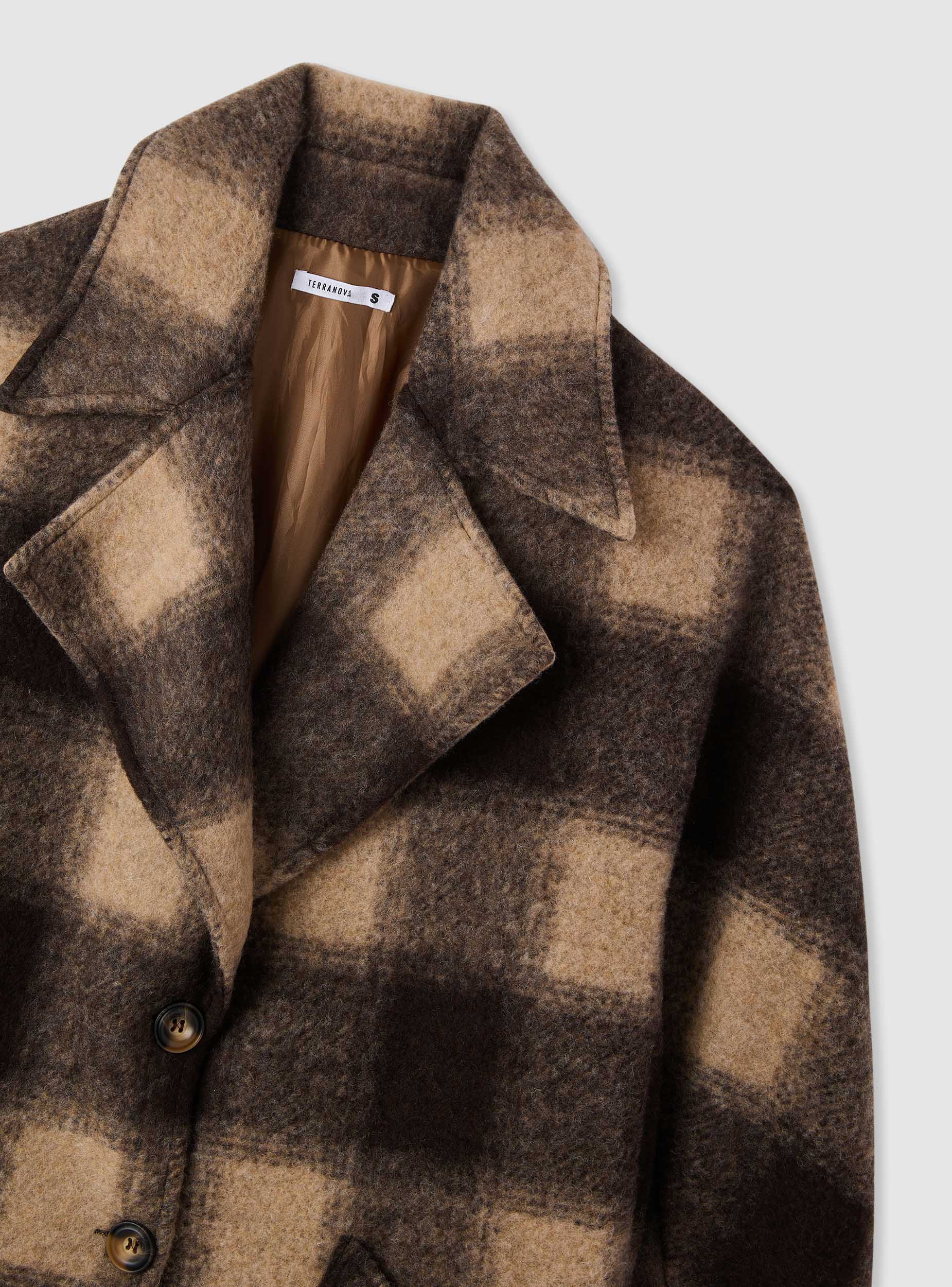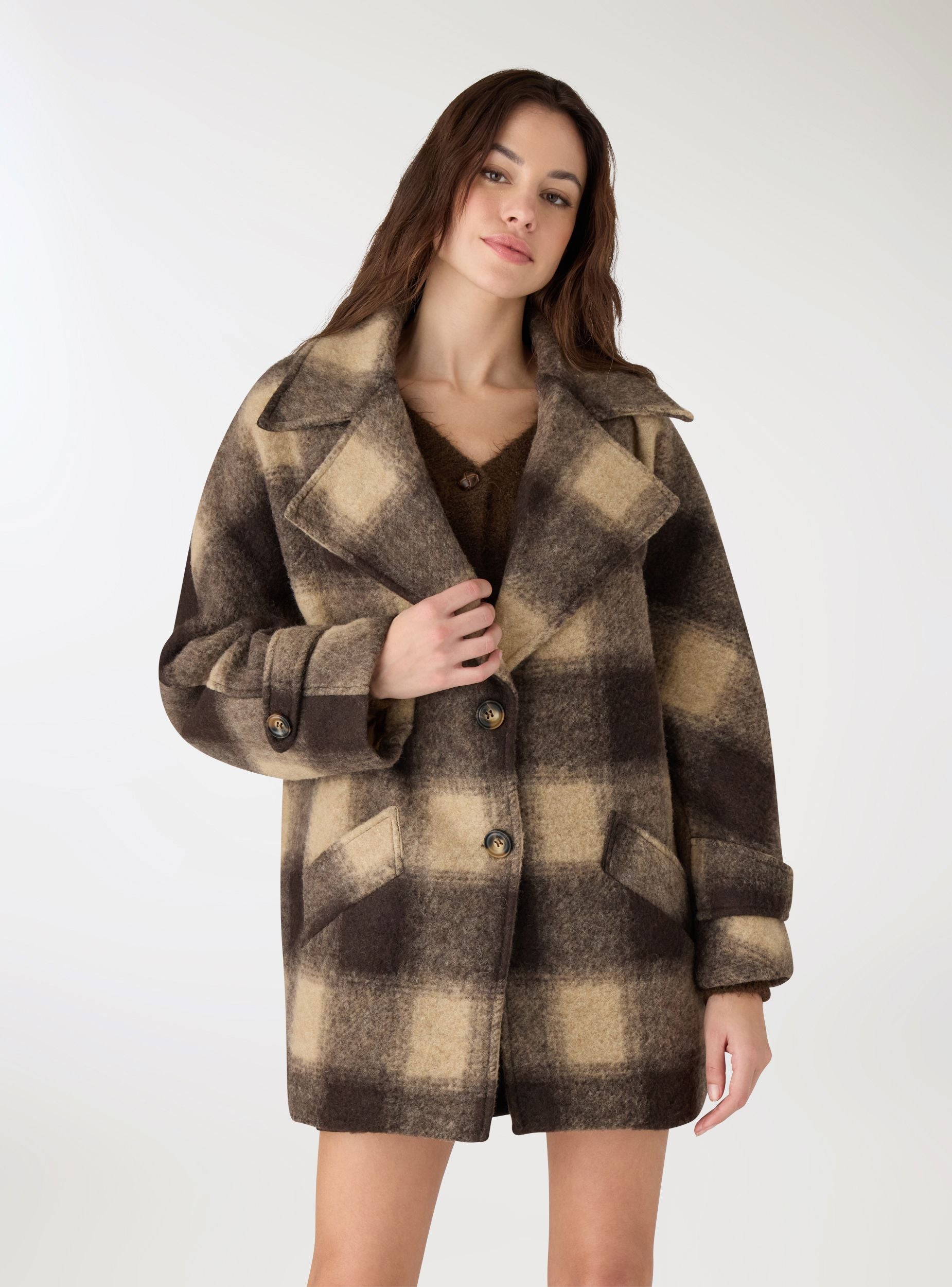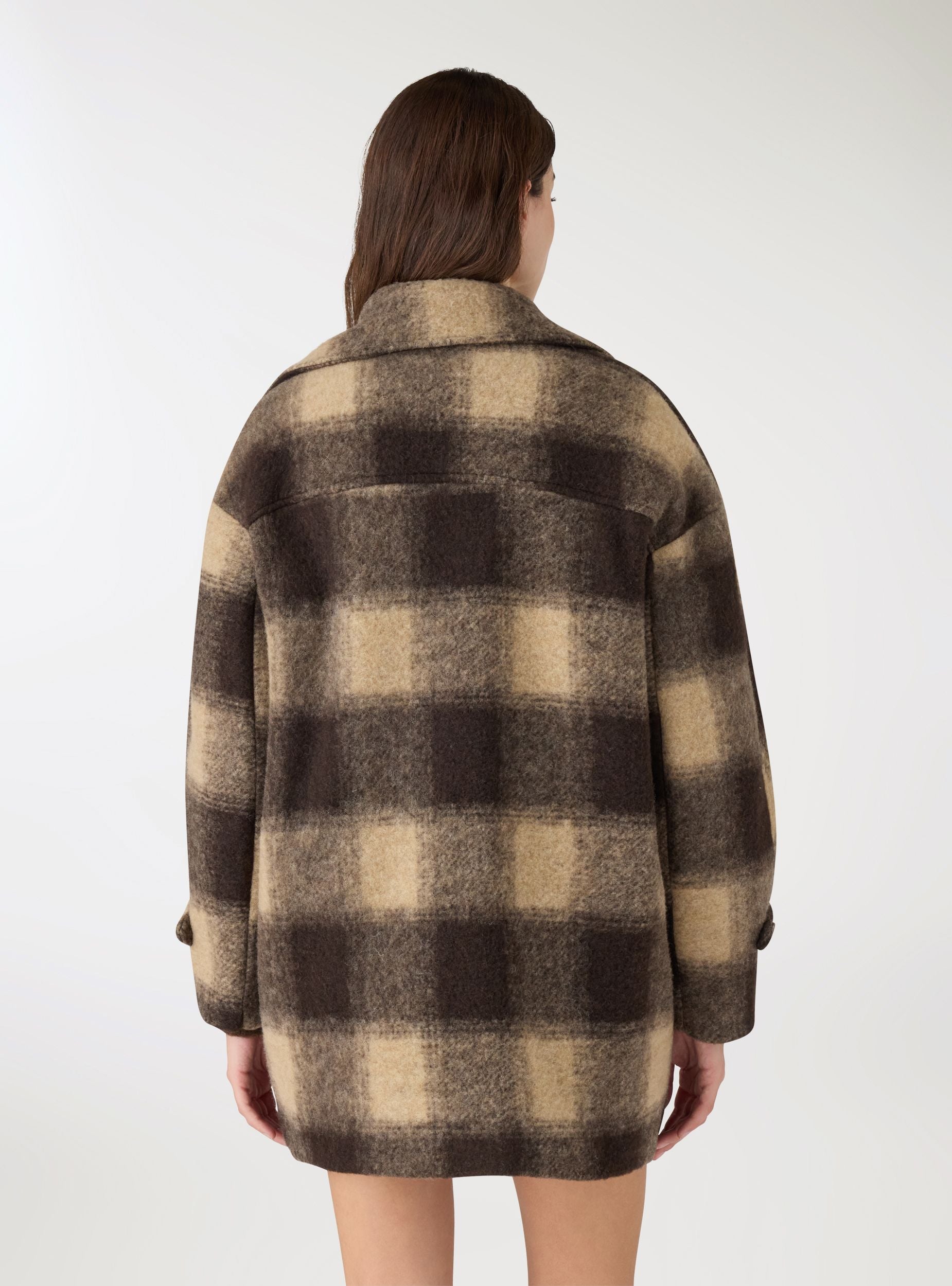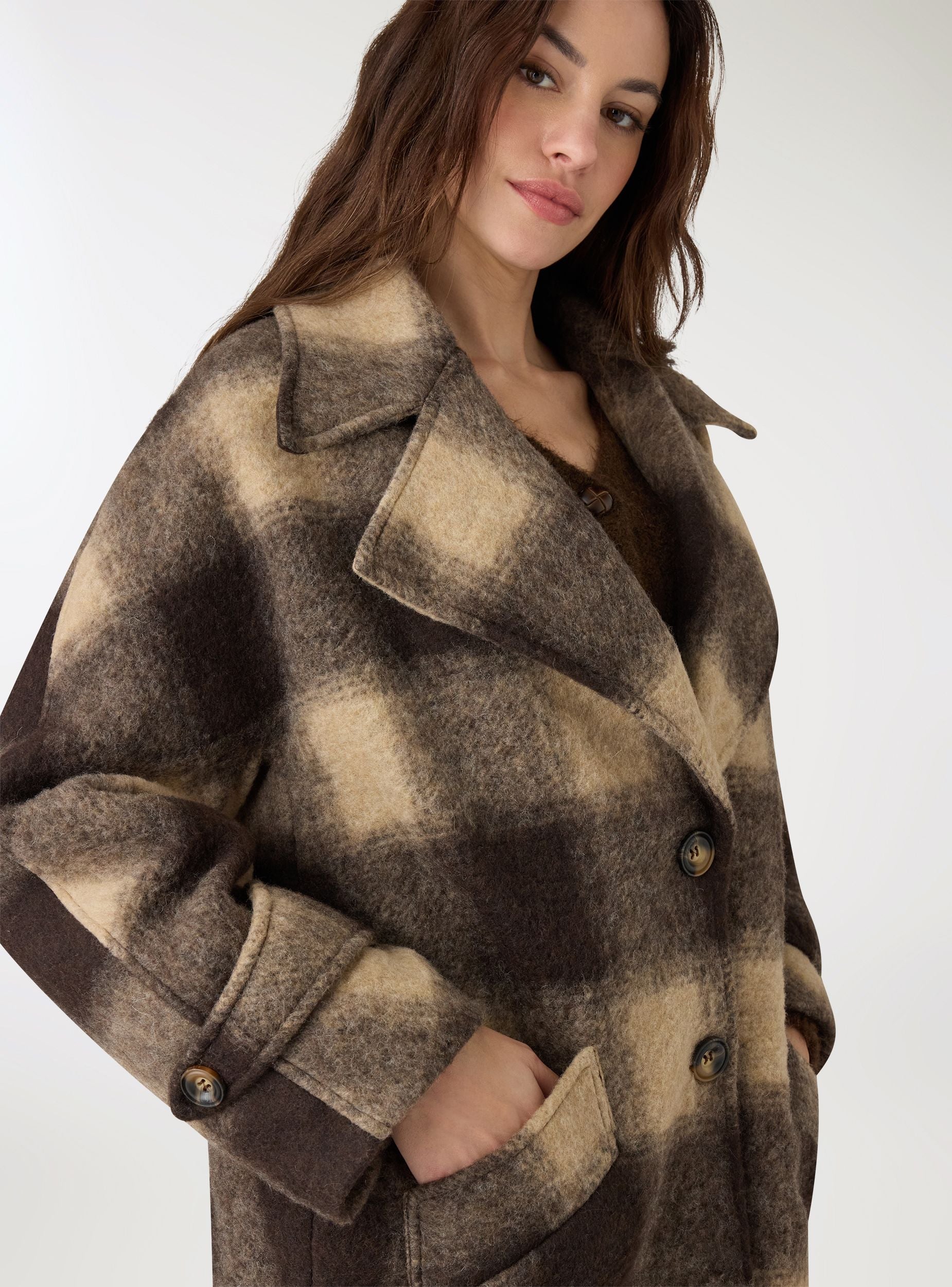 Cappotto da donna dal taglio over a quadri, ideale per look casual e cittadini. Collo con revers ampi, chiusura frontale con bottoni e maniche lunghe con dettaglio martingala. Tasche frontali a pattina per portare l’essenziale. Lunghezza a metà coscia perfetta su jeans e stivali o su abiti midi per un contrasto di volumi. Foderato internamente per maggiore comfort nelle giornate fredde.Dettagli