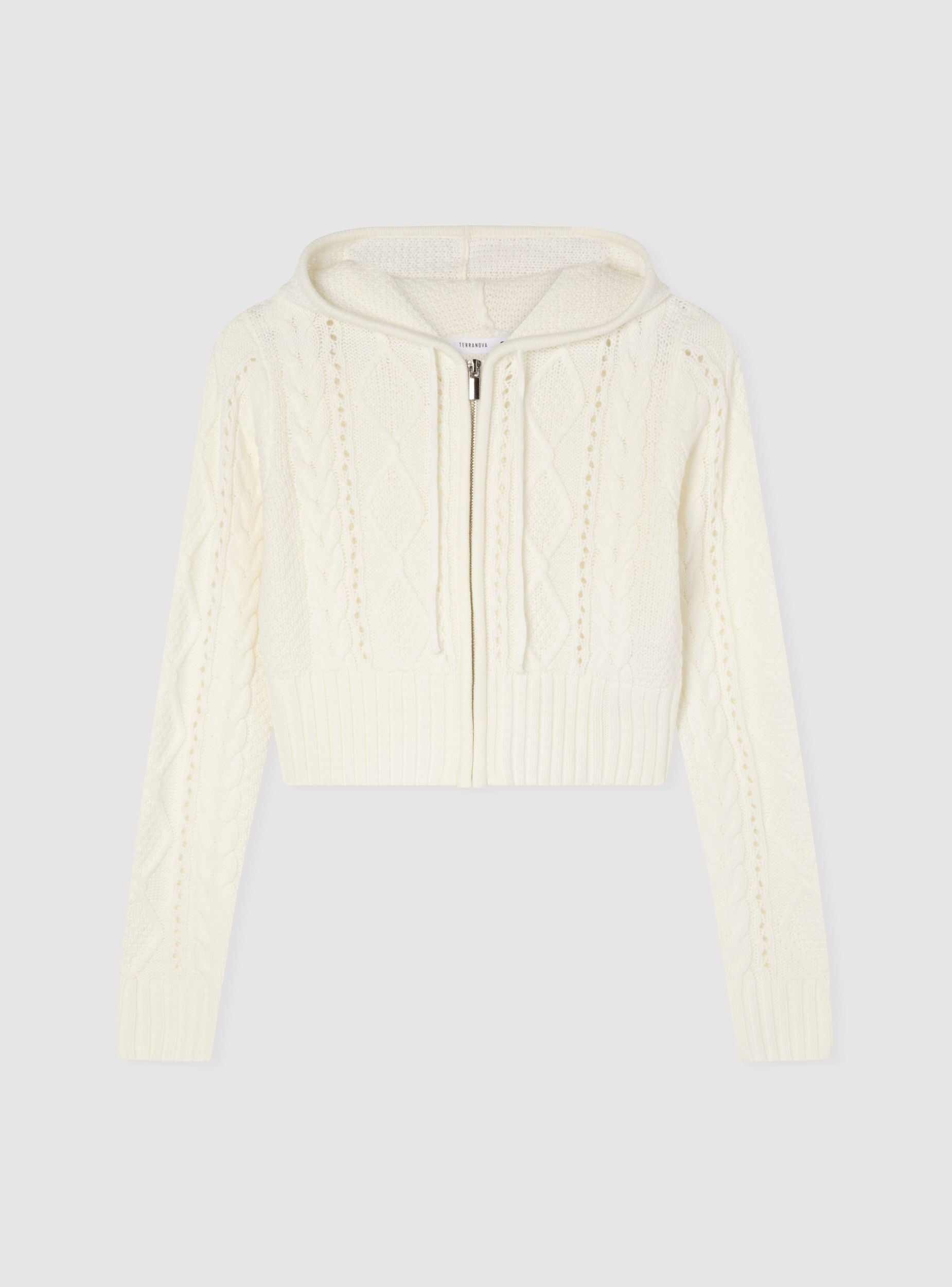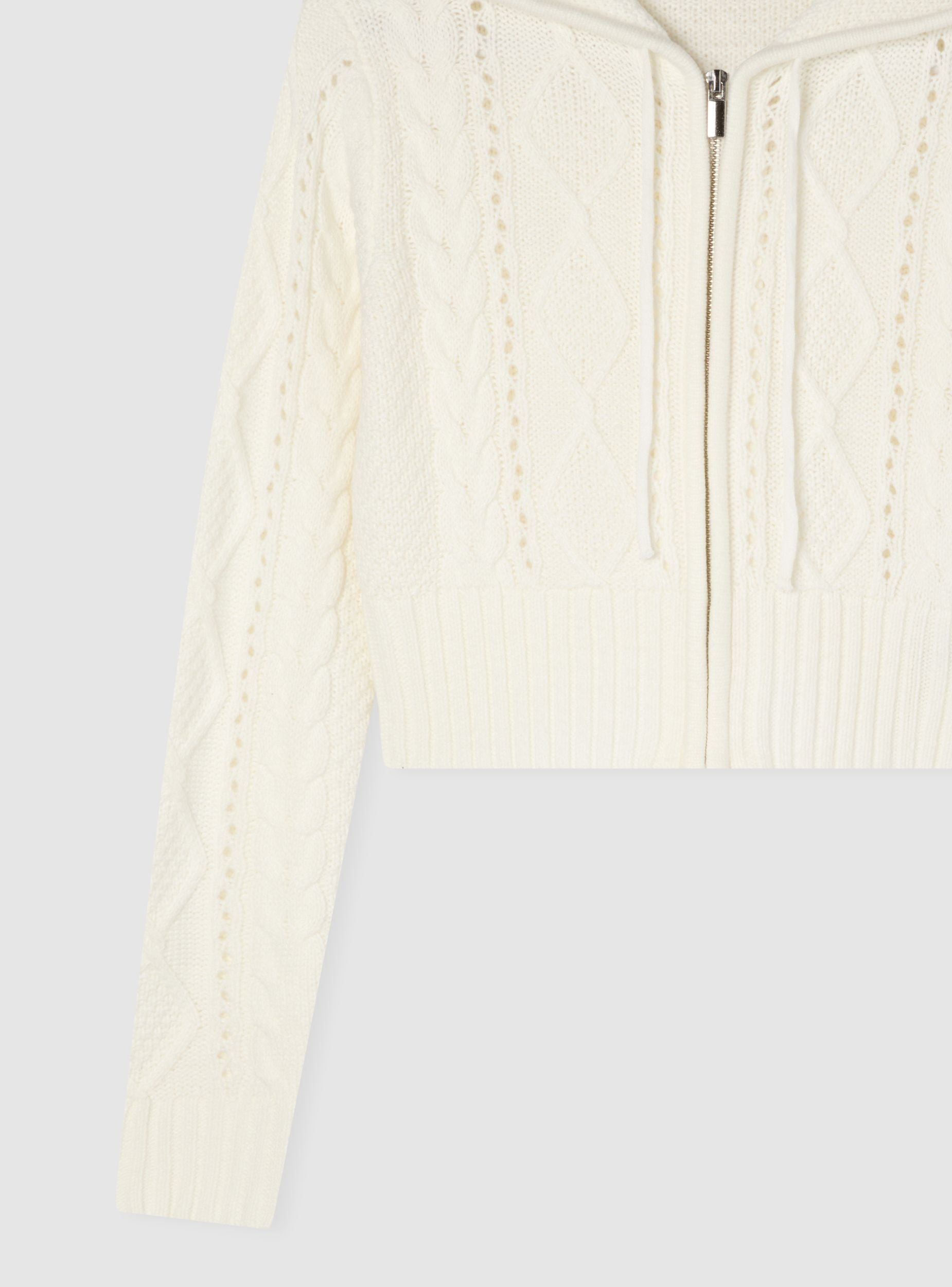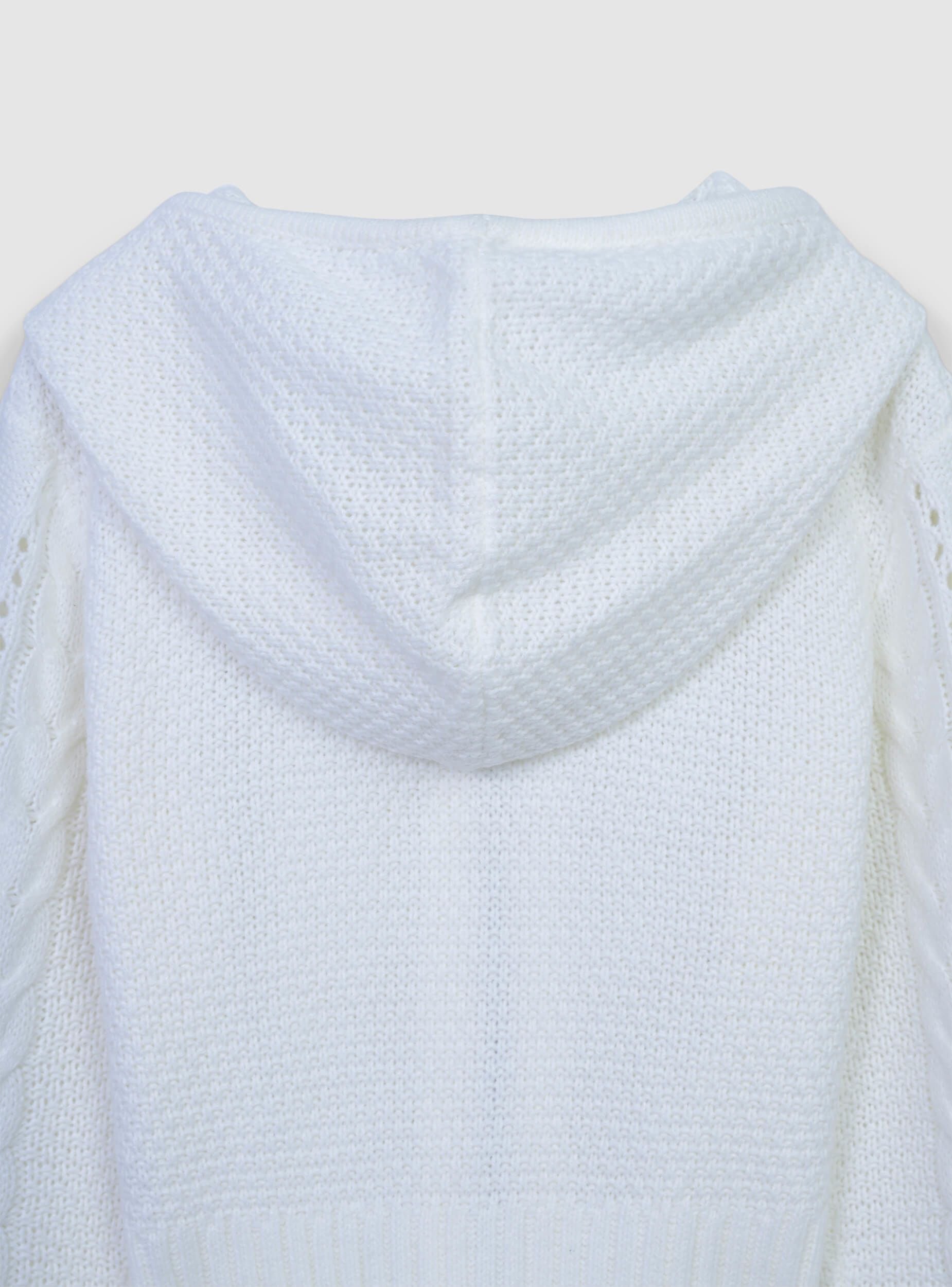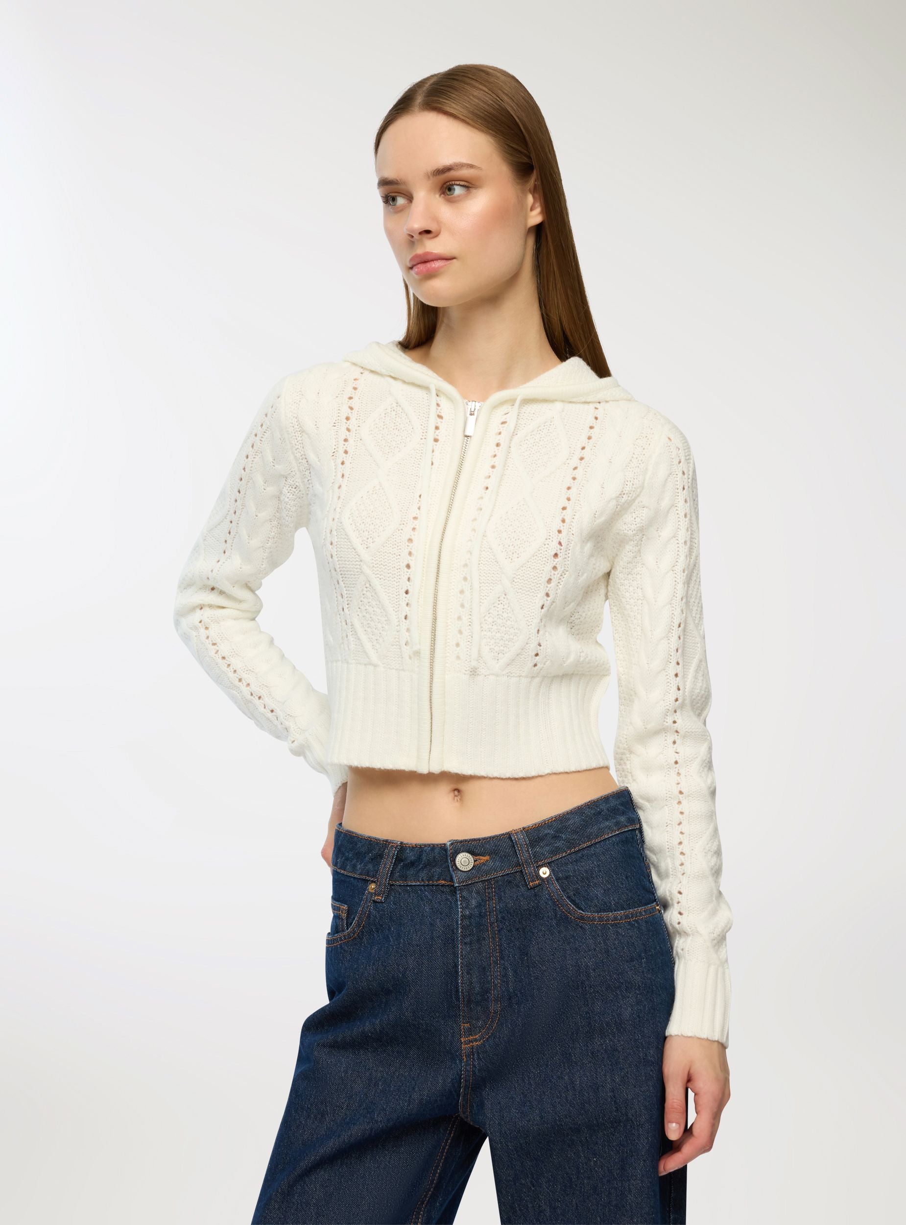 Cardigan da donna ideale per look casual e versatili. Il modello presenta una lavorazione a trecce su tutta la superficie, cappuccio ampio e chiusura frontale con zip. Le maniche lunghe e il fondo a costine donano comfort, mentre il design senza tempo si abbina facilmente a jeans o pantaloni per outfit quotidiani o rilassati. Design a tinta unita.Dettagli