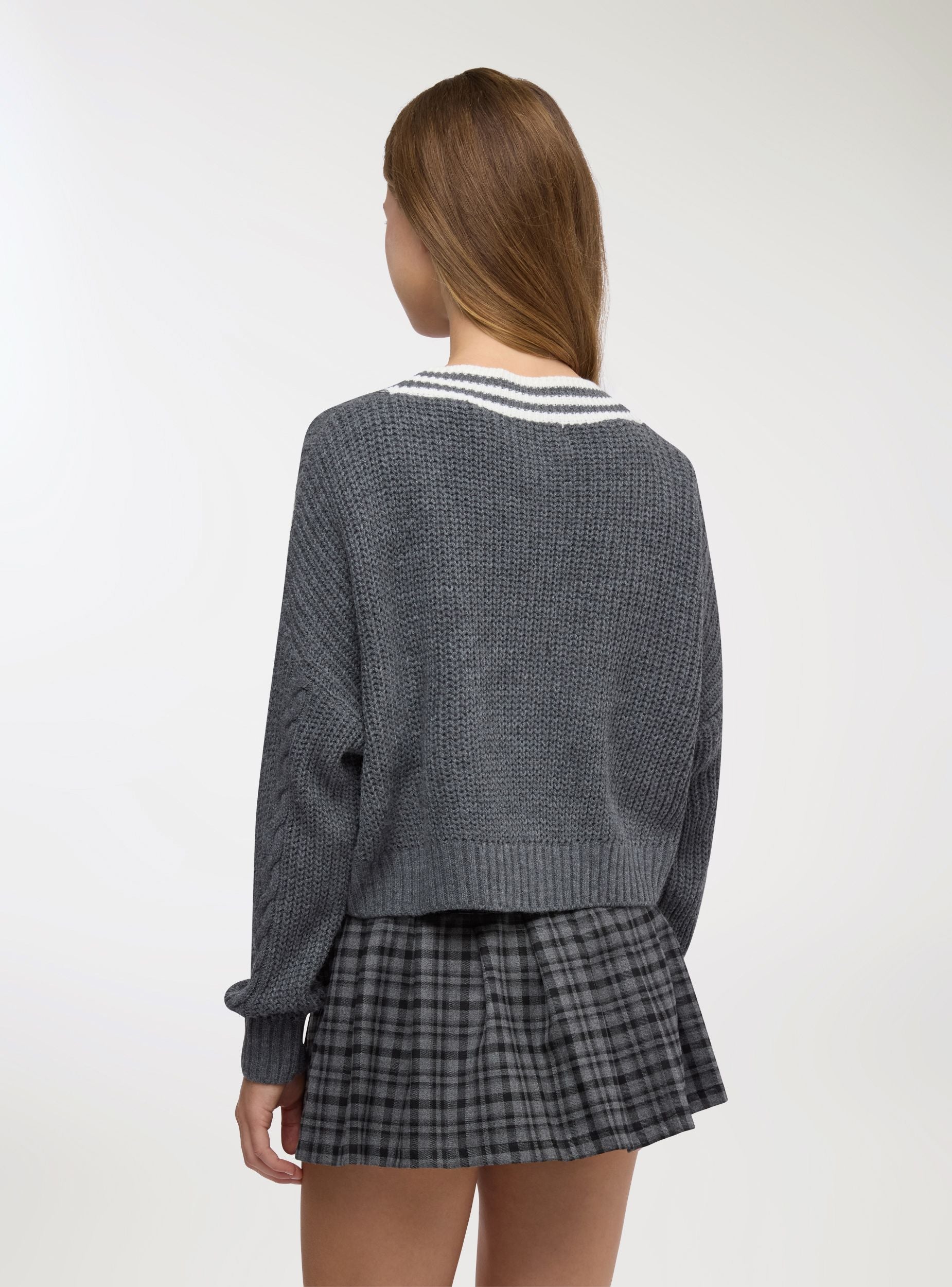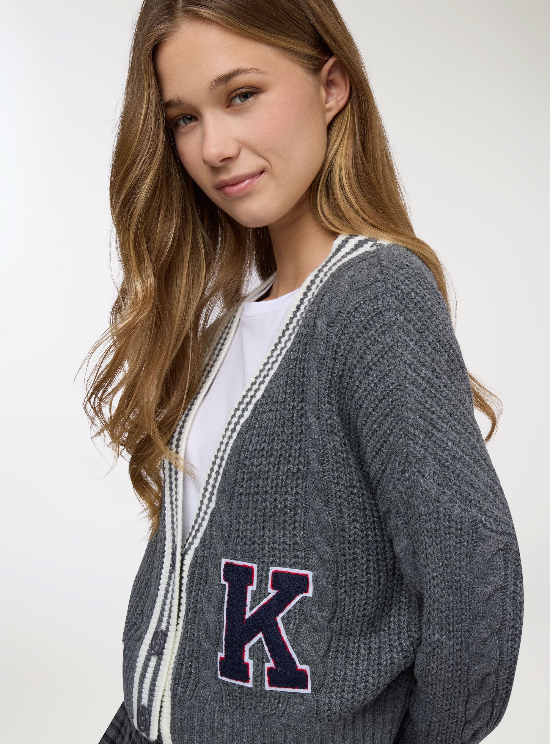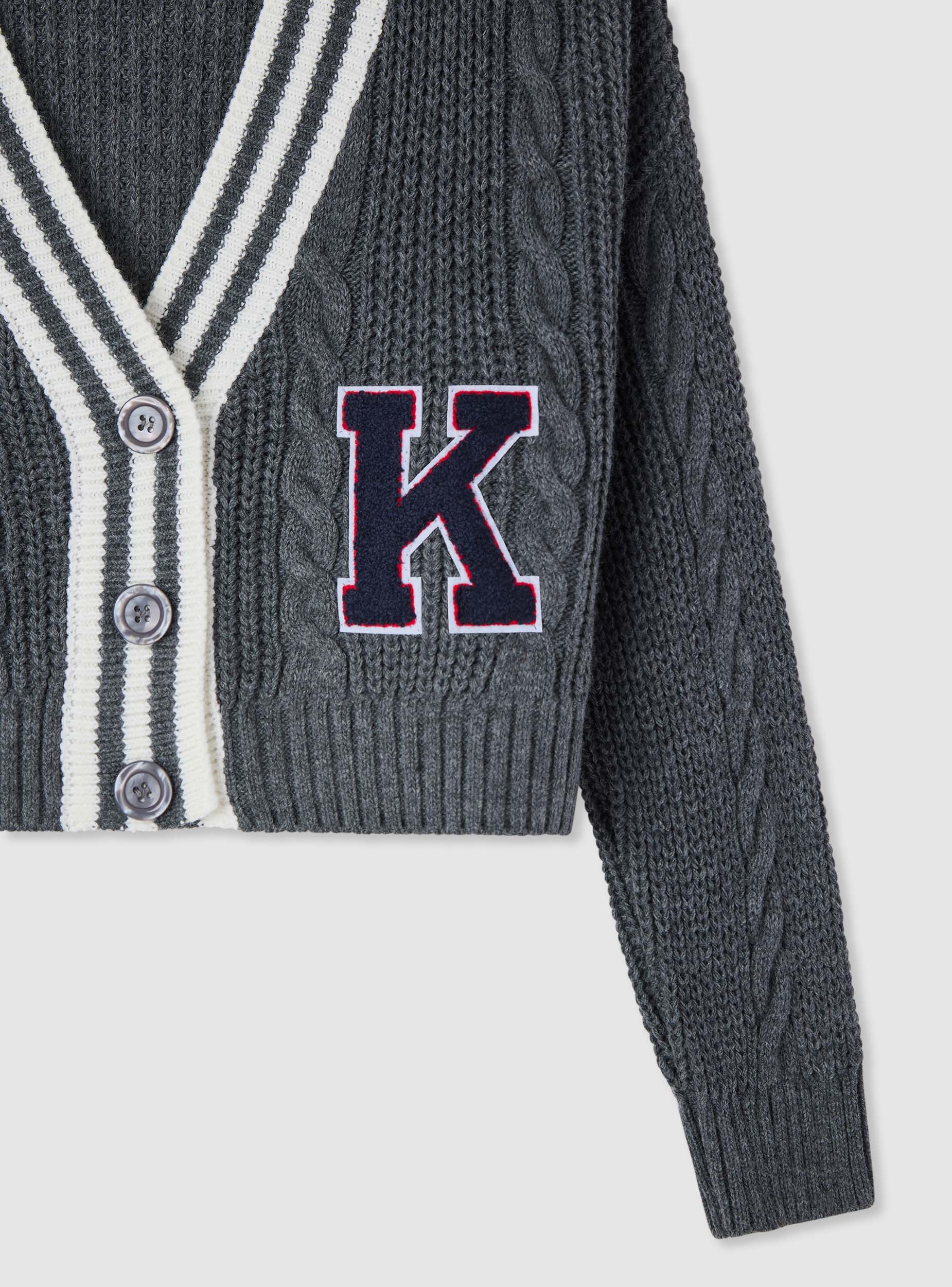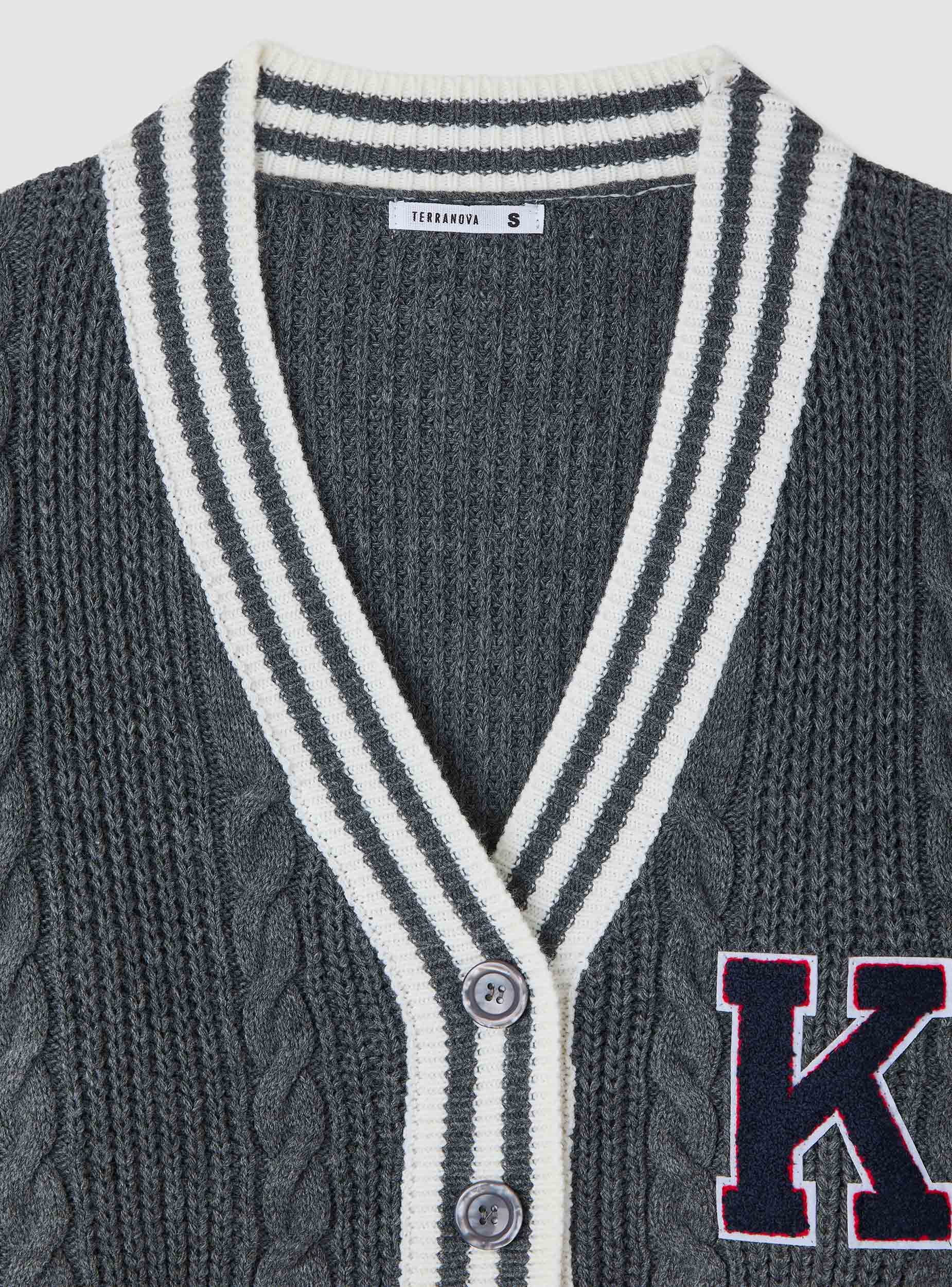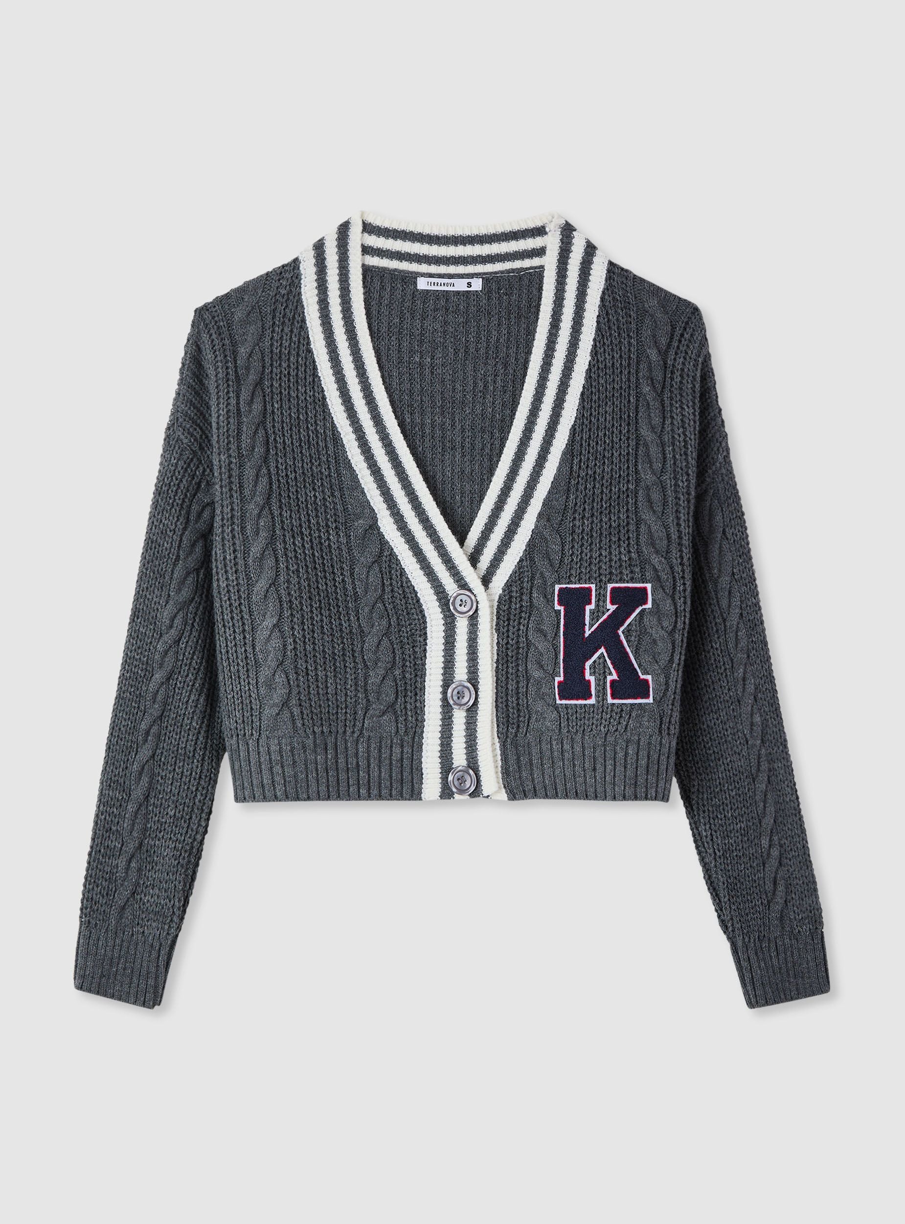 Cardigan da donna a maniche lunghe in tinta unita con patch stile college. Presenta scollo a V, chiusura frontale con bottoni e bordi a righe a contrasto. Lavorazione a trecce lungo corpo e maniche per un look grintoso. Vestibilità crop. Perfetta su jeans o gonna a vita alta per outfit casual o urban,.Dettagli