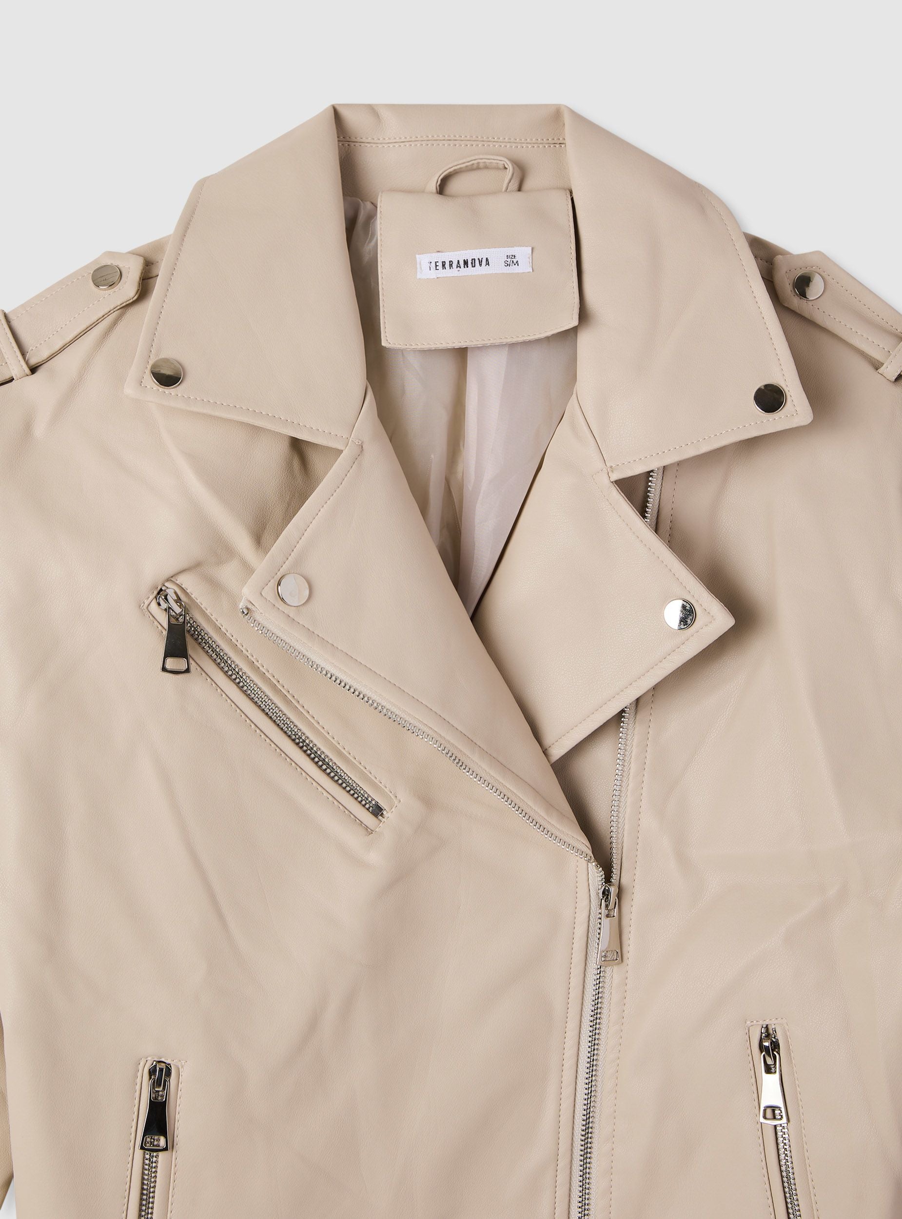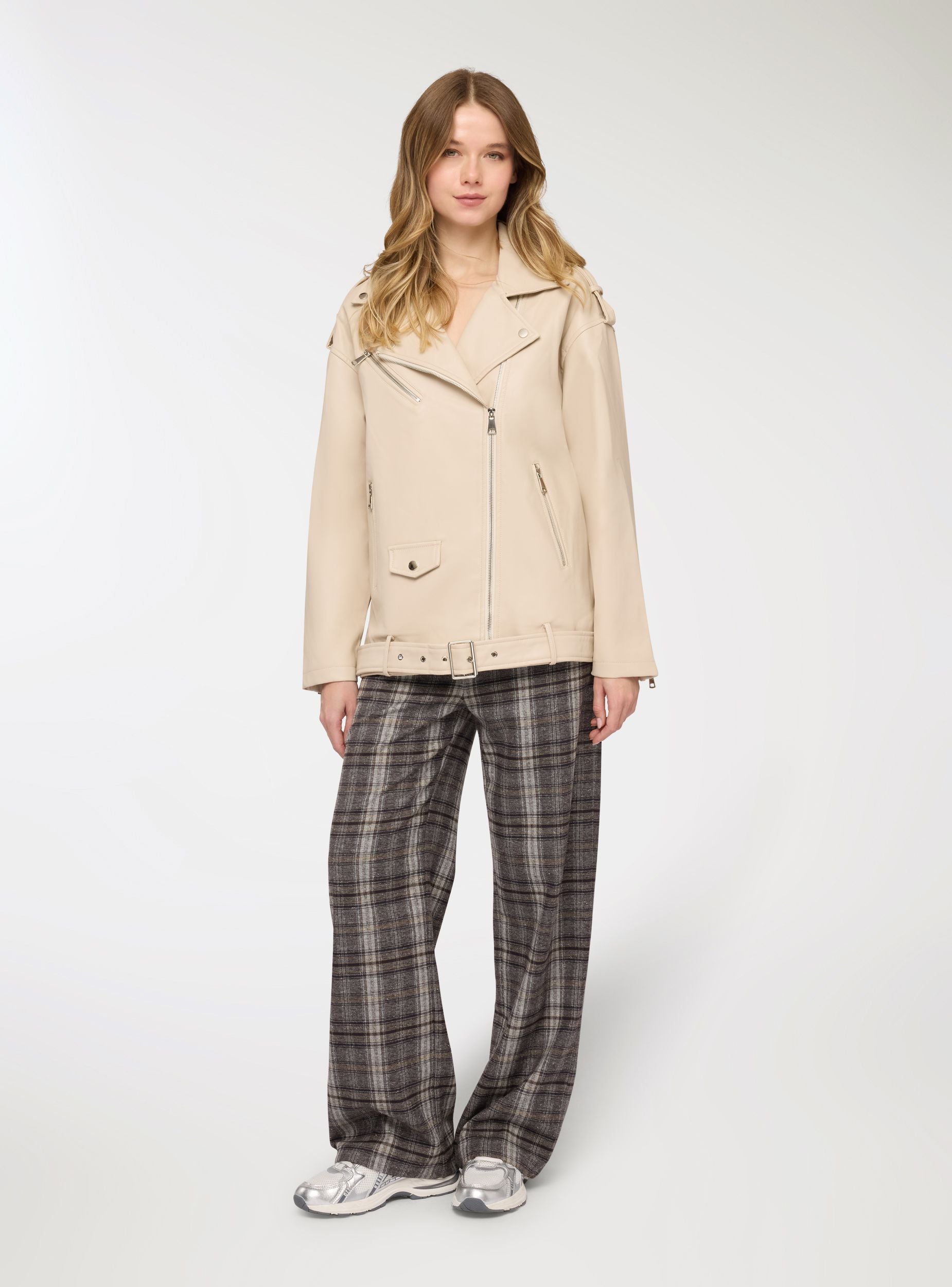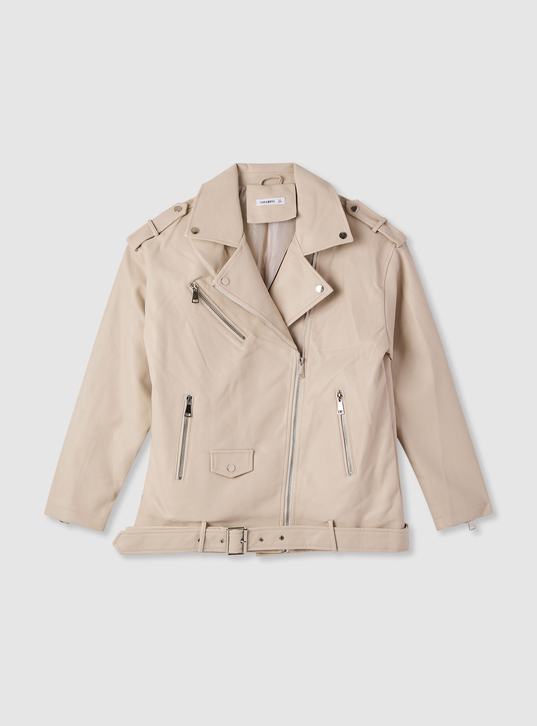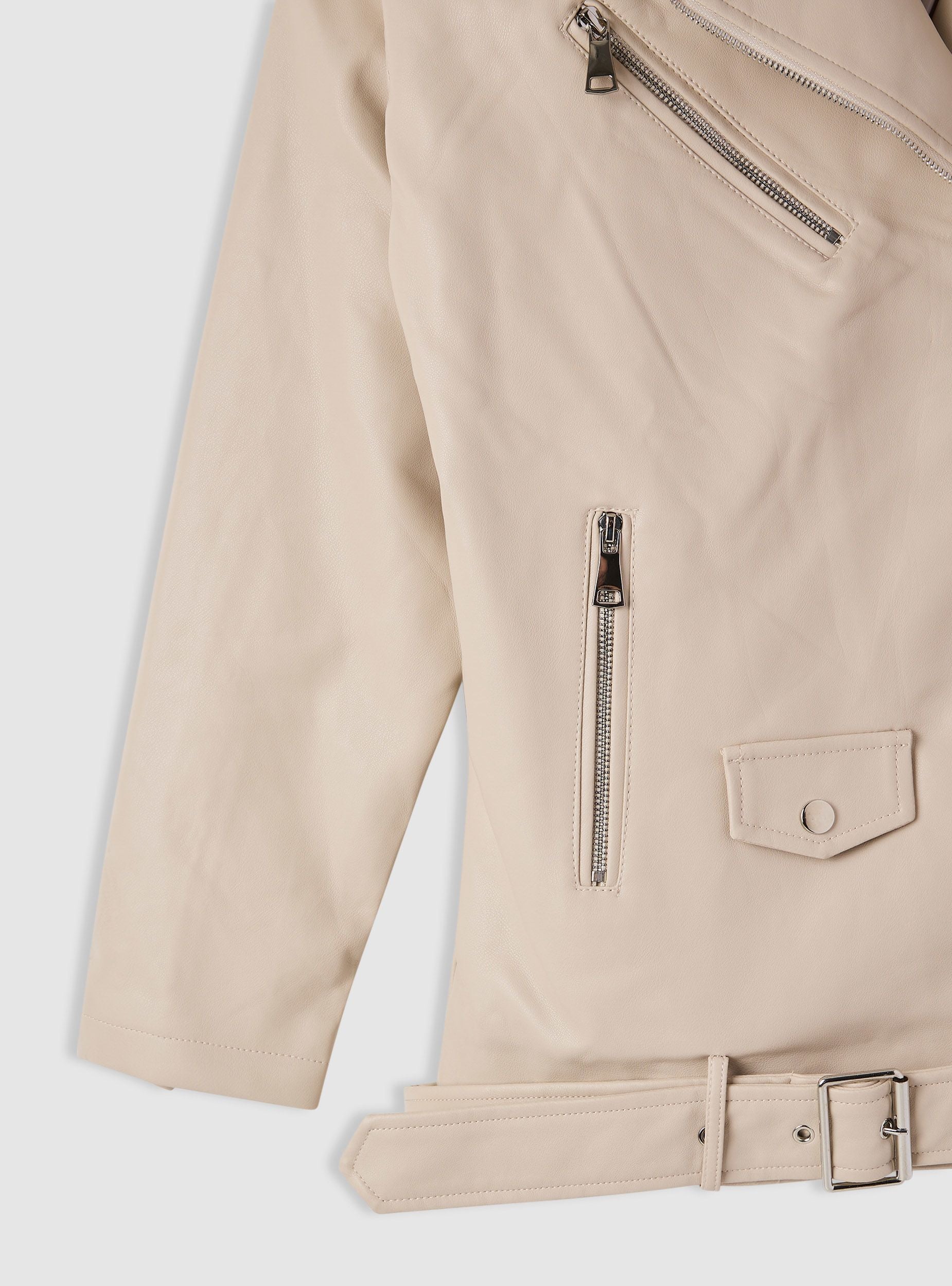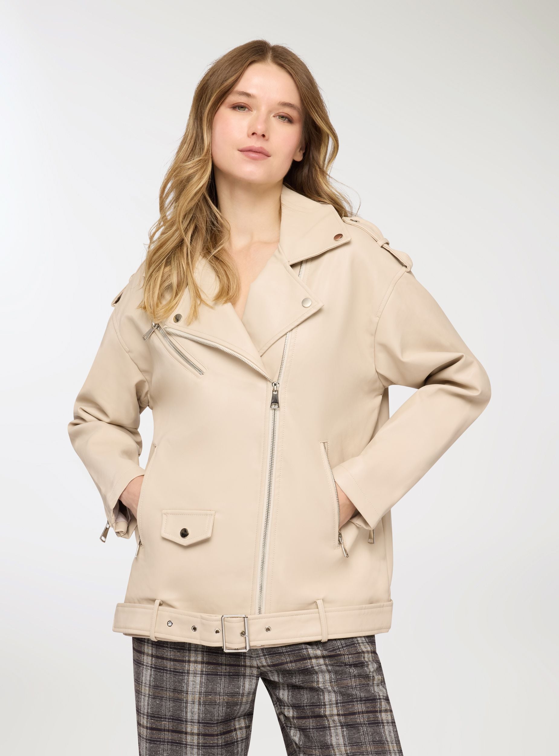 Chiodo da donna in tinta unita, vestabilità maxi. Modello con revers larghi e chiusura frontale con zip asimmetrica. Presenza di cintura in vita con fibbia. Tasche verticali con zip e piccola tasca con pattina. Perfetto per look urban su jeans e stivali oppure sopra abiti midi per un contrasto grintoso, adatto dalla giornata in città alle serate.Dettagli