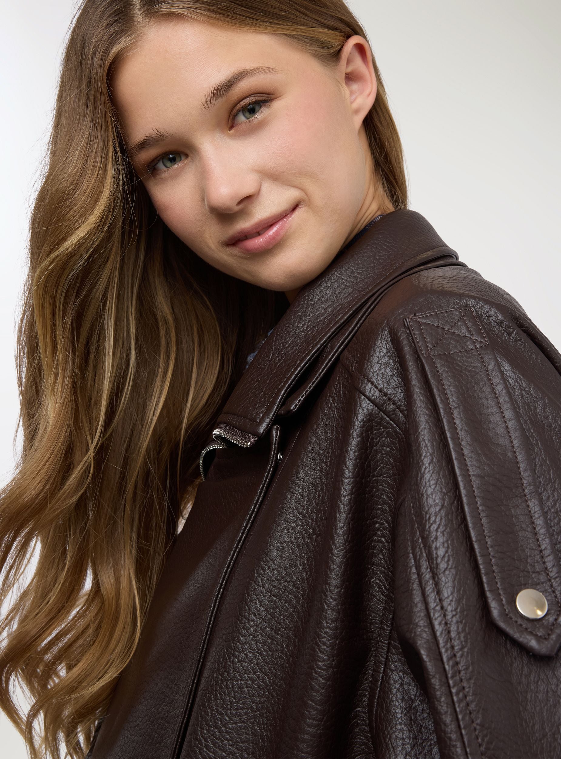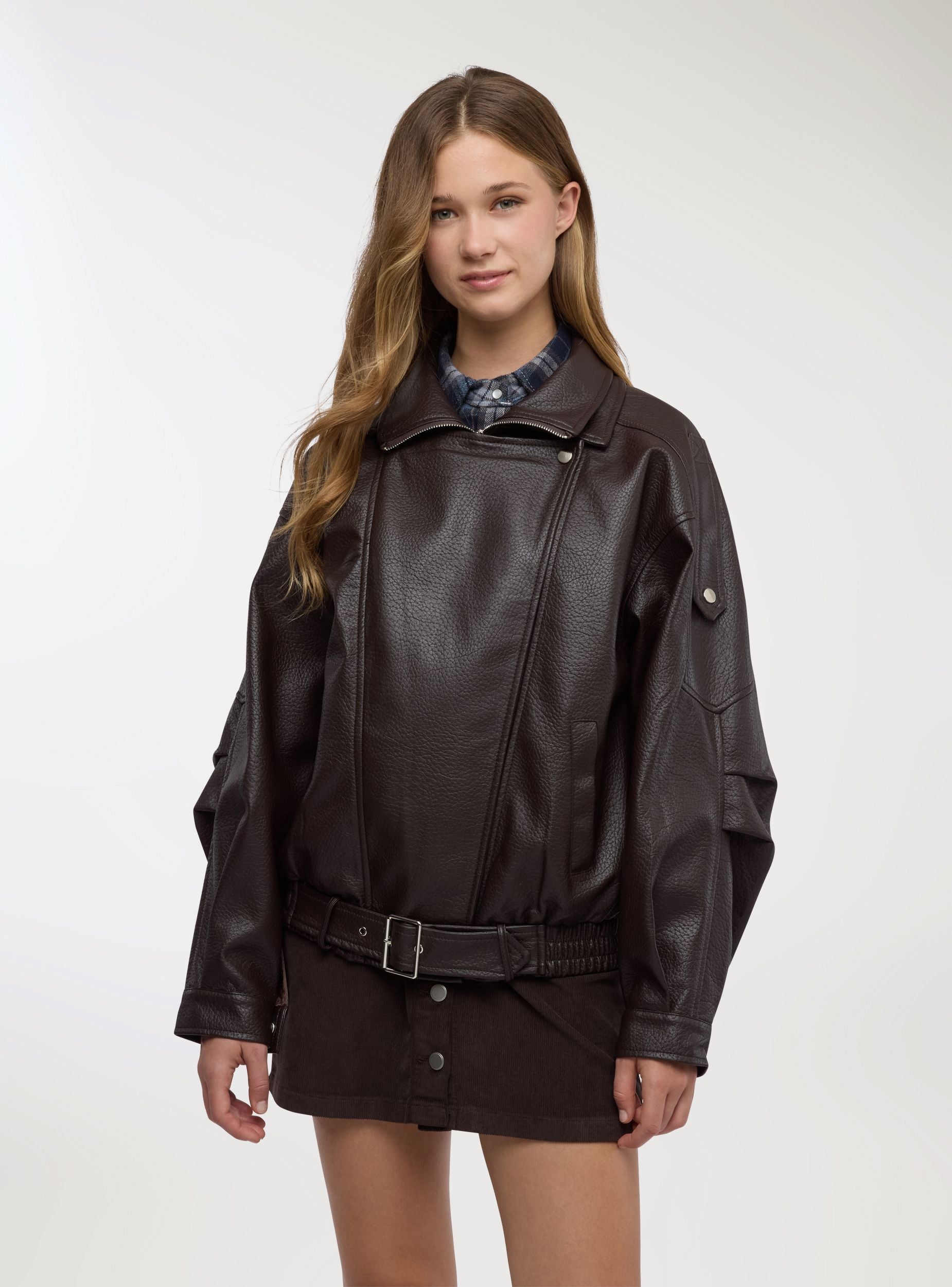 Chiodo da donna effetto pelle con vestibilità oversize. Collo con rever e chiusura asimmetrica con zip, cintura regolabile in vita con fibbia e fondo elasticizzato. Maniche lunghe con bottoni a pressione sulle spalle e dettagli strutturati. Tasche laterali a filetto per essenziali. Perfetto su jeans e stivali per il tempo libero o serate in città.Dettagli