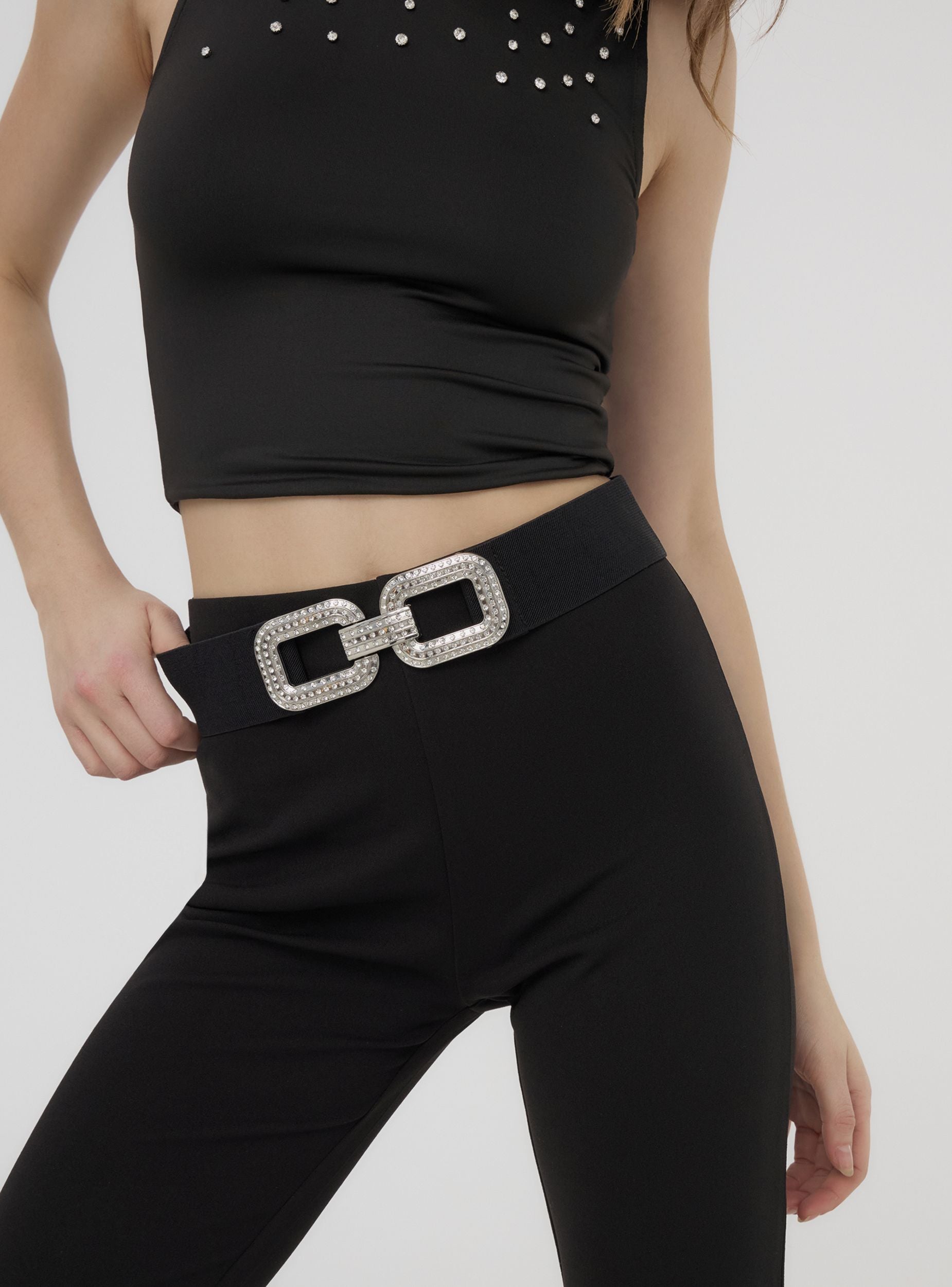 Cintura da donna alta dal design elegante e contemporaneo, impreziosita da una fibbia decorata con strass luccicanti. Perfetta per valorizzare i tuoi outfit da sera o per un'occasione speciale, questa cintura unisce praticità e stile, aggiungendo un tocco di brillantezza al tuo look. Ideale per completare abiti o pantaloni, è un accessorio immancabile per chi cerca dettagli raffinati.Dettagli