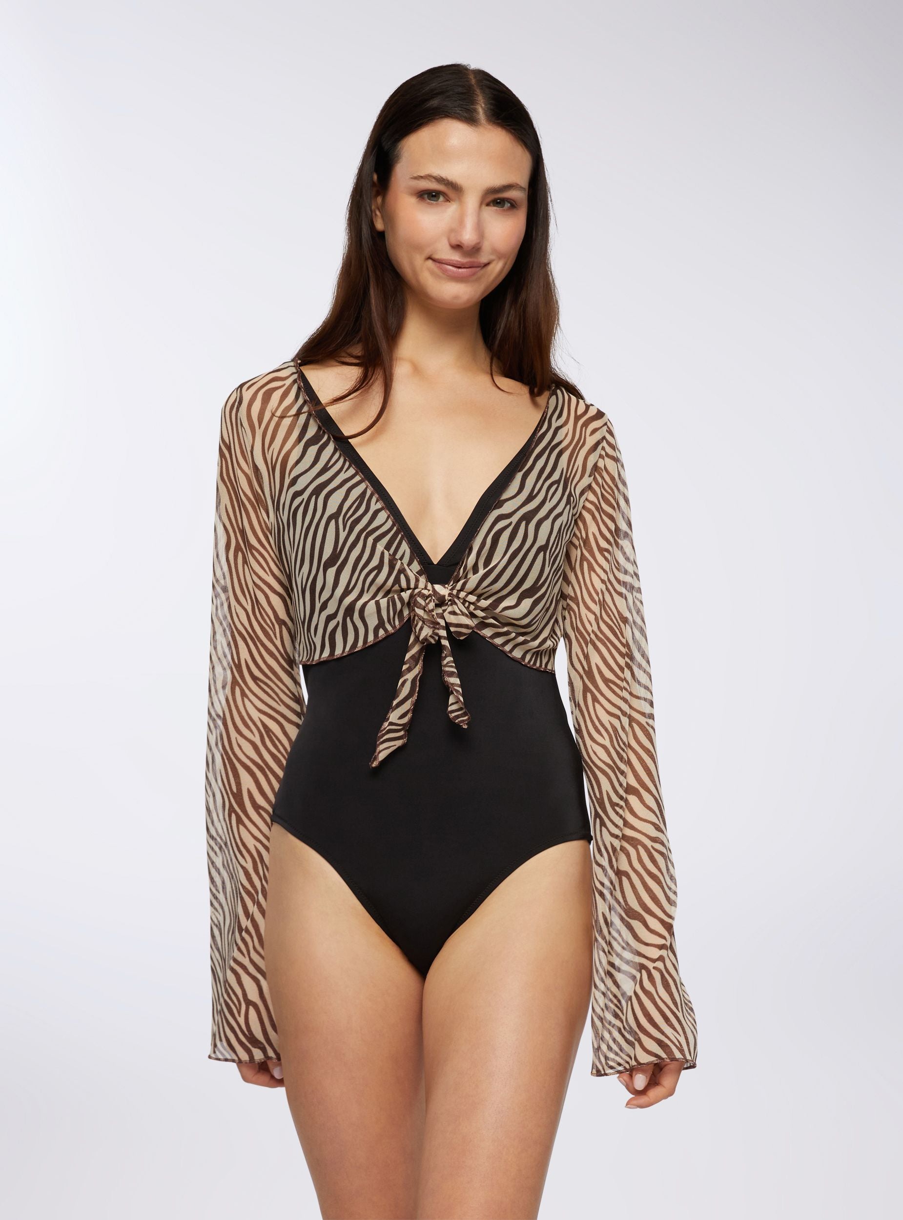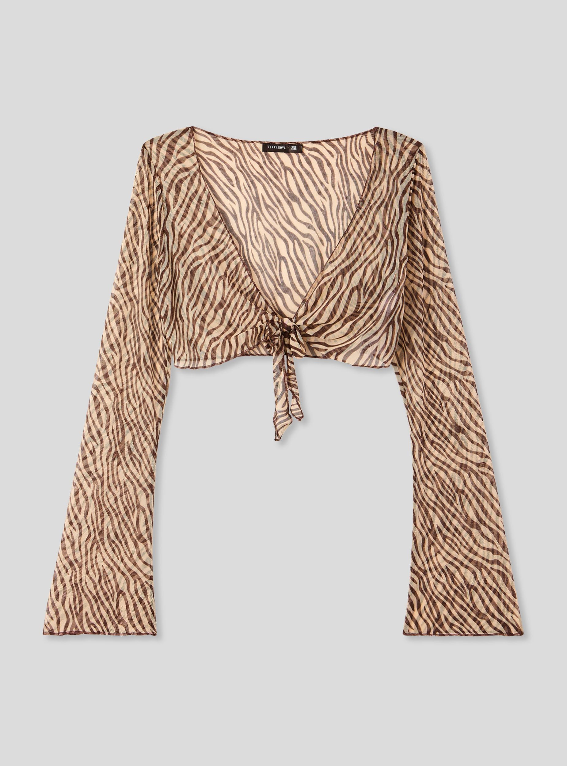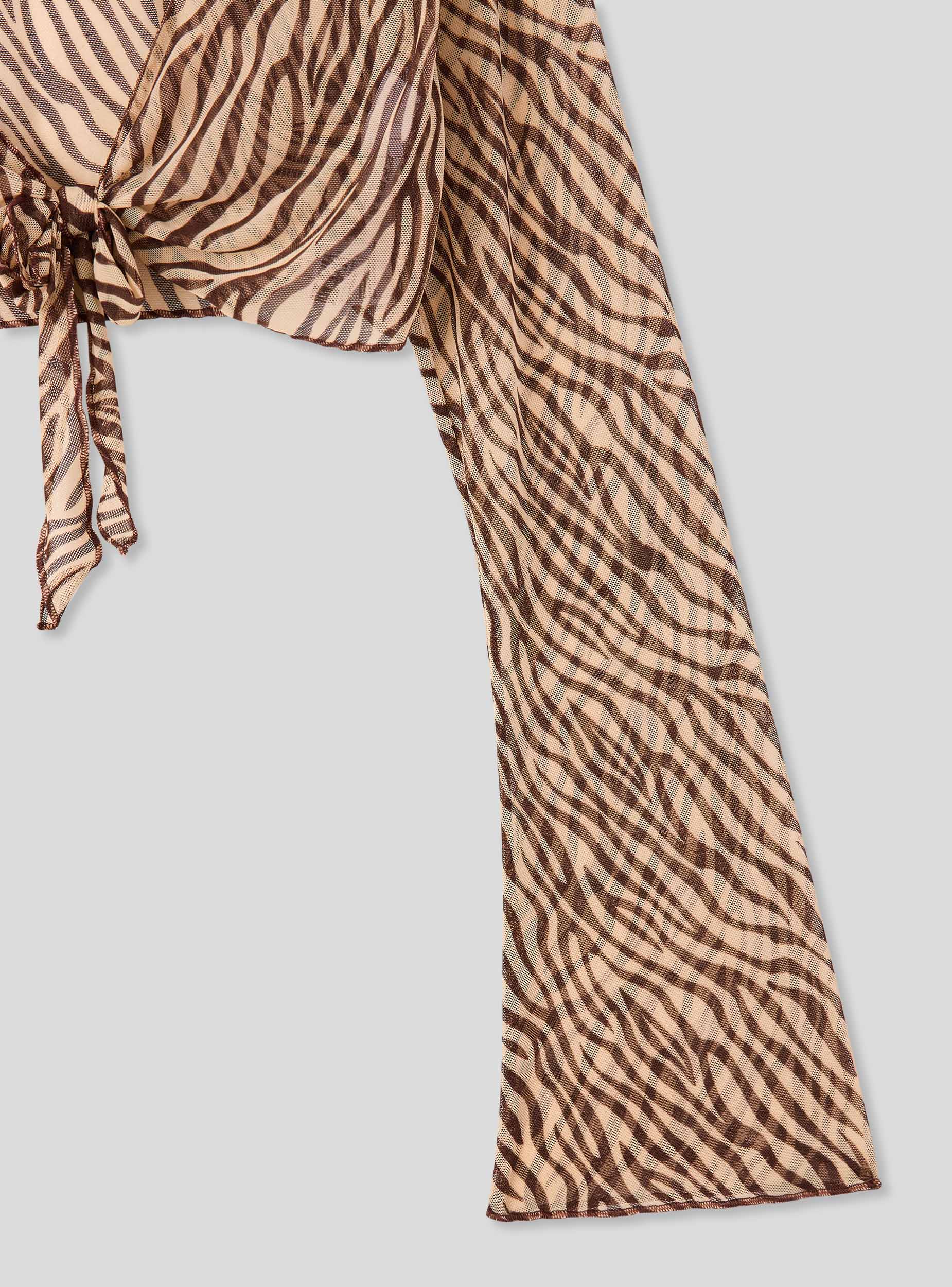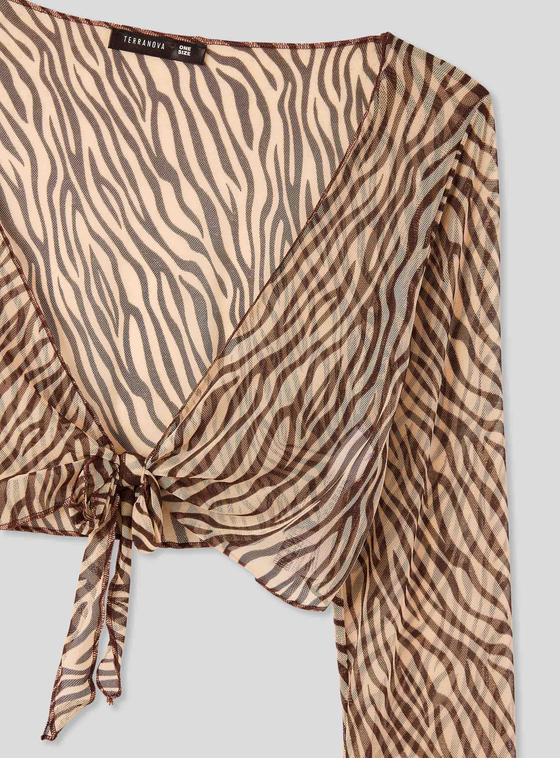 Coprispalle da donna a fantasia zebrata, ideale per aggiungere un tocco di stile audace ai tuoi outfit. Perfetto per essere indossato sopra al costume al mare, per aperitivi o serate estive. La vestibilità crop e il tessuto trasparente lo rendono un capo versatile e moderno, adatto a chi ama distinguersi con dettagli unici e alla moda.Dettagli