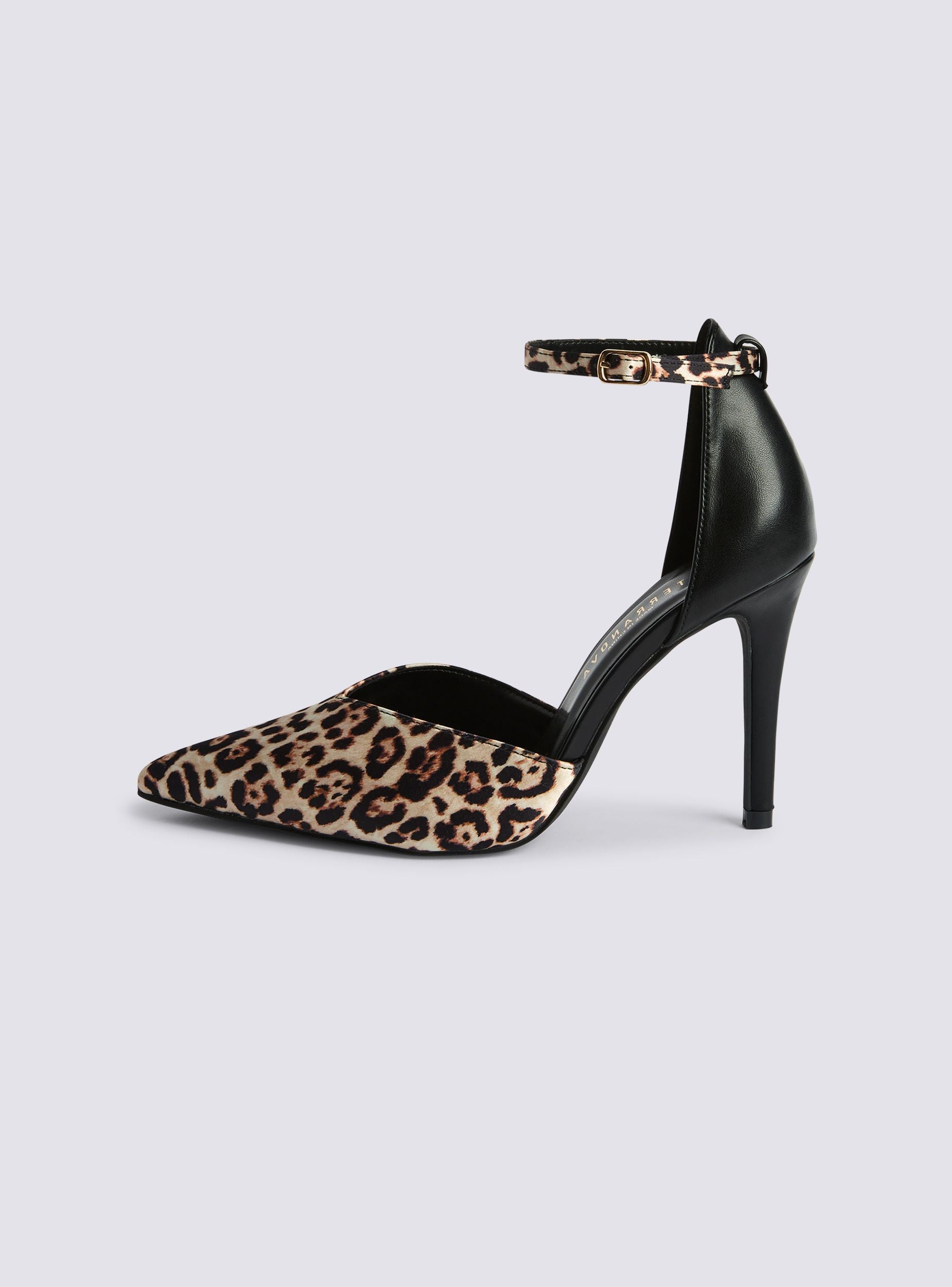 Scarpe da donna dal design audace e sofisticato, perfette per serate glamour, eventi mondani o look decisi dal carattere distintivo. Queste décolleté si distinguono per il motivo animalier, che dona un tocco grintoso ed elegante. La struttura aperta valorizza la silhouette del piede, mentre il cinturino alla caviglia assicura una vestibilità stabile e raffinata, ideale per chi ama farsi notare con stile e personalità. Altezza tacco 10,5 cm.Dettagli