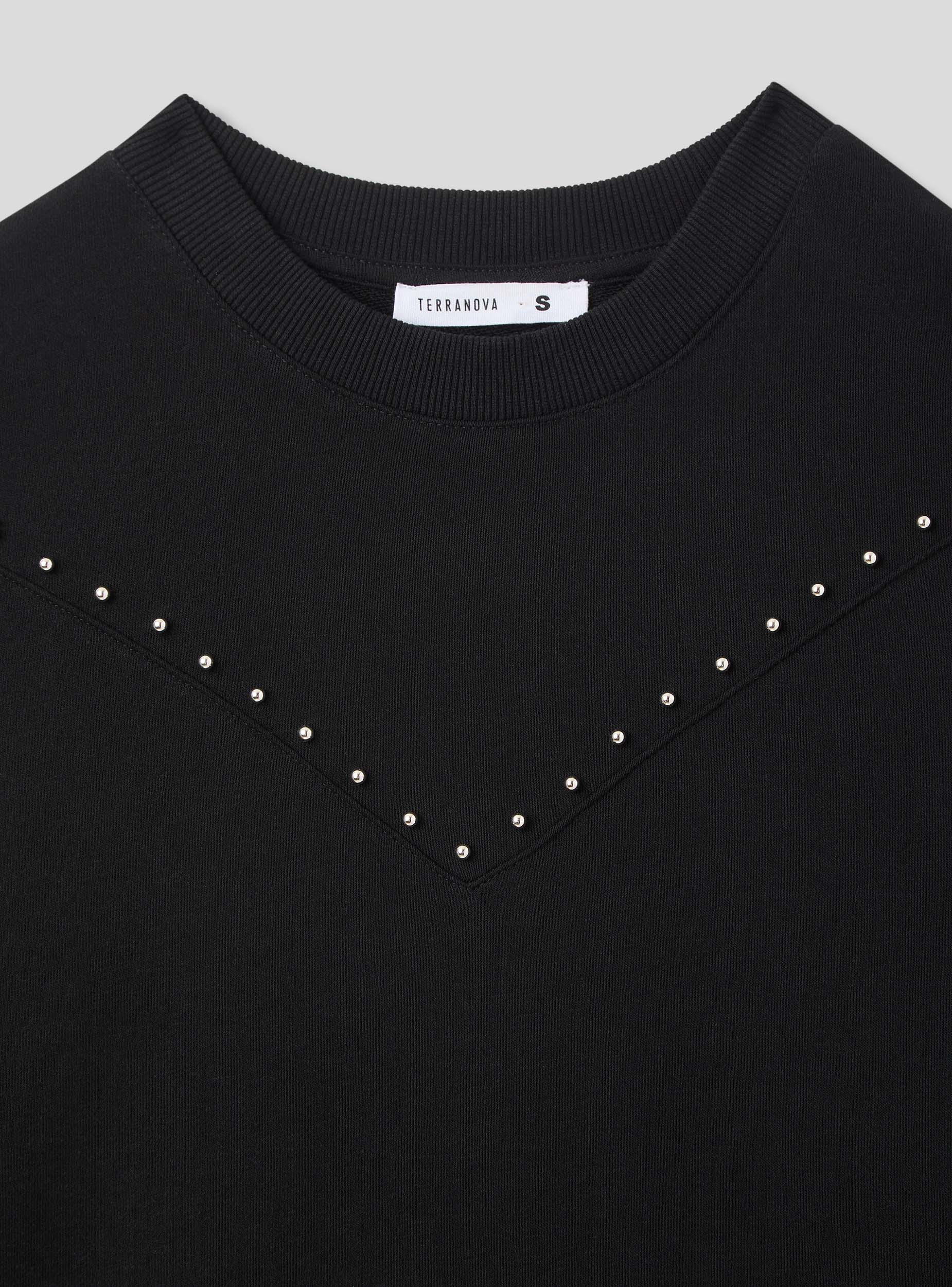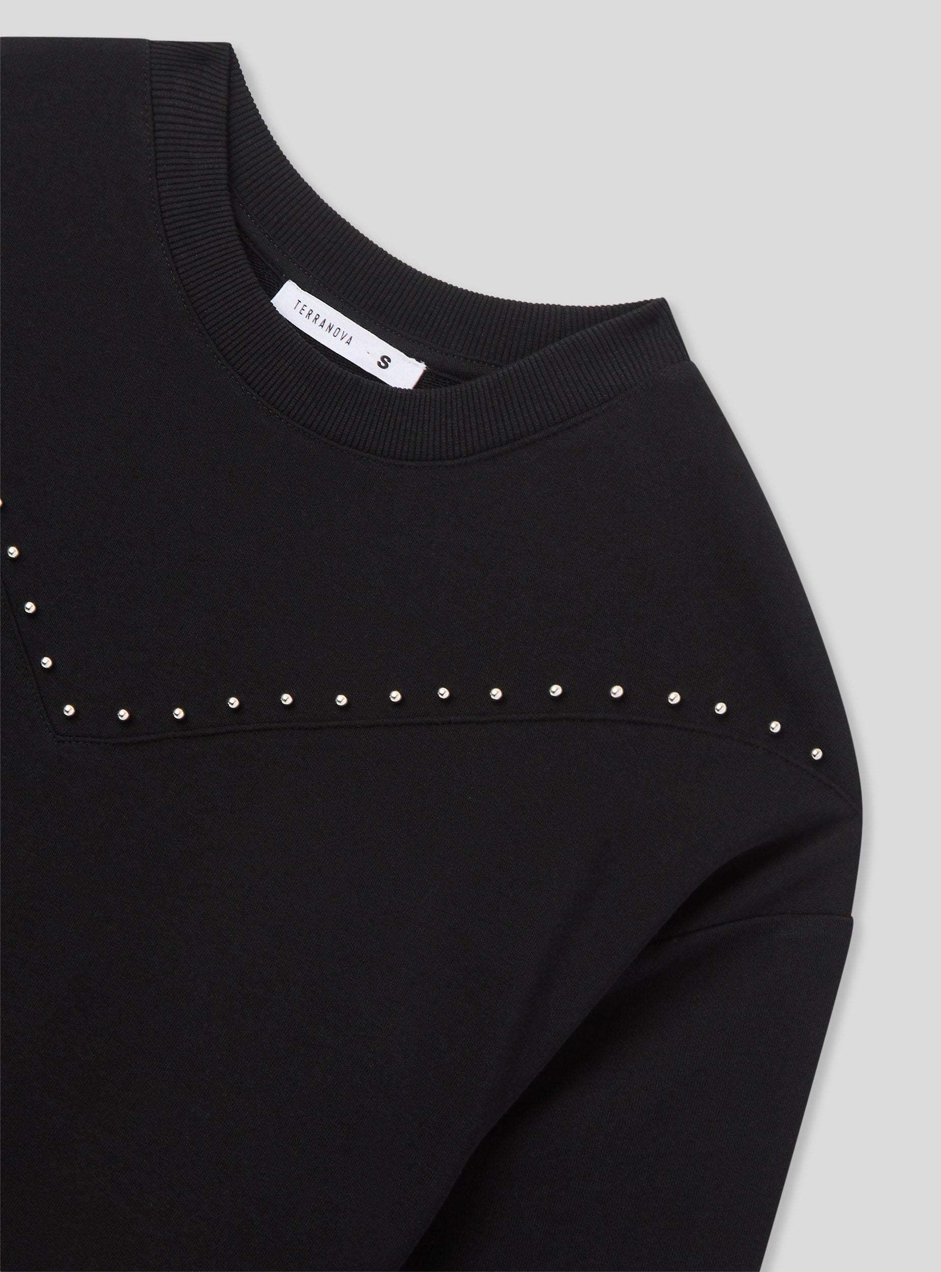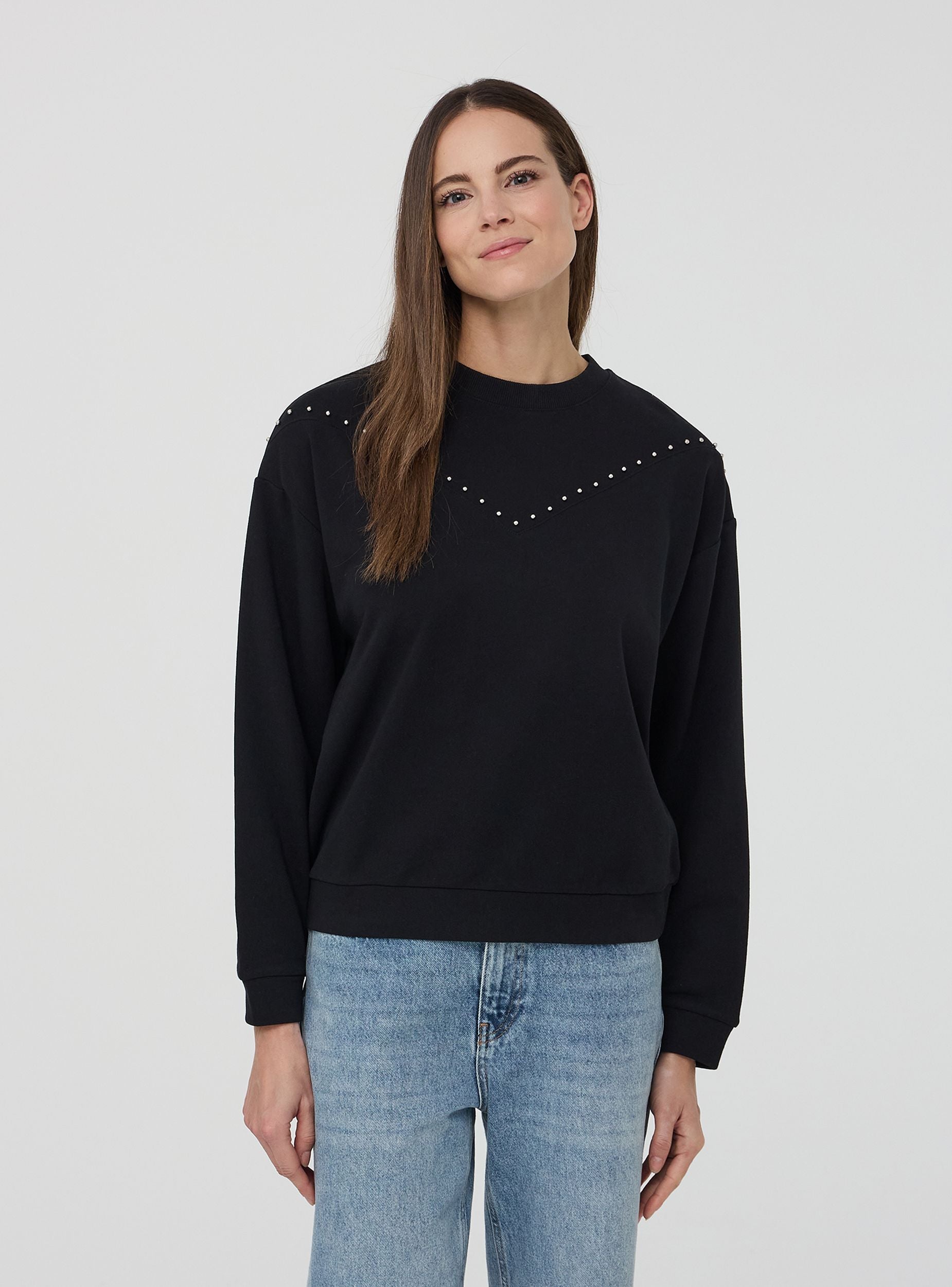 Felpa leggera da donna a maniche lunghe, dal taglio ampio e confortevole, senza zip e senza cappuccio. Le applicazioni di borchie aggiungono un tocco grintoso e originale, perfetto per un look casual ma di carattere. Ideale da abbinare a jeans, leggings o pantaloni cargo, si presta a outfit versatili per il tempo libero, le uscite informali o per un tocco urban-chic.Dettagli