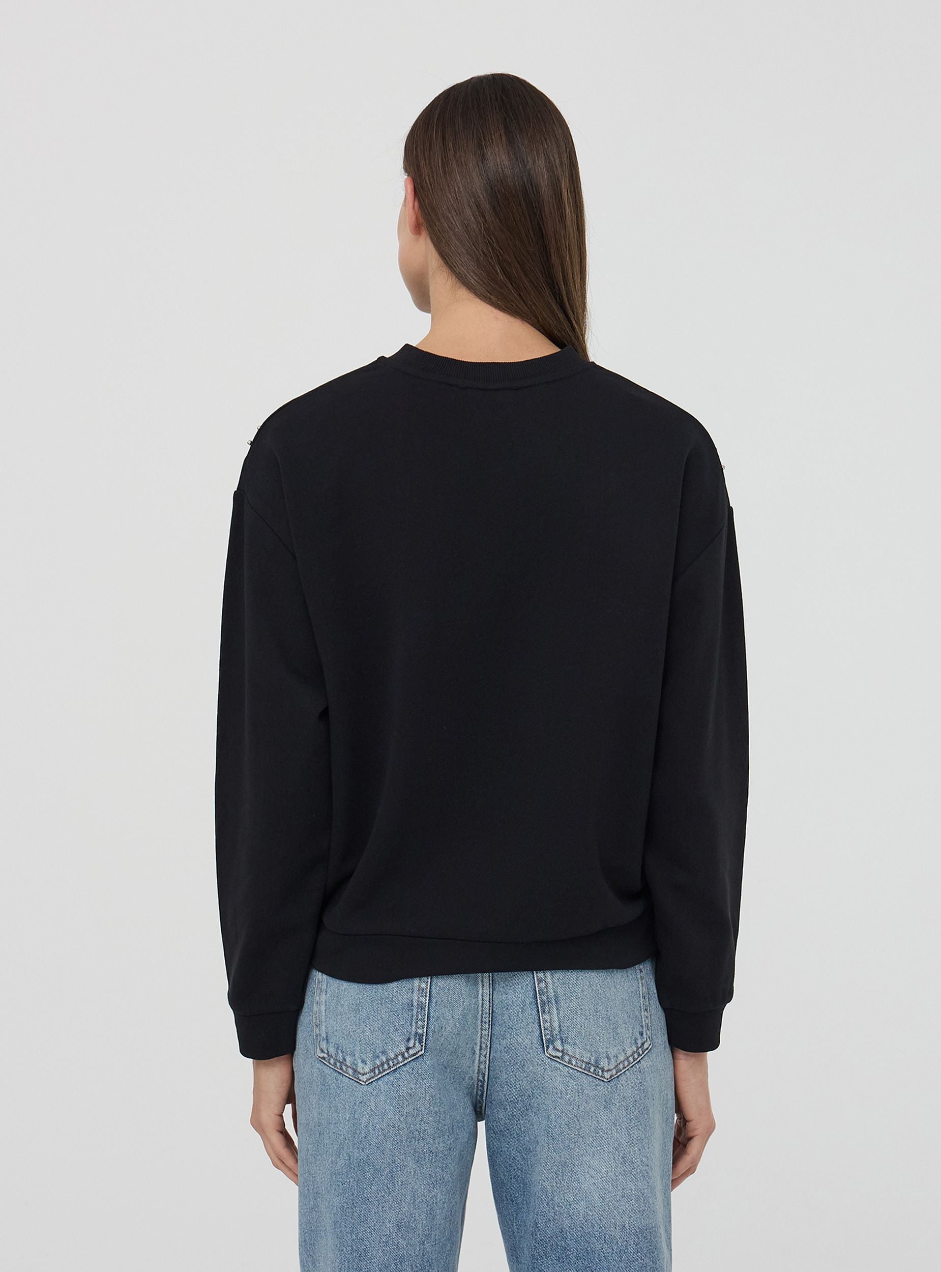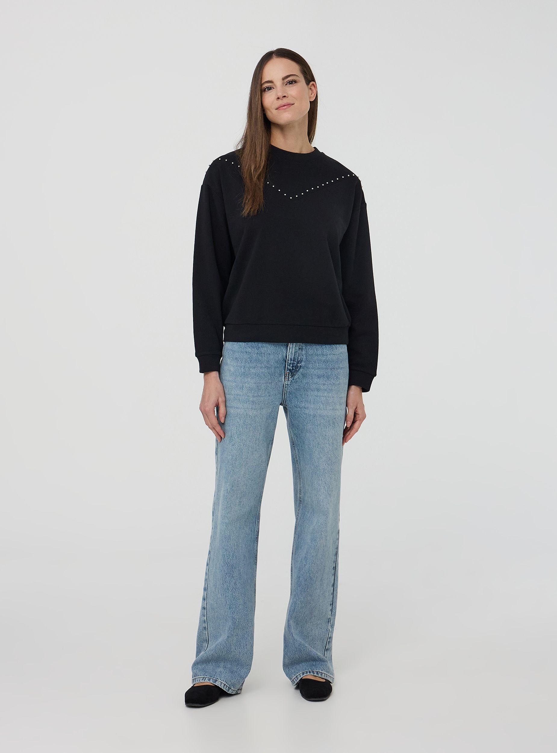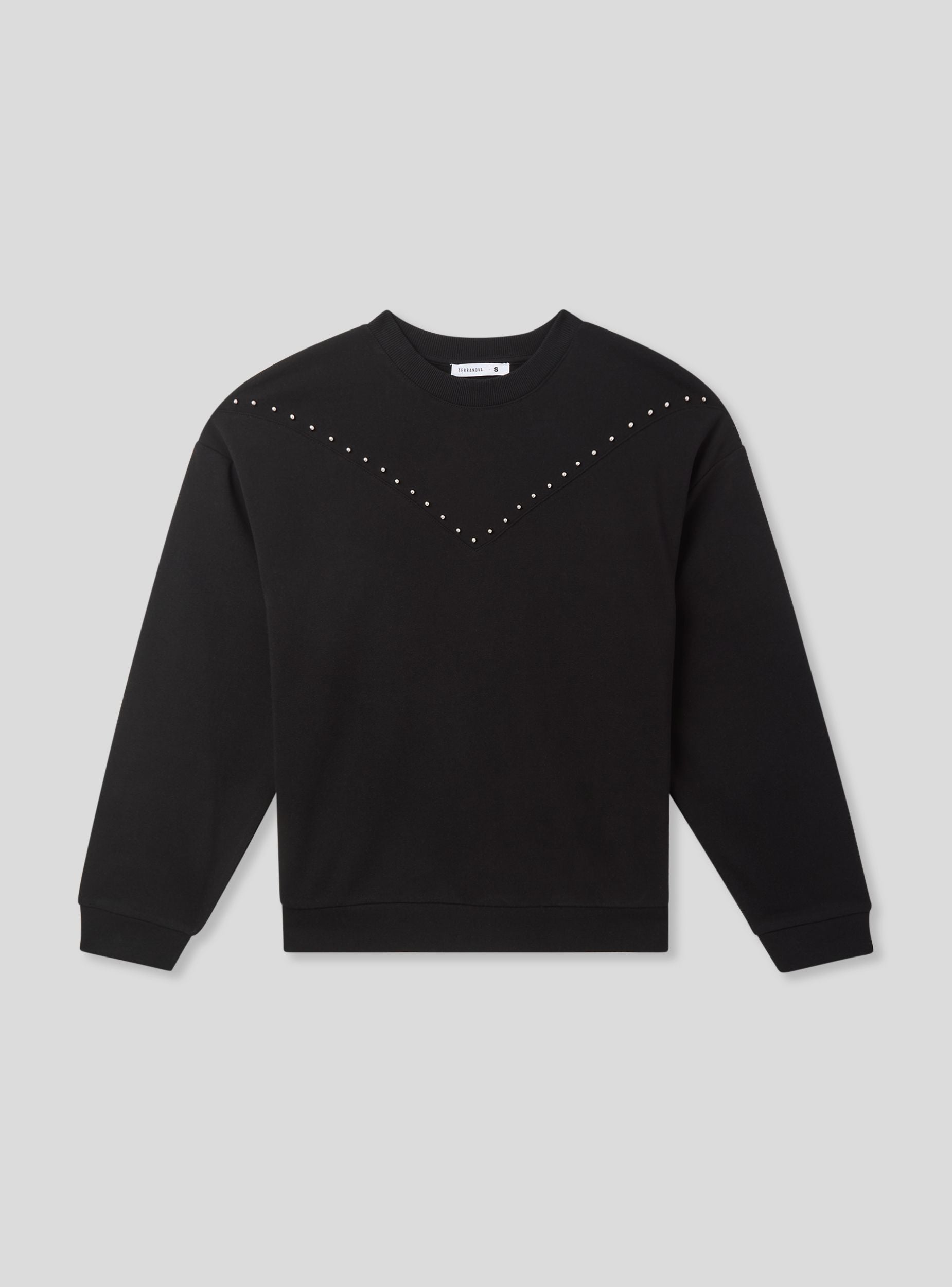 Felpa leggera da donna a maniche lunghe, dal taglio ampio e confortevole, senza zip e senza cappuccio. Le applicazioni di borchie aggiungono un tocco grintoso e originale, perfetto per un look casual ma di carattere. Ideale da abbinare a jeans, leggings o pantaloni cargo, si presta a outfit versatili per il tempo libero, le uscite informali o per un tocco urban-chic.Dettagli
