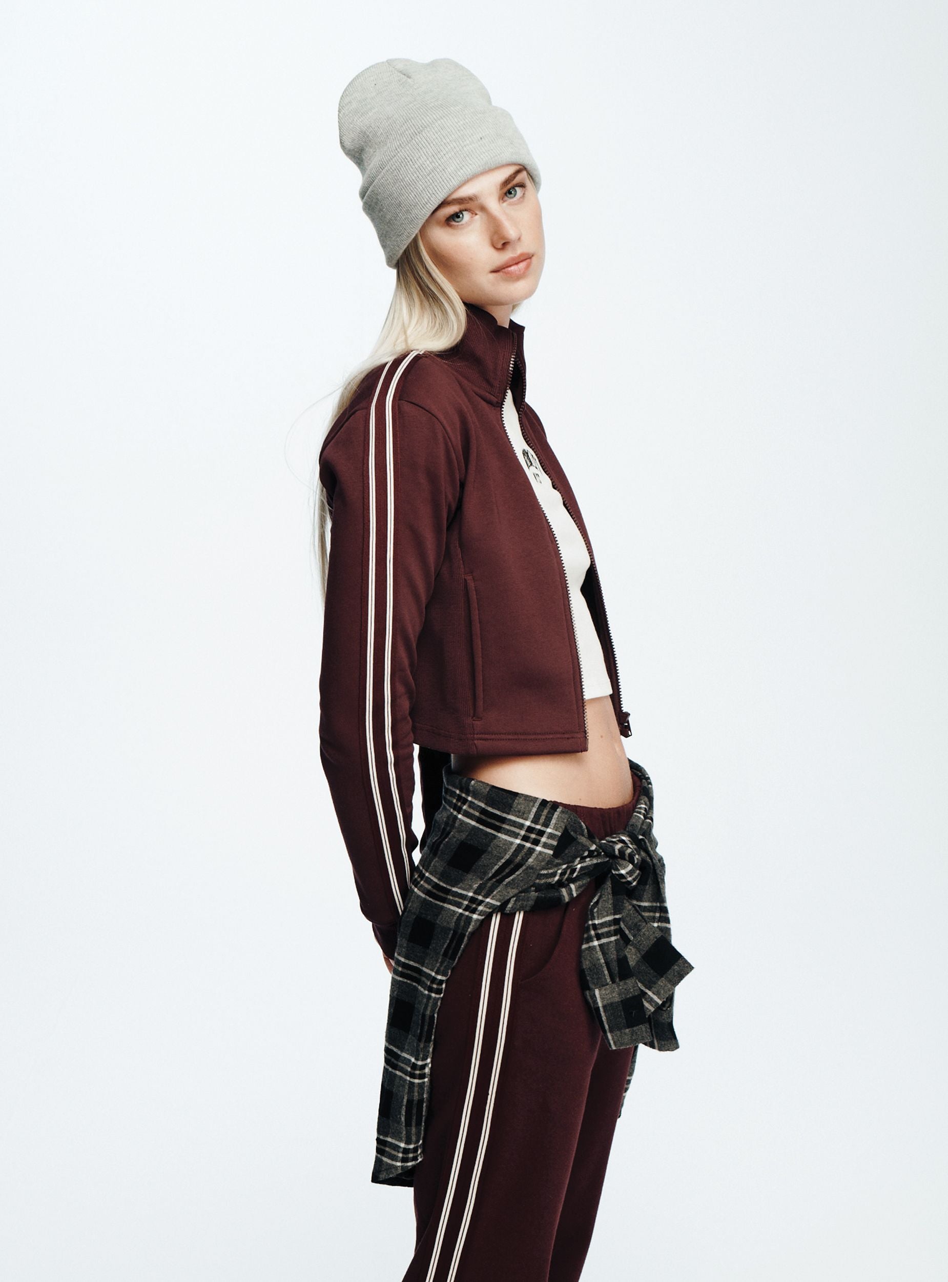 Felpa pesante da donna con taglio crop e bande laterali lungo le maniche per un look sportivo. Modello senza cappuccio, con zip frontale e tasche laterali. Il tessuto pesante garantisce calore e comfort ideali per l’inverno. Collo alto e finiture in costina completano il design.Dettagli