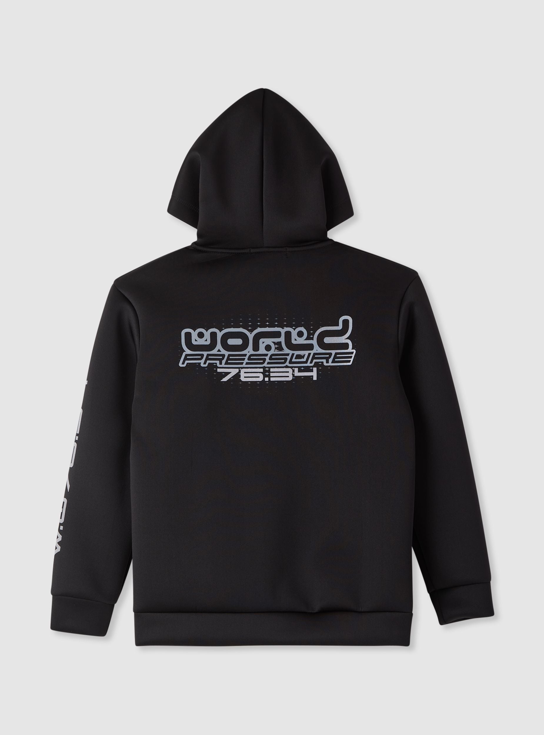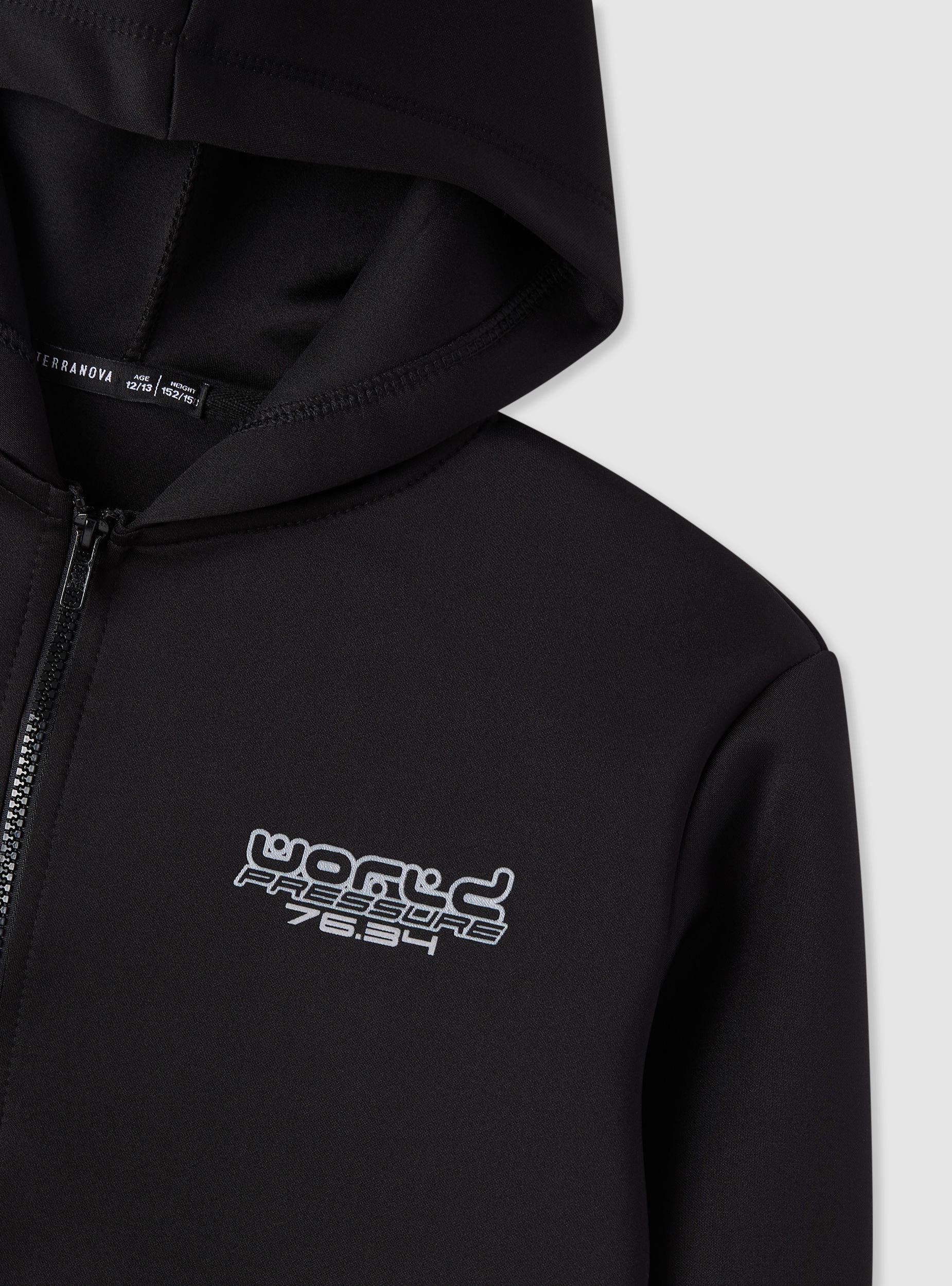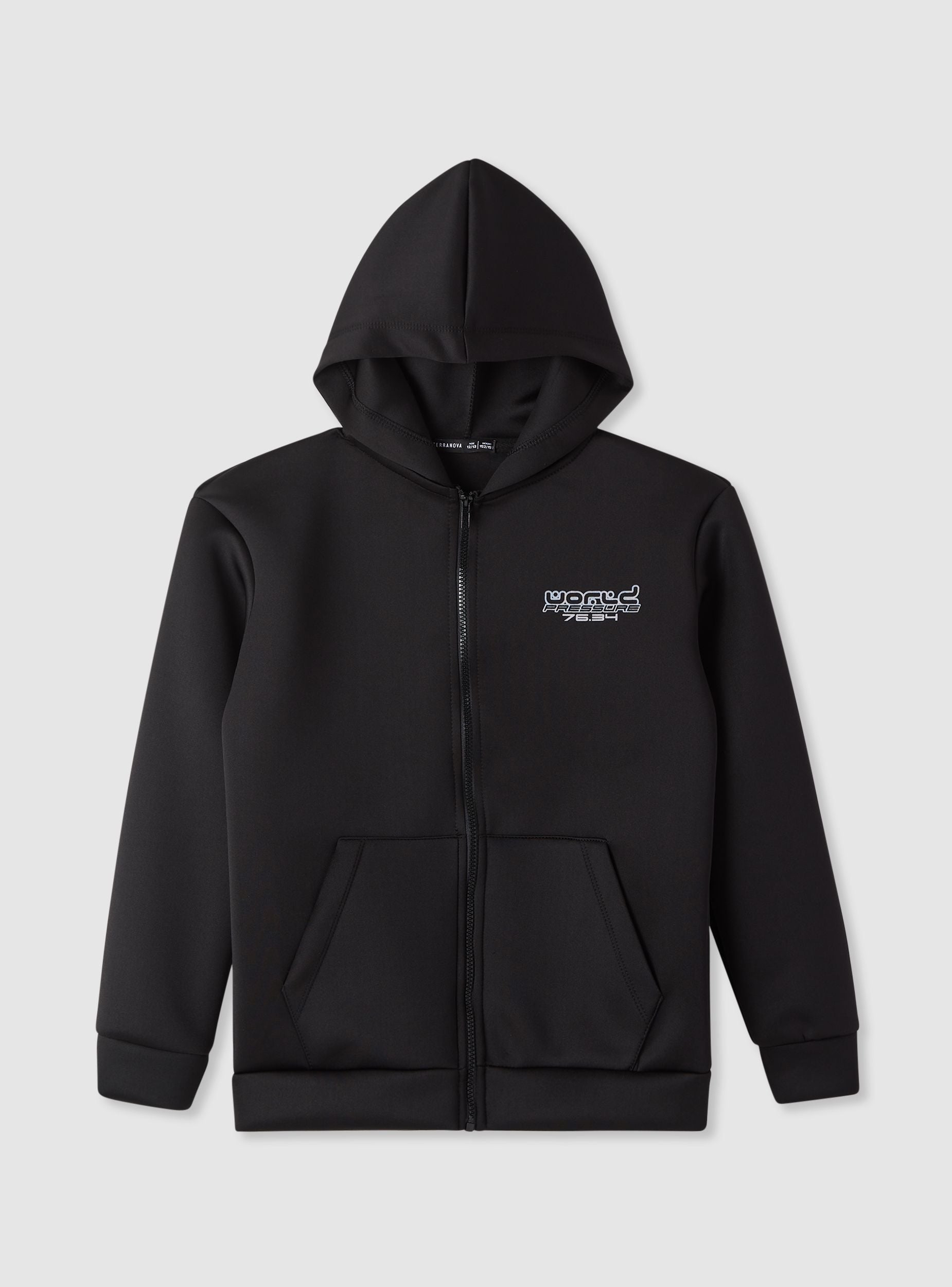 Felpa da bambino con cappuccio e zip frontale. Ideale per il tempo libero e look urban, si abbina a jeans o pantaloni tuta. Tasche a marsupio, polsini e fondo a costine, stampa frontale e sul retro. Vestibilità regular. Tessuto pesante.Dettagli