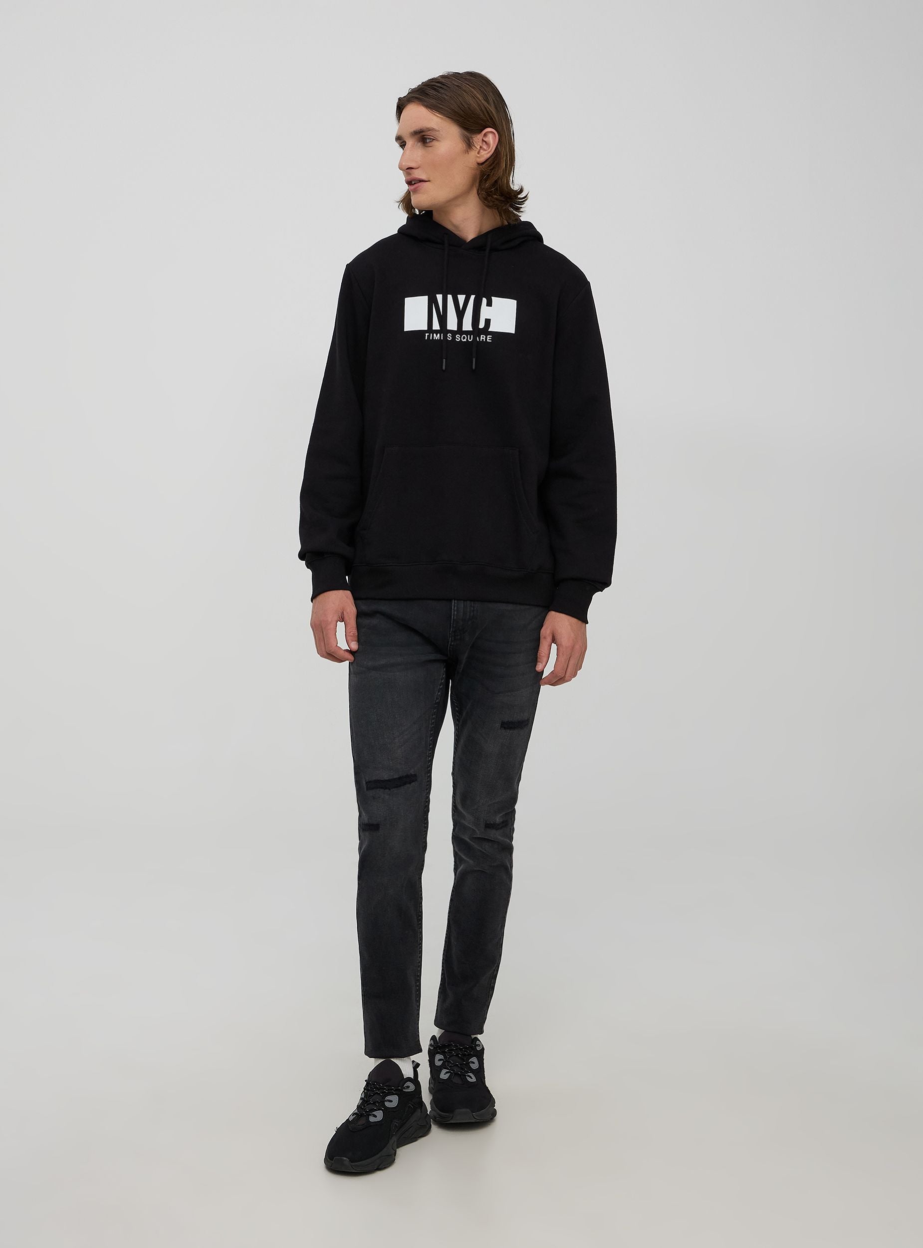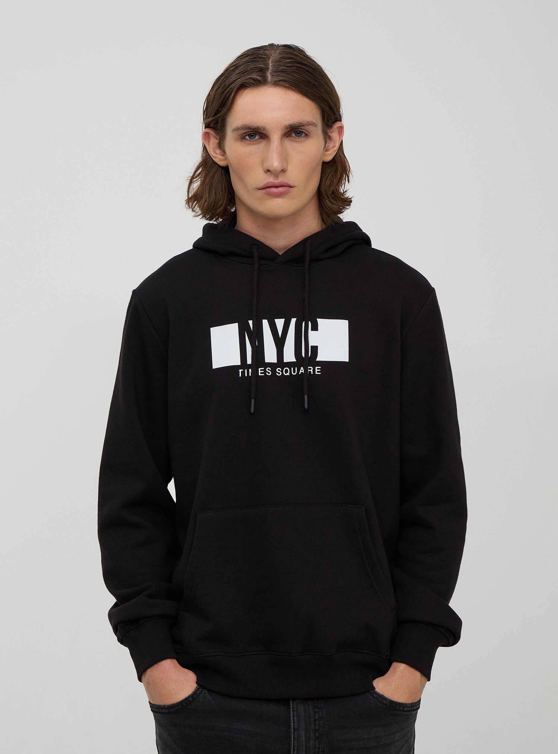 Felpa da uomo con cappuccio e stampa frontale NYC. Realizzata in morbido tessuto pesante, offre un comfort ottimale. Modello chiuso, dotata di cappuccio regolabile con coulisse, polsini e orlo a costine, e tasca a marsupio frontale. Perfetta per un look casual e sportivo, si abbina facilmente a jeans o pantaloni sportivi.Dettagli