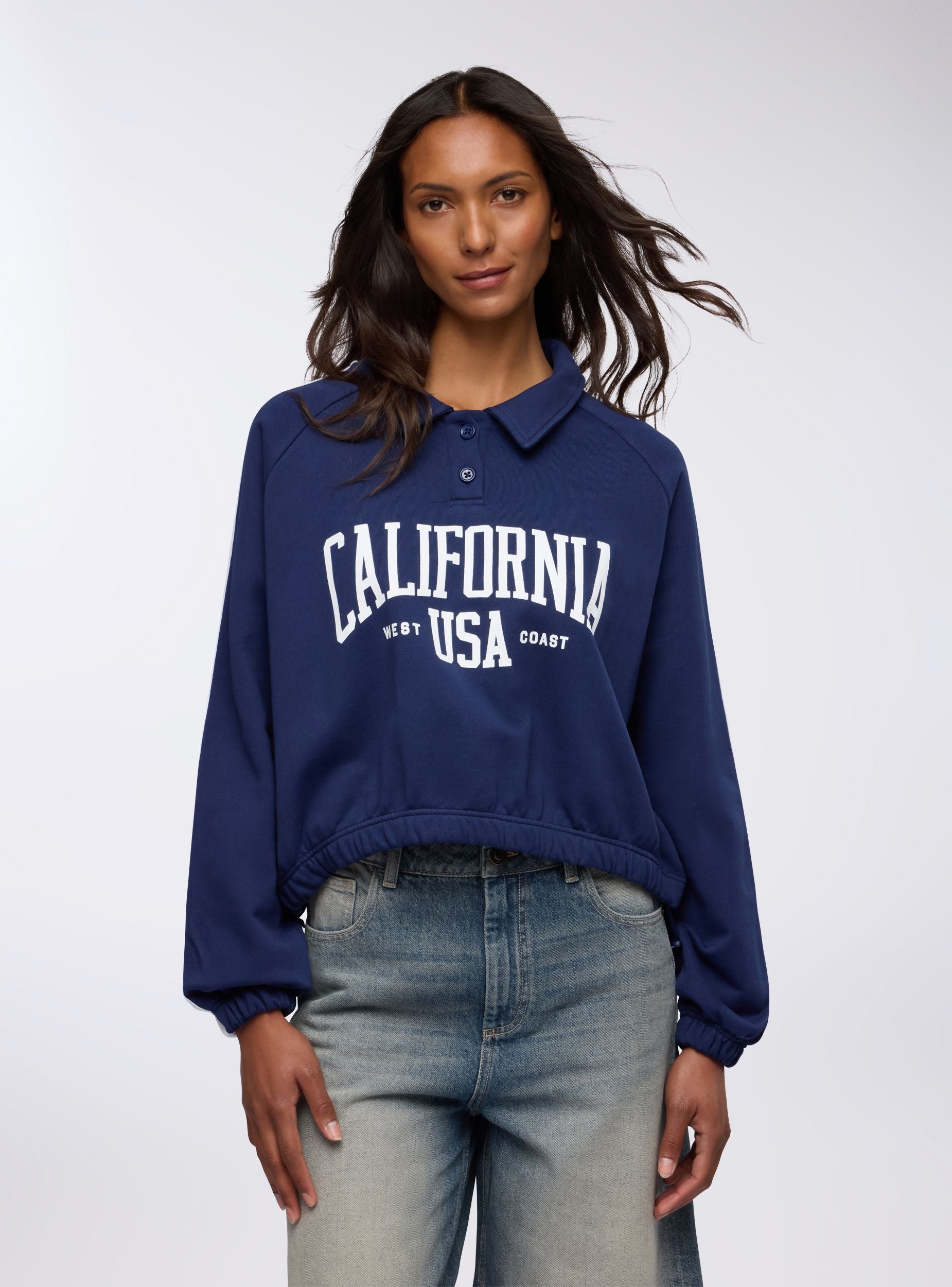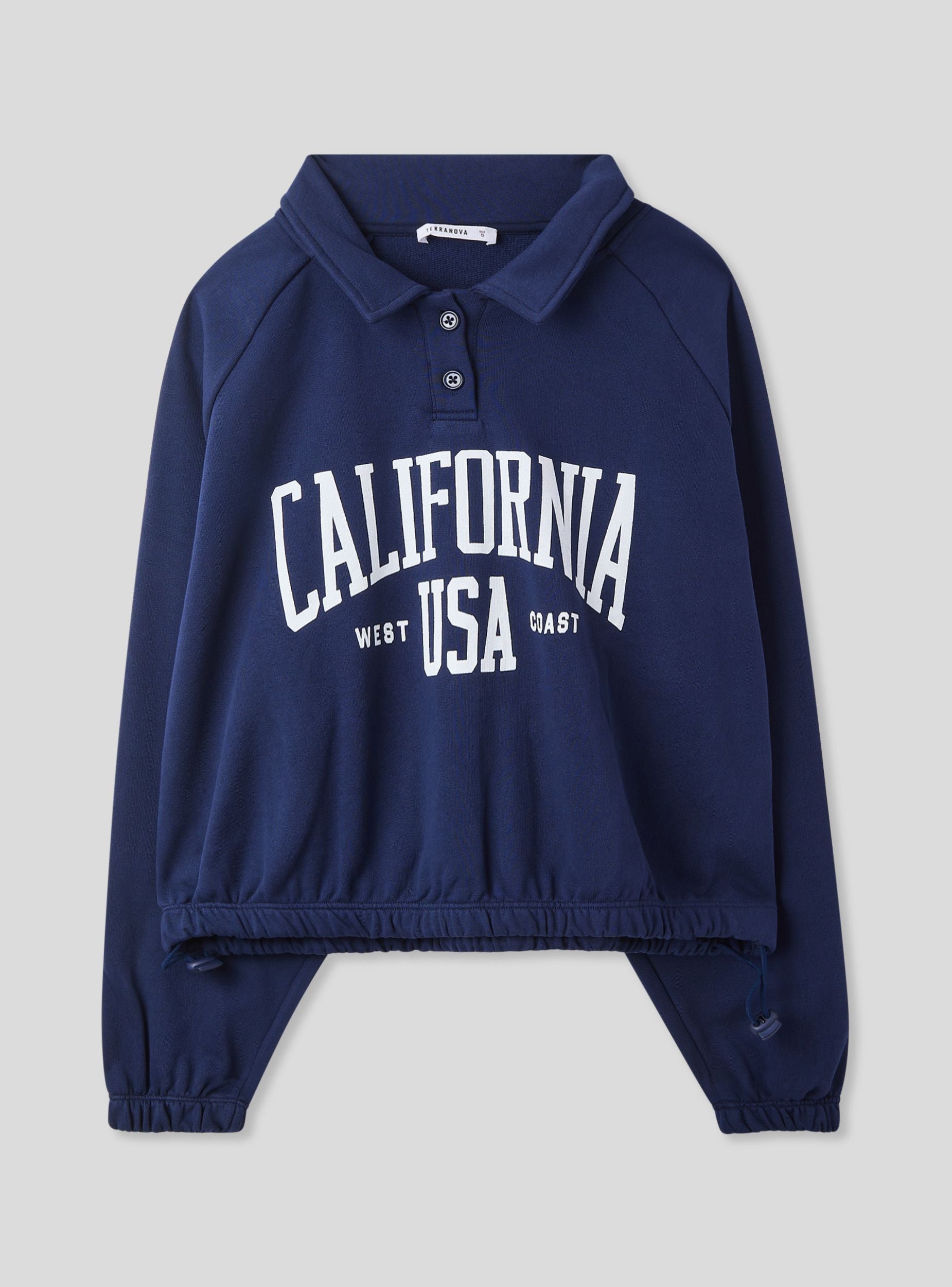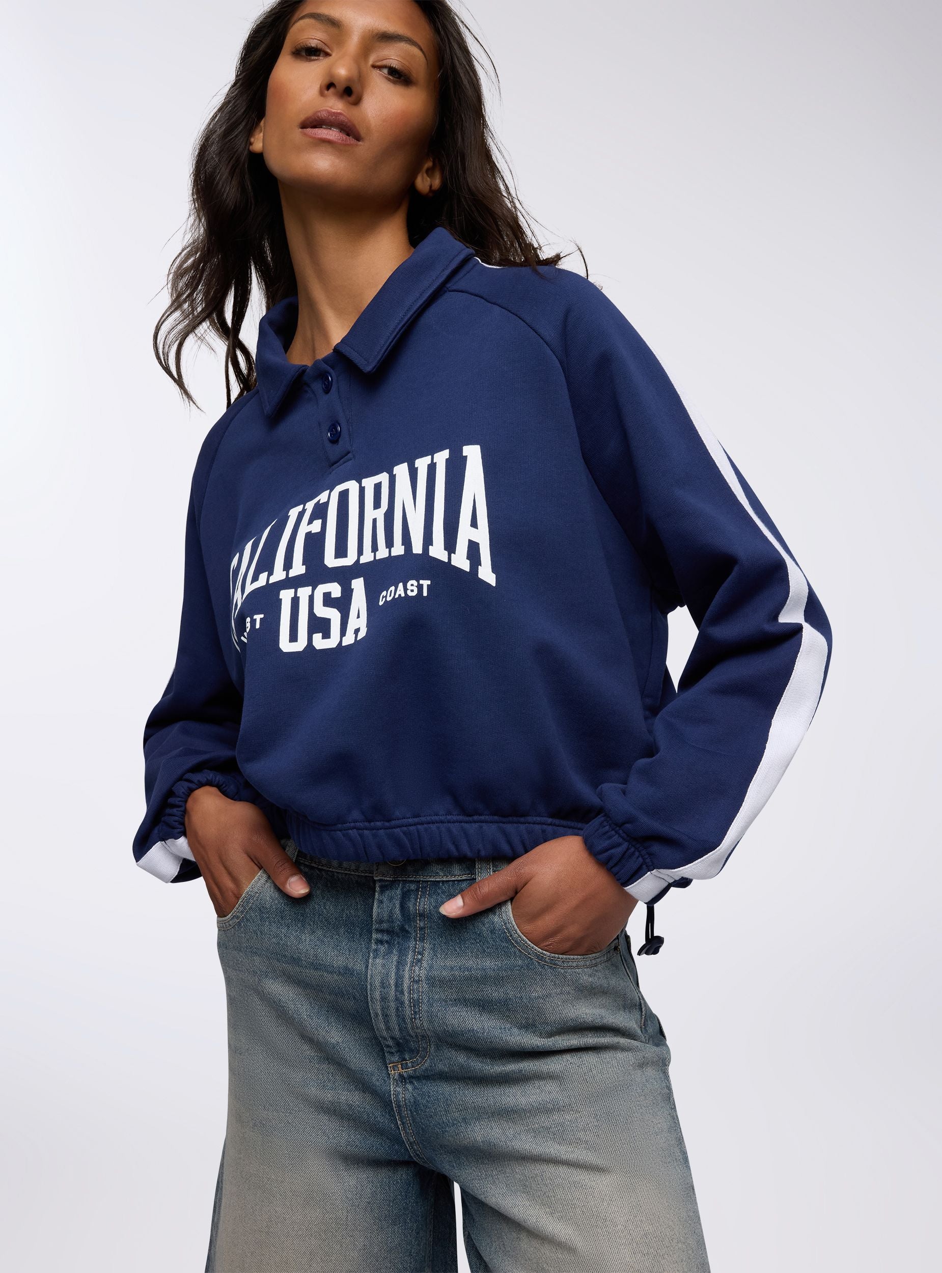 Felpa leggera da donna ideale per un look casual e sportivo. Perfetta per il tempo libero, si abbina facilmente a jeans o pantaloni jogger per un outfit comodo e alla moda. Il design con stampa college aggiunge un tocco di stile urbano, mentre il colletto polo con bottoni e gli stopper sul fondo garantiscono praticità e versatilità. Un capo che unisce comfort e tendenza per ogni occasione.Dettagli