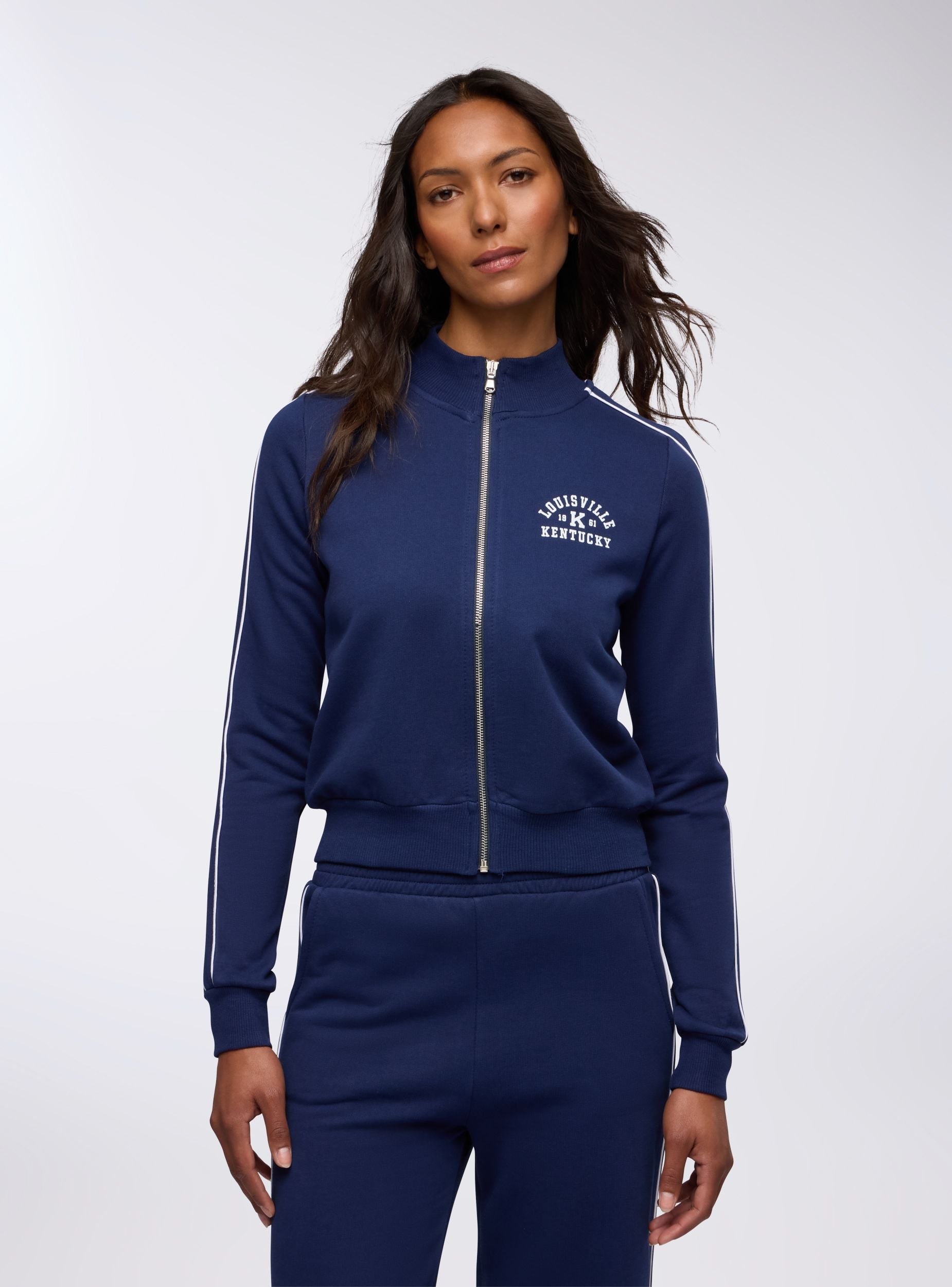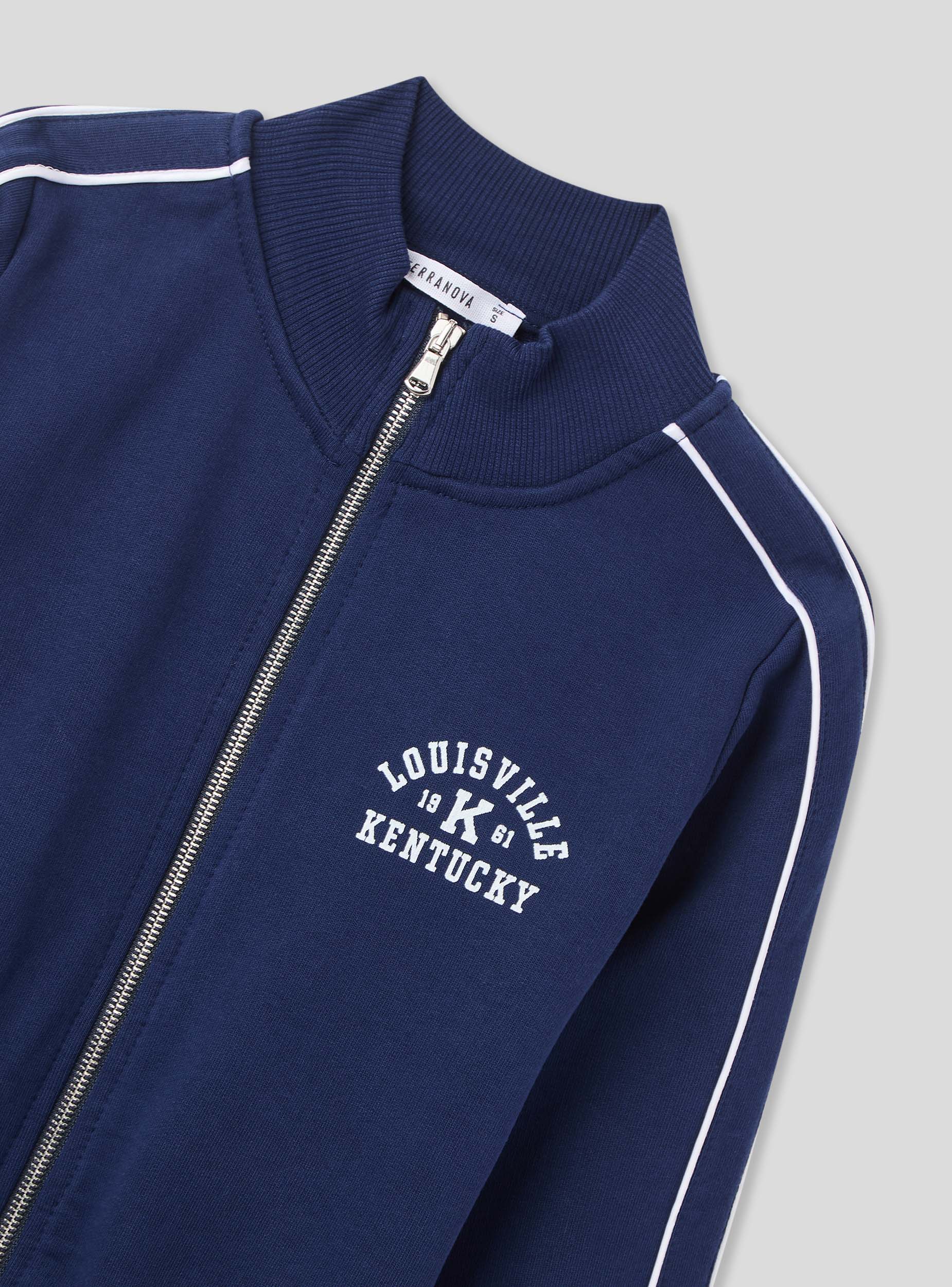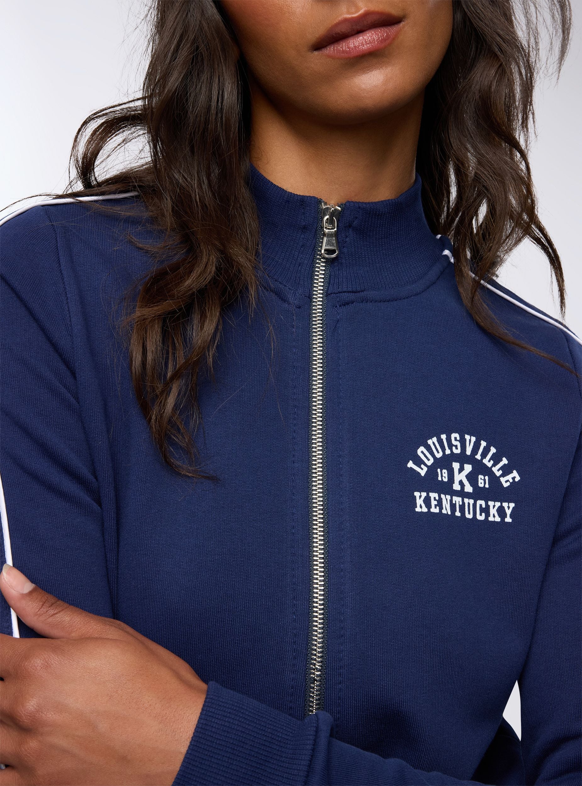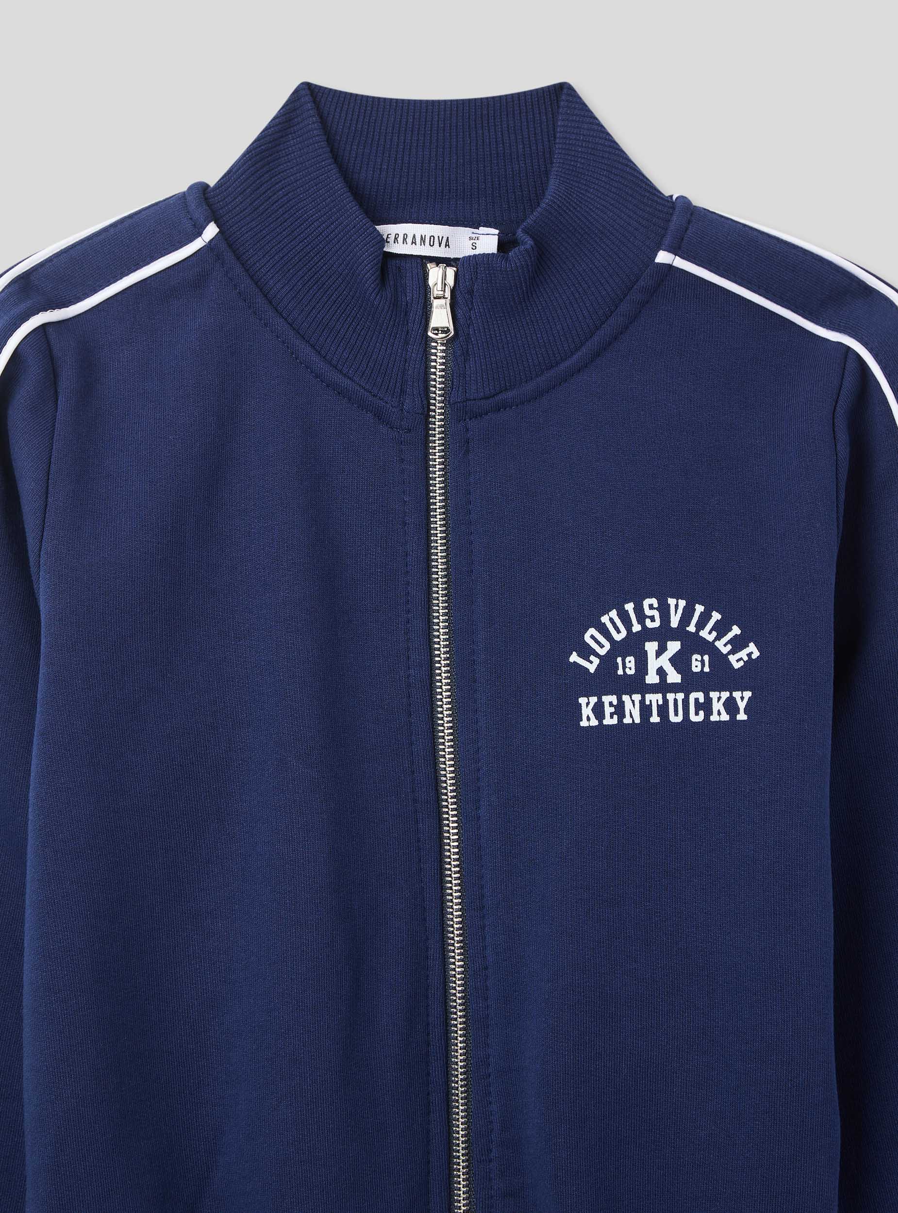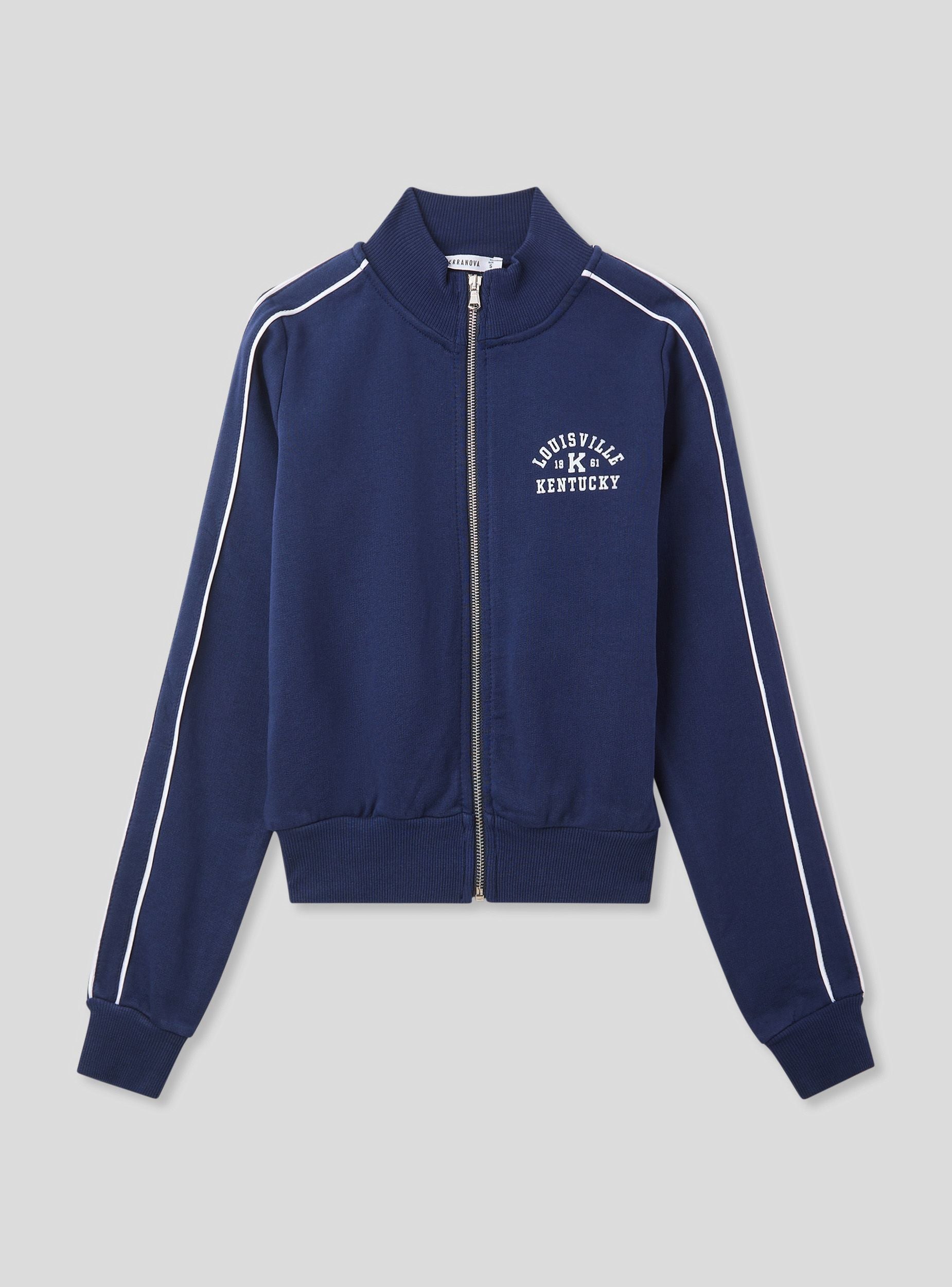 Felpa da donna con zip e collo alto, senza cappuccio, dallo stile college sportivo. Il dettaglio piping a contrasto lungo le maniche e la stampa frontale in stile college richiamano un'estetica vintage americana. Perfetta da indossare con joggers o jeans per un look casual dal gusto retrò, è ideale per il tempo libero, le passeggiate in città o le giornate rilassate. Il fondo e i polsini a costine garantiscono una vestibilità comoda.Dettagli