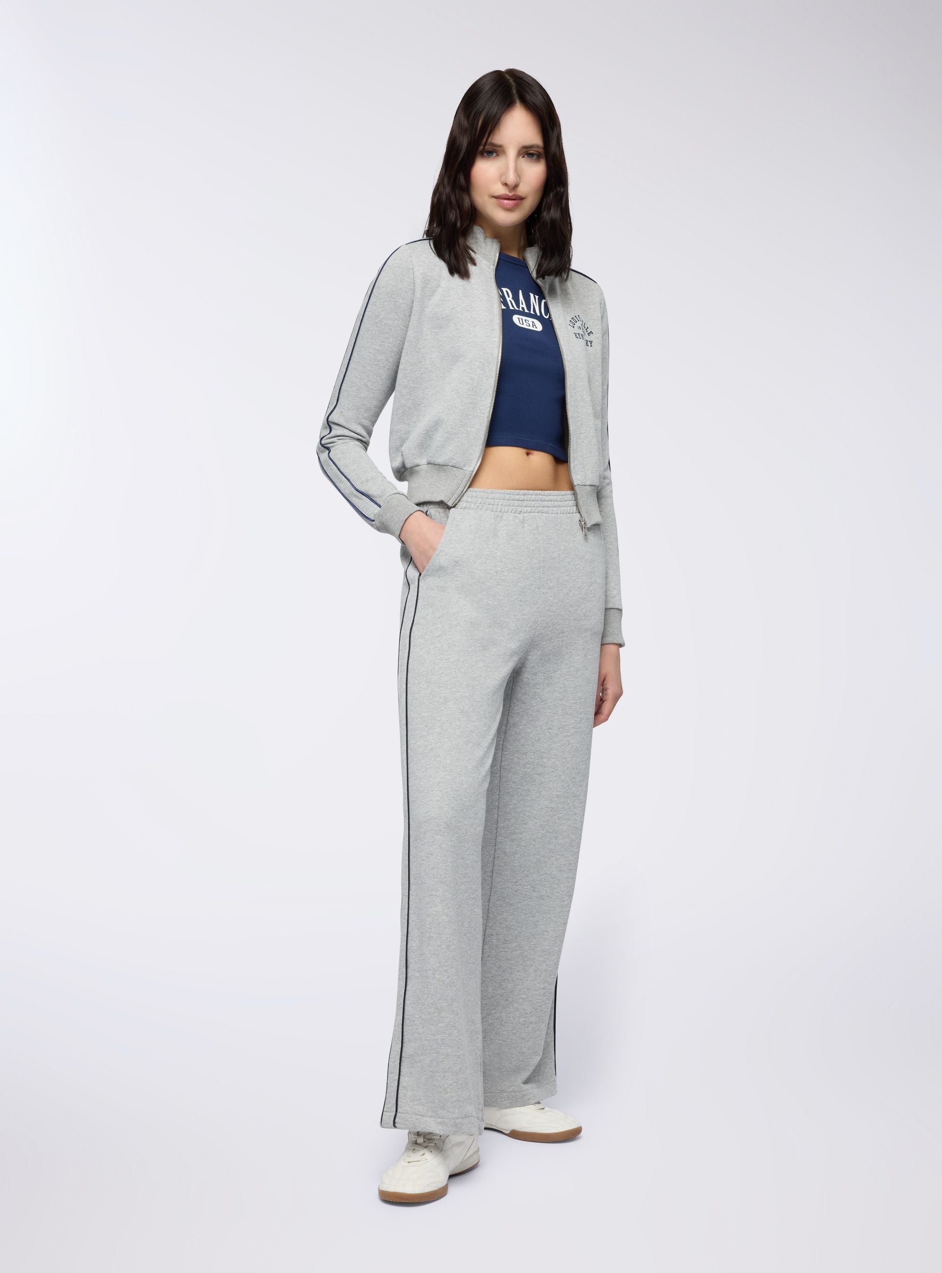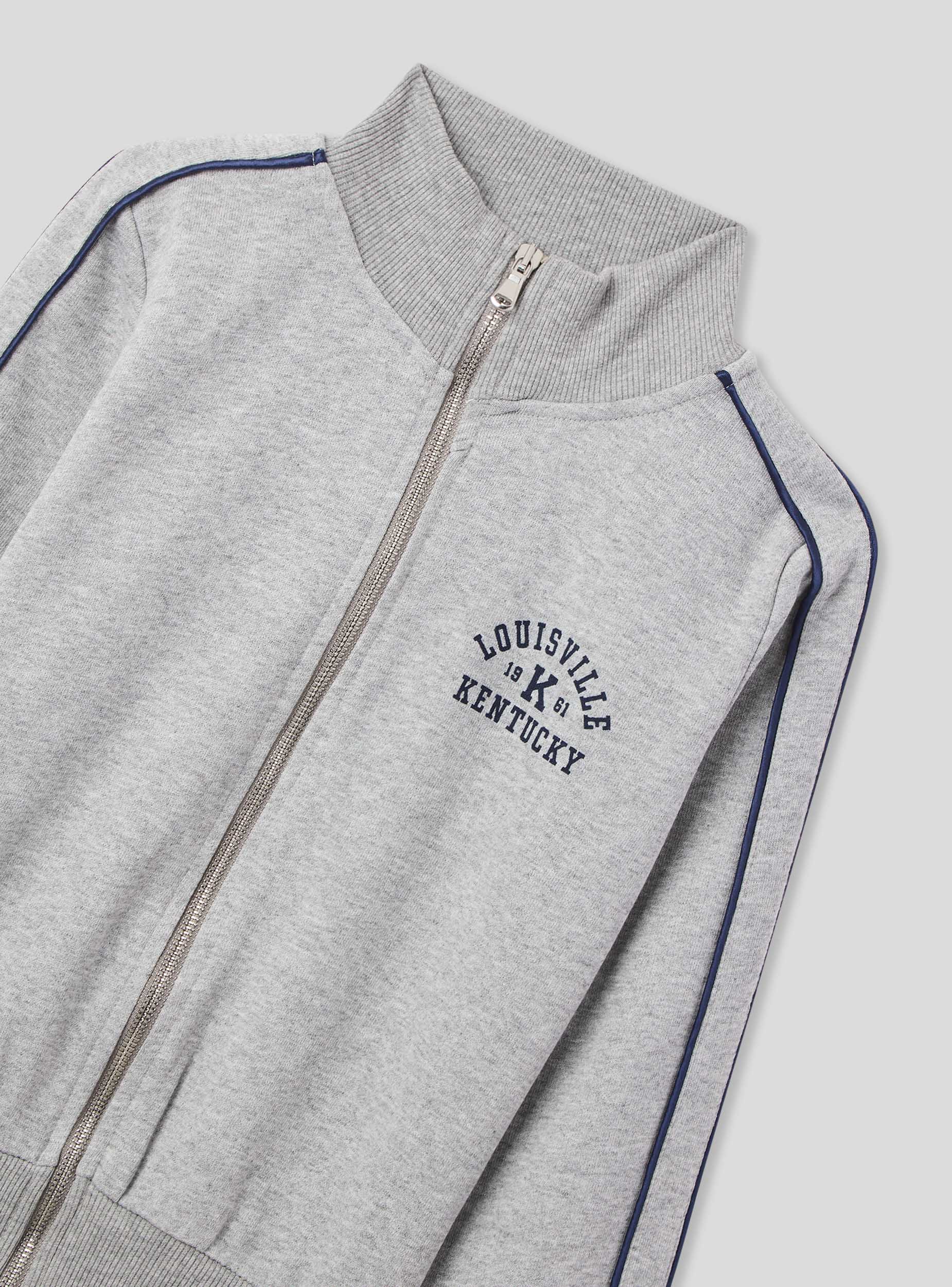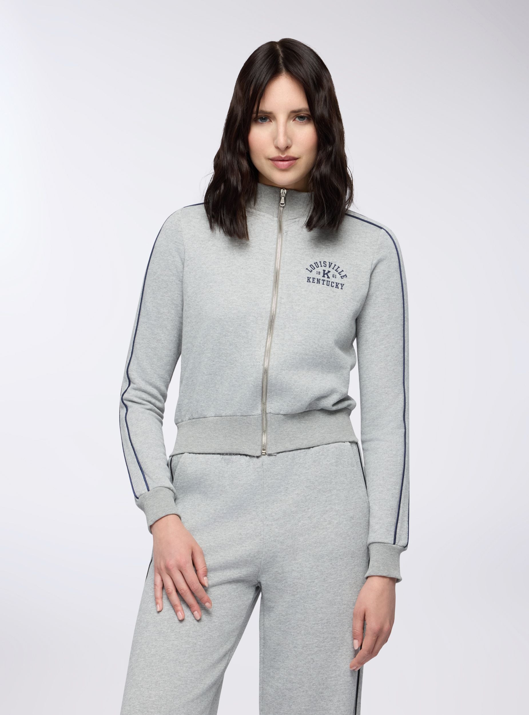 Felpa da donna con zip e collo alto, senza cappuccio, dallo stile college sportivo. Il dettaglio piping a contrasto lungo le maniche e la stampa frontale in stile college richiamano un'estetica vintage americana. Perfetta da indossare con joggers o jeans per un look casual dal gusto retrò, è ideale per il tempo libero, le passeggiate in città o le giornate rilassate. Il fondo e i polsini a costine garantiscono una vestibilità comoda.Dettagli