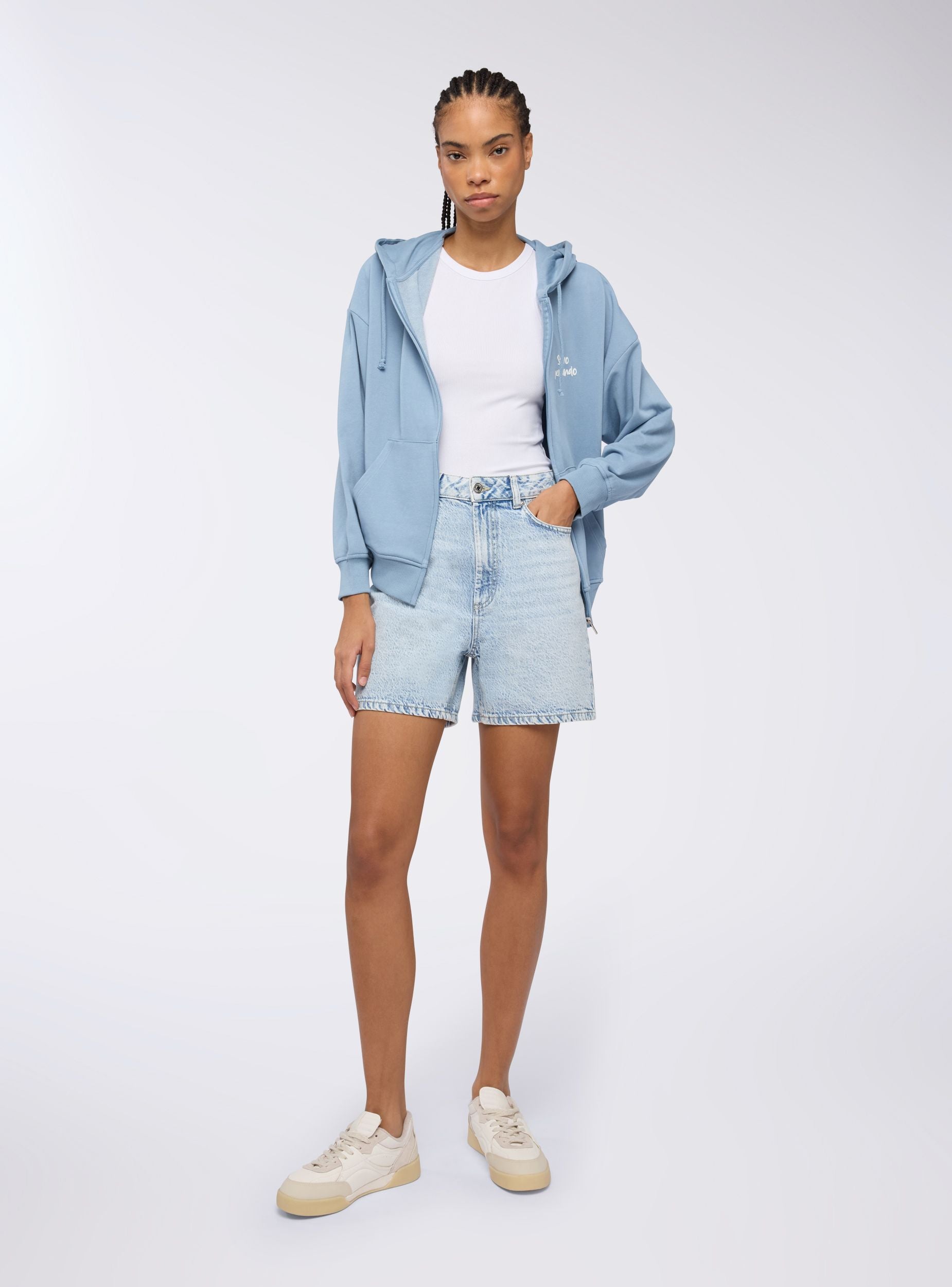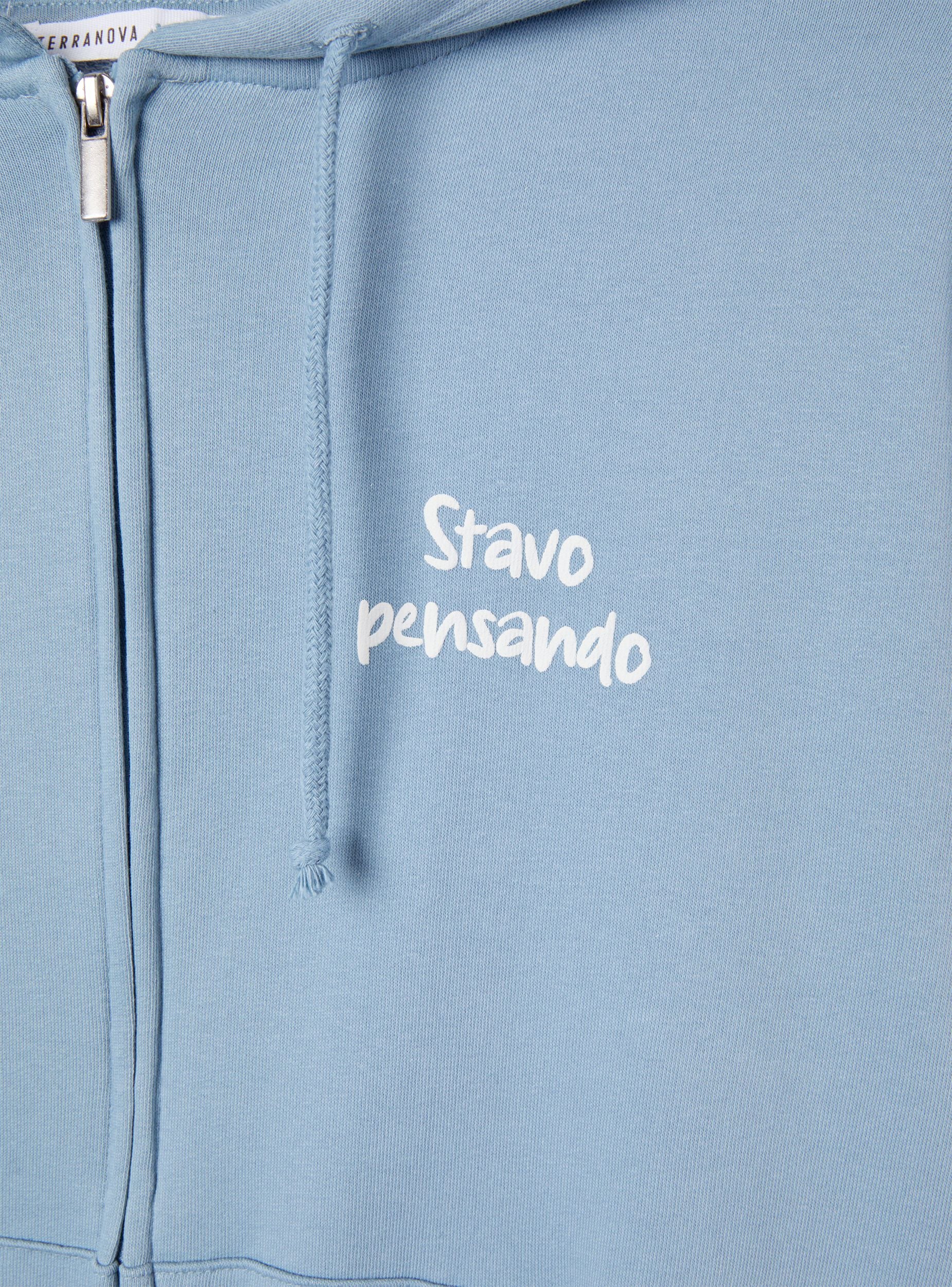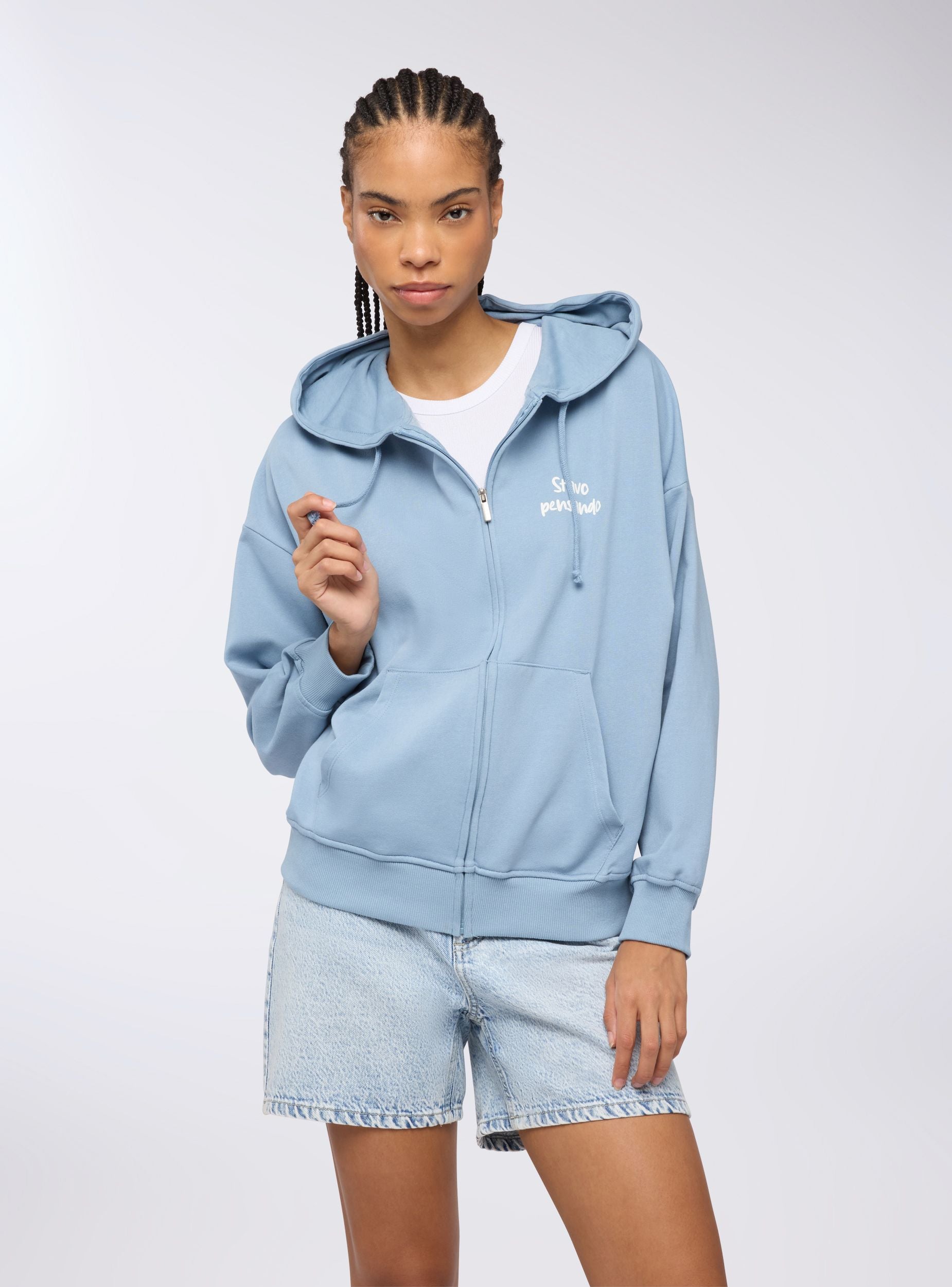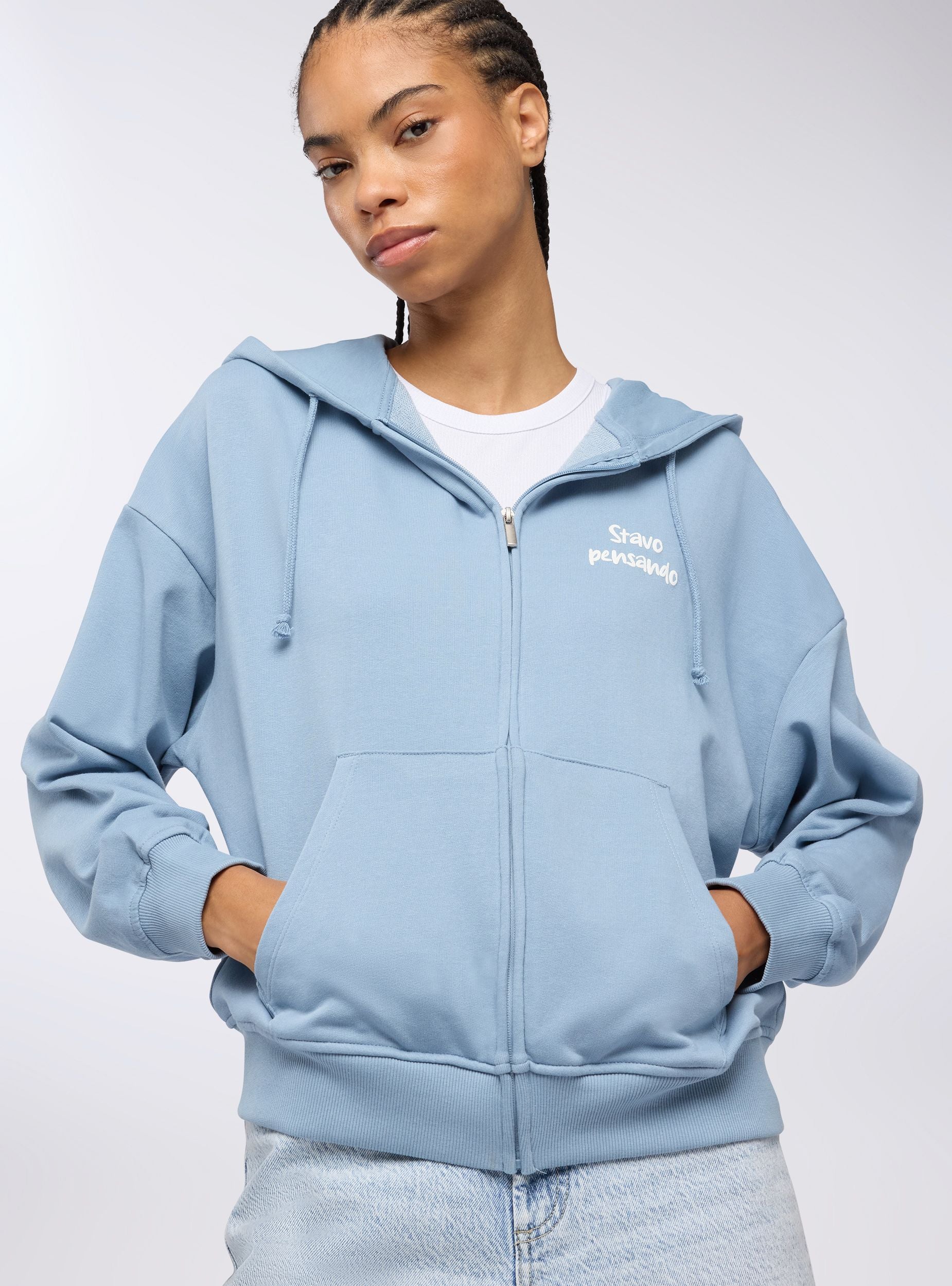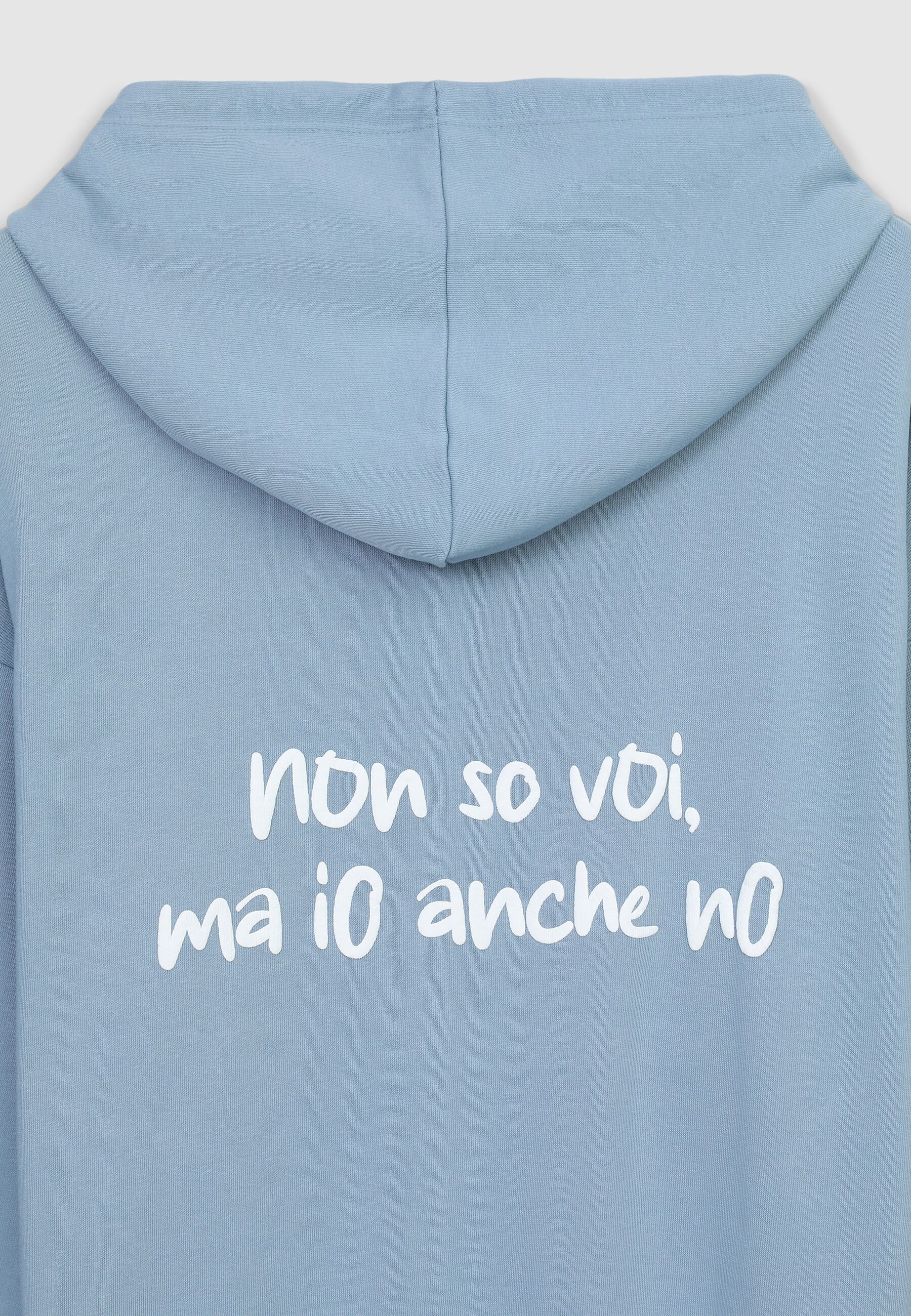 Felpa leggera da donna a maniche lunghe con zip frontale, cappuccio regolabile tramite coulisse e pratiche tasche a marsupio. La stampa con scritta simpatica sul davanti e sul retro aggiunge un tocco originale e ironico. Perfetta per un look casual e rilassato, si abbina a jeans, joggers o leggings, ideale per il tempo libero, le uscite con amici o i momenti di relax.Dettagli