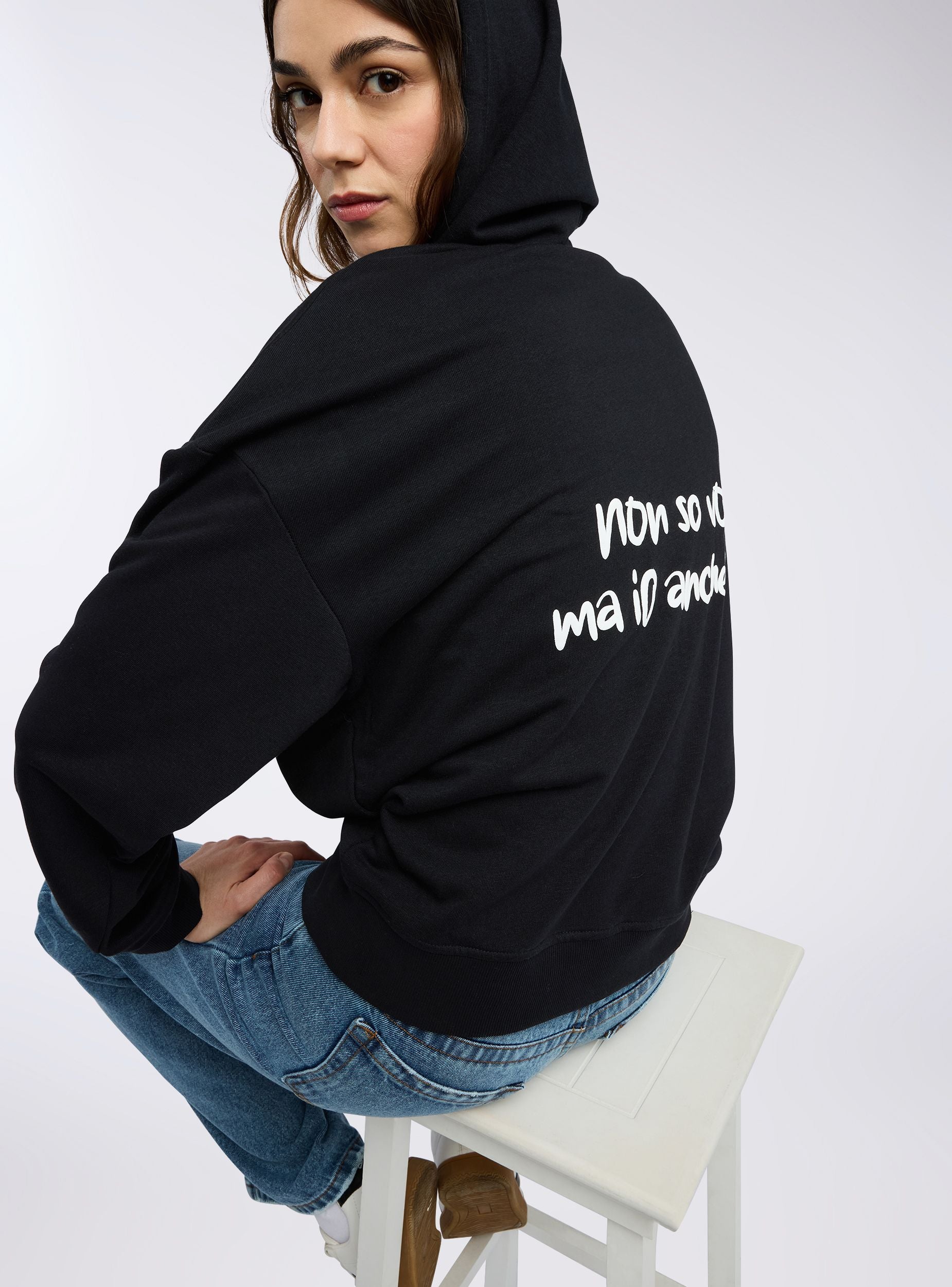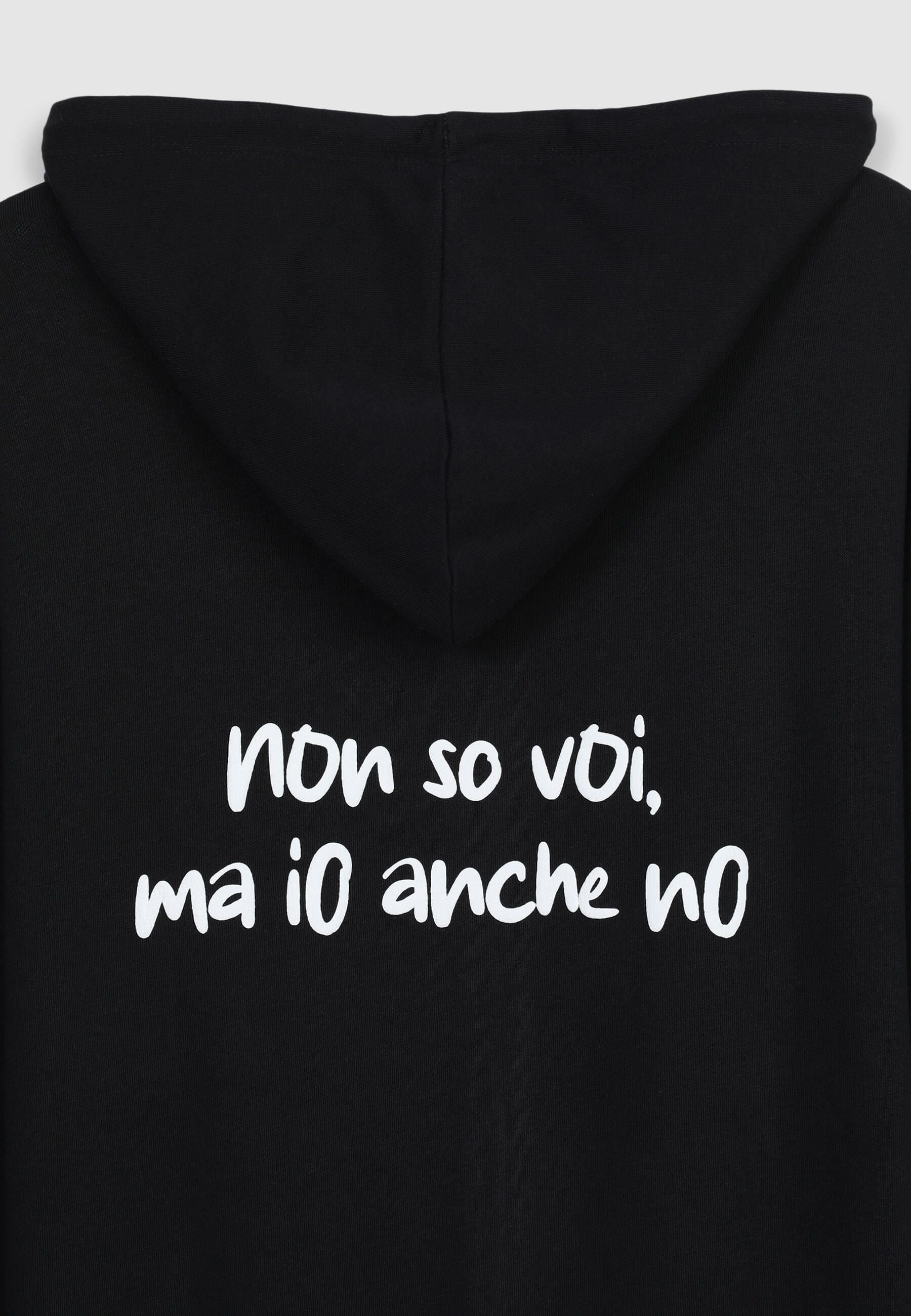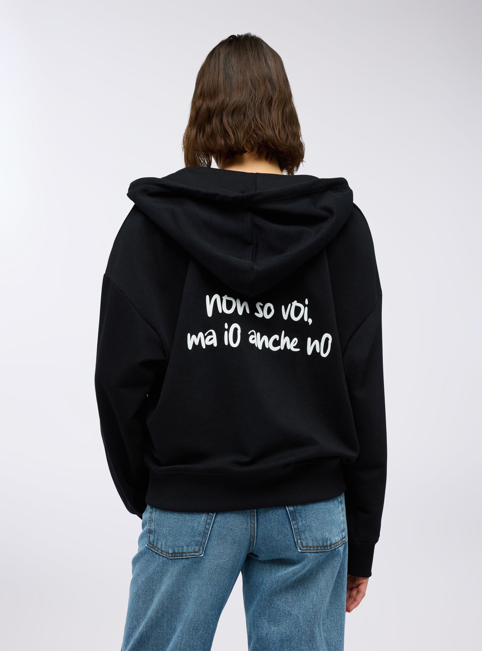 Felpa leggera da donna a maniche lunghe con zip frontale, cappuccio regolabile tramite coulisse e pratiche tasche a marsupio. La stampa con scritta simpatica sul davanti e sul retro aggiunge un tocco originale e ironico. Perfetta per un look casual e rilassato, si abbina a jeans, joggers o leggings, ideale per il tempo libero, le uscite con amici o i momenti di relax.Dettagli