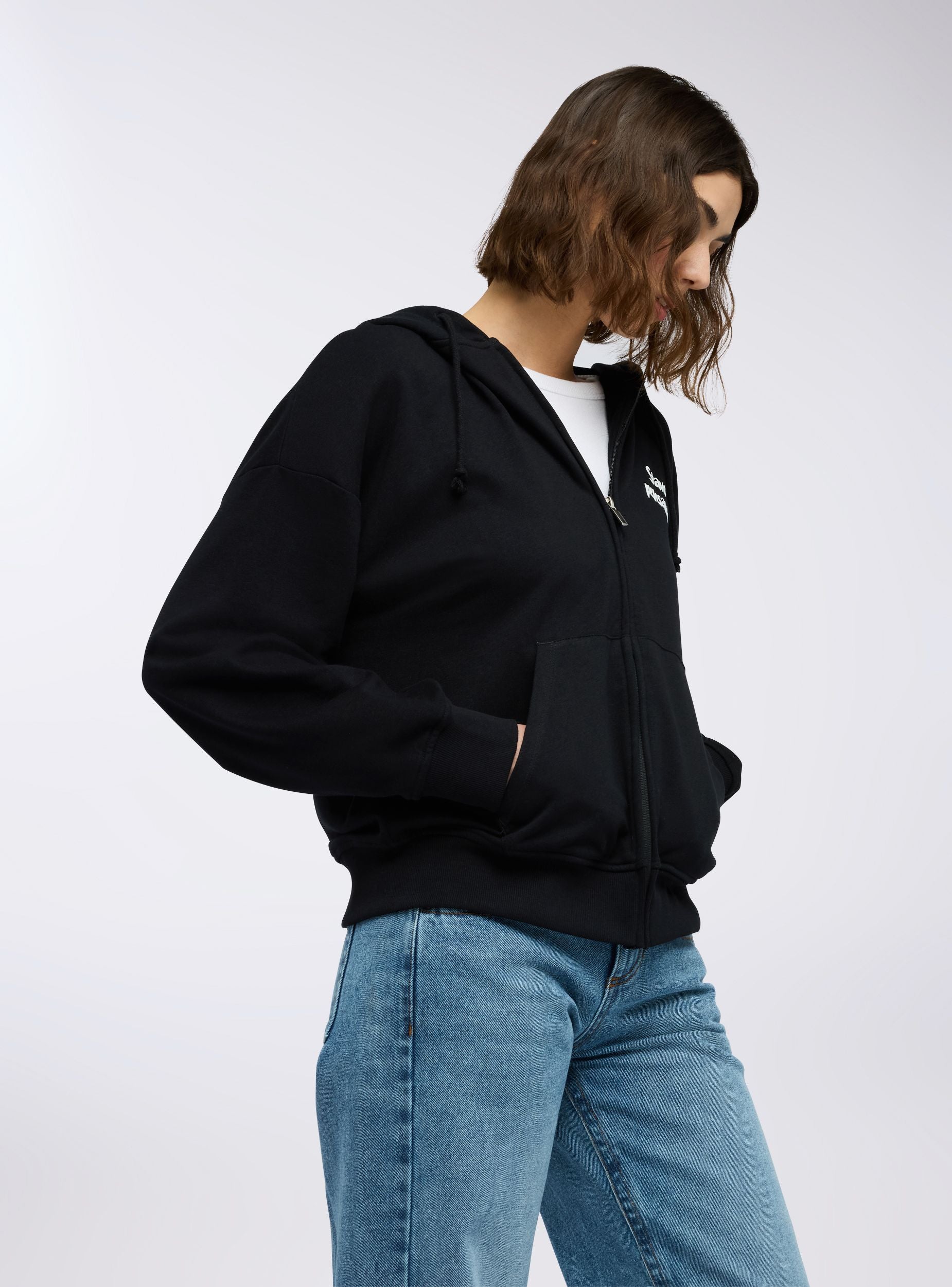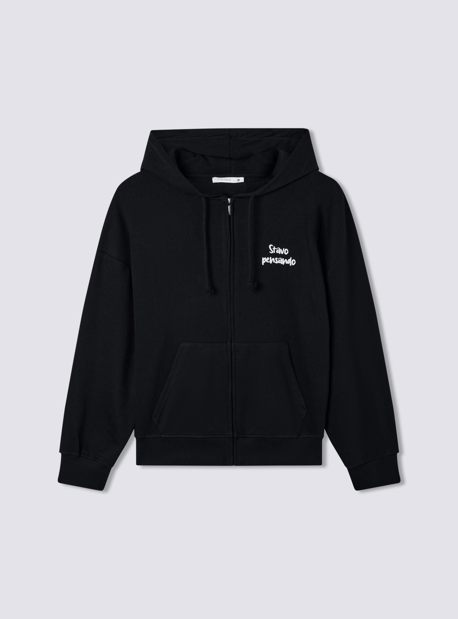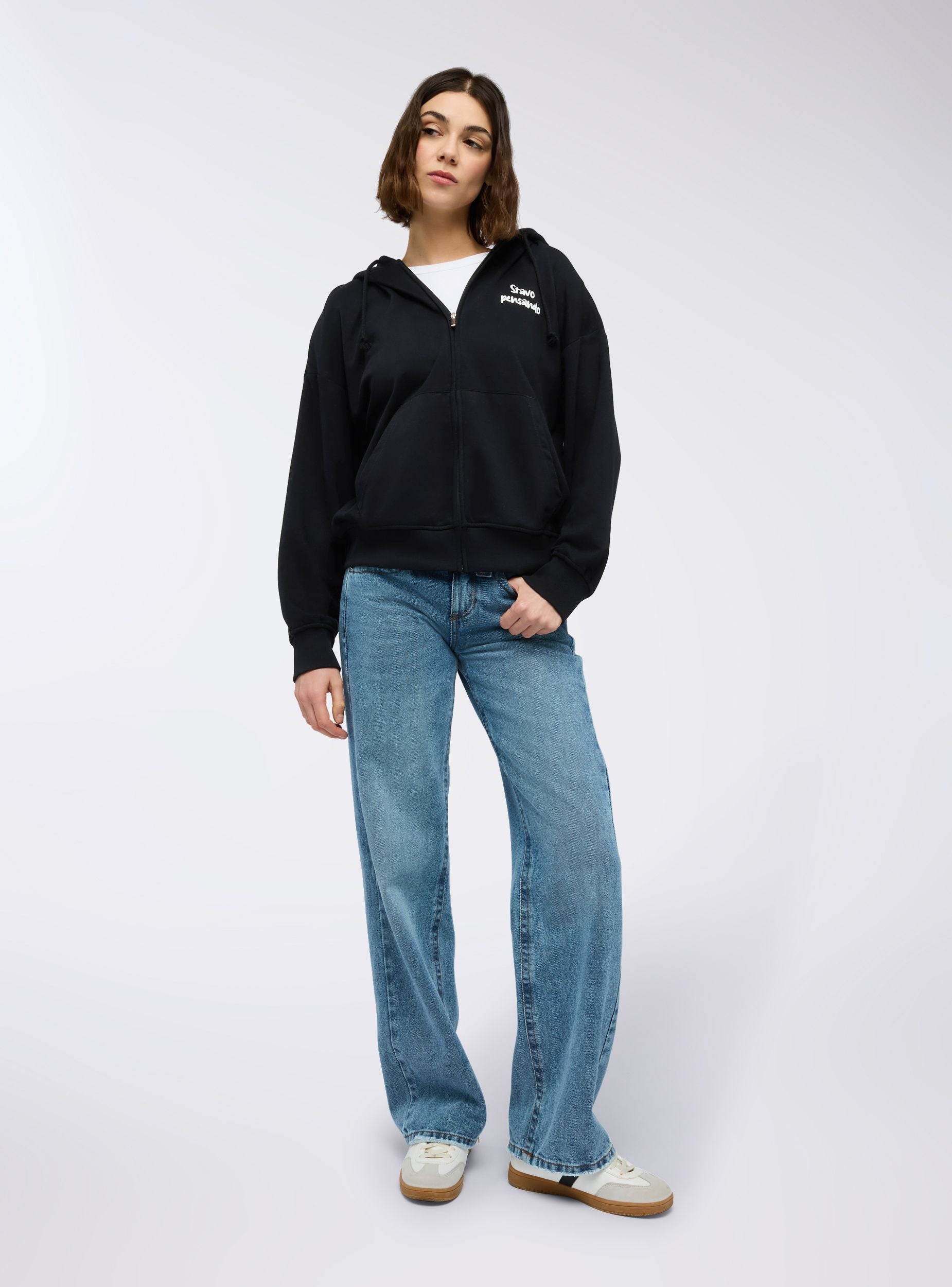 Felpa leggera da donna a maniche lunghe con zip frontale, cappuccio regolabile tramite coulisse e pratiche tasche a marsupio. La stampa con scritta simpatica sul davanti e sul retro aggiunge un tocco originale e ironico. Perfetta per un look casual e rilassato, si abbina a jeans, joggers o leggings, ideale per il tempo libero, le uscite con amici o i momenti di relax.Dettagli