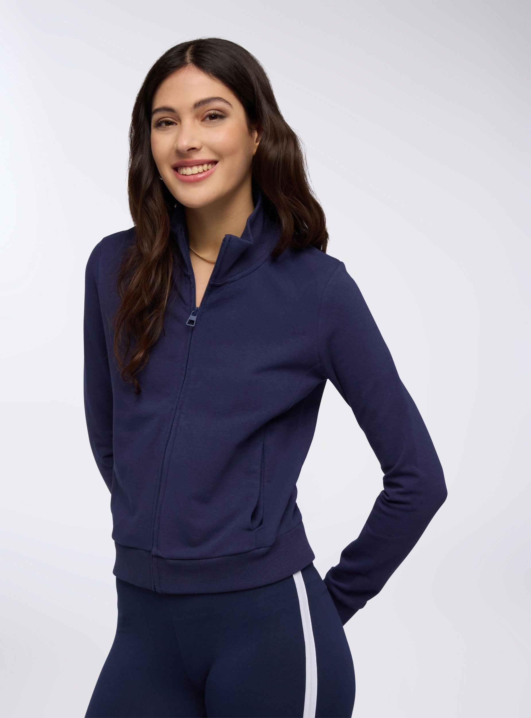 Felpa leggera da donna a maniche lunghe, con zip frontale e collo alto che dona un tocco sportivo e versatile. Senza cappuccio, è dotata di pratiche tasche laterali, perfette per il massimo comfort. Ideale per look casual e dinamici, si abbina a jeans, joggers o leggings, adattandosi a giornate di relax, attività all’aperto o outfit pratici e moderni per il tempo libero.Dettagli