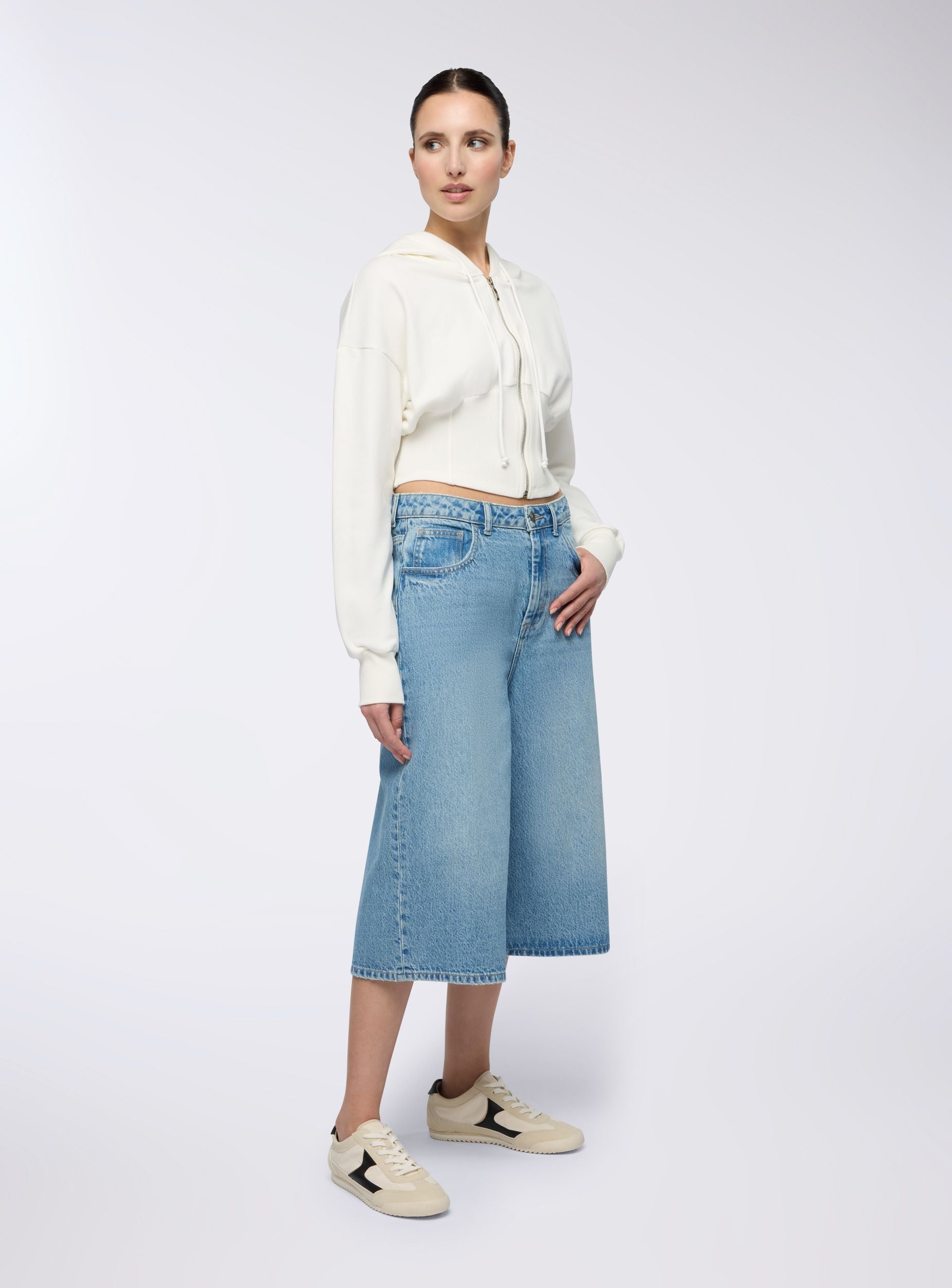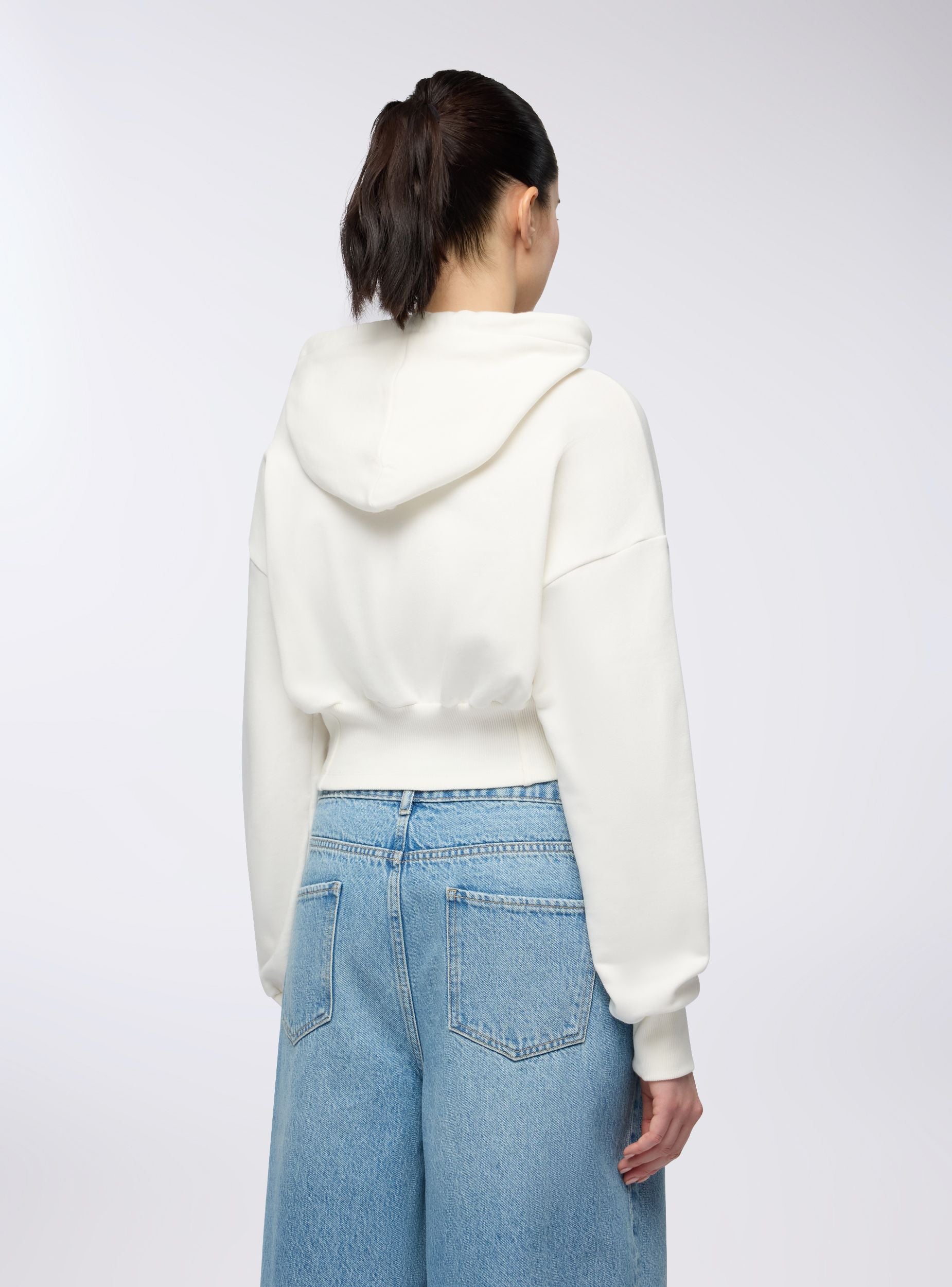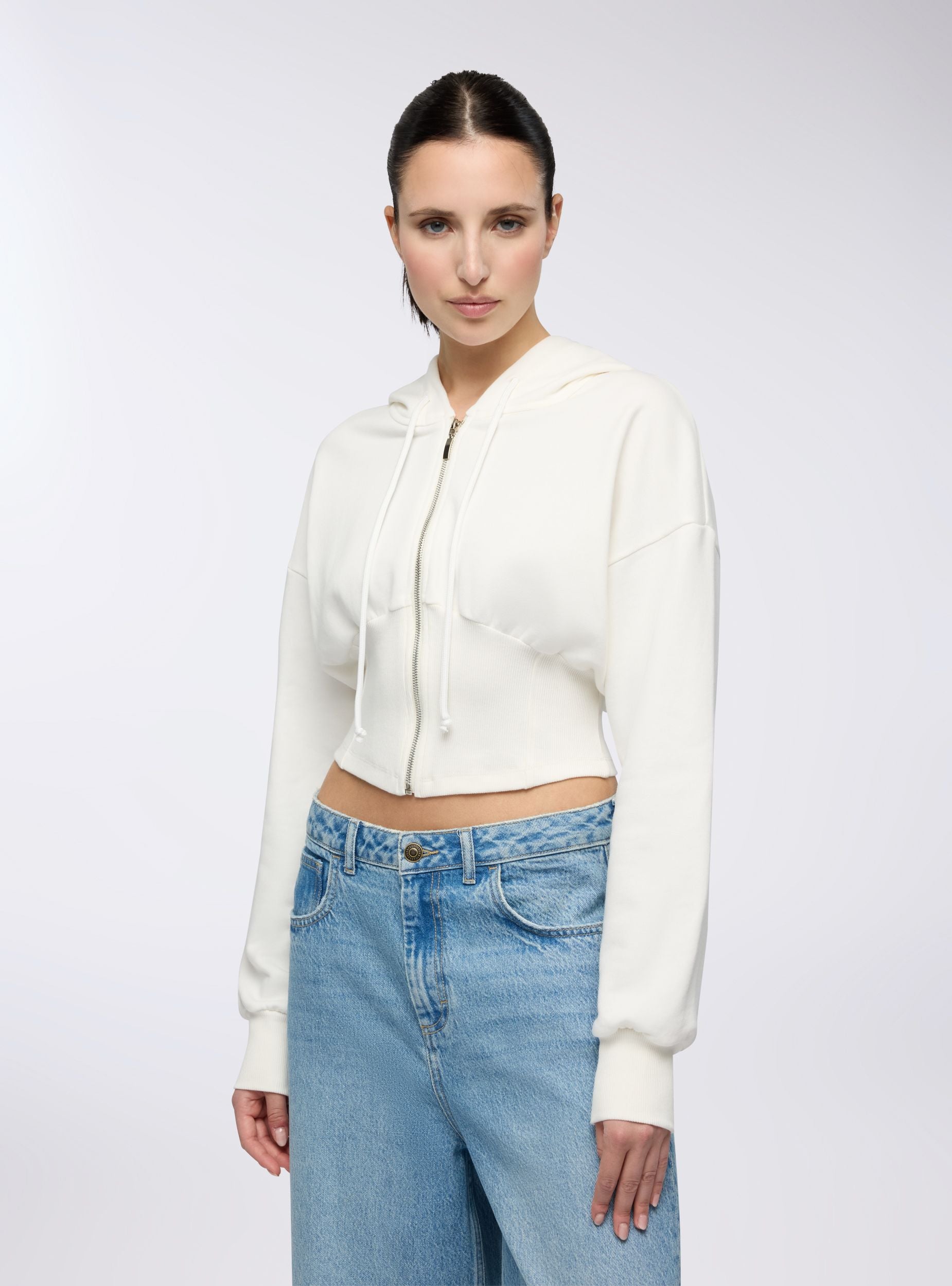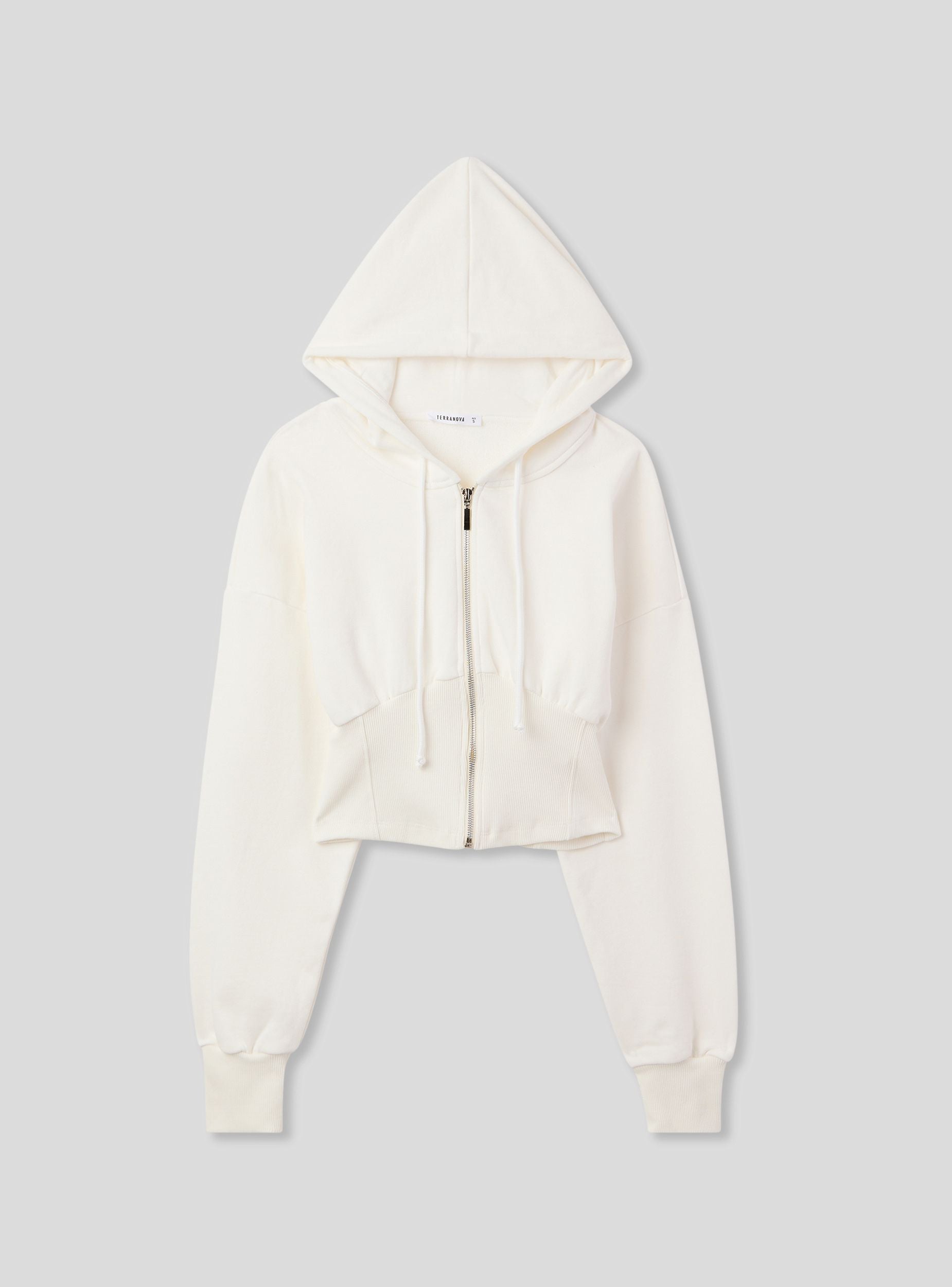 Felpa leggera da donna con taglio corto e dettaglio effetto corsetto, perfetta per valorizzare il punto vita con uno stile sportivo ma femminile. Il design con cappuccio e zip frontale aggiunge un tocco urban, ideale da abbinare a jeans a vita alta o joggers per un look comodo e grintoso. Le maniche lunghe con polsini e la struttura sagomata offrono una vestibilità aderente e confortevole.Dettagli