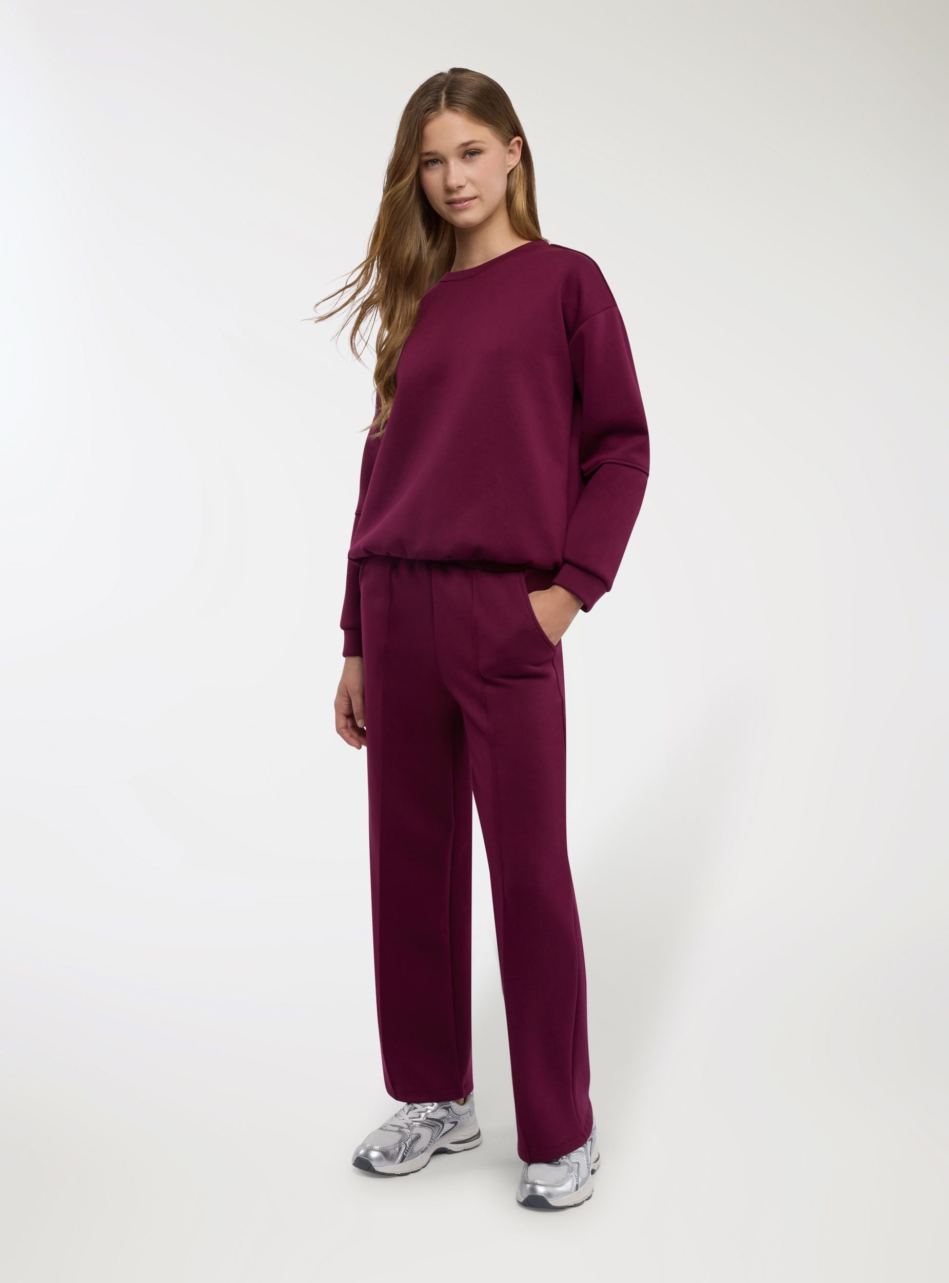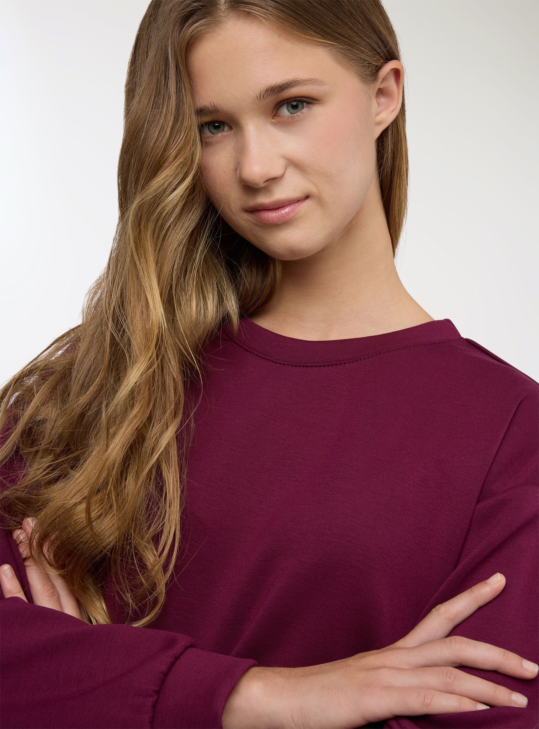 Felpa da donna senza cappuccio e senza zip, tinta unita. Modello crop con girocollo e maniche lunghe con spalle leggermente scese, polsini e fondo con elastico per una vestibilità confortevole. Ideale per look casual o urban, perfetta su jeans o pantaloni tuta per il tempo libero. Tessuto pesante.Dettagli