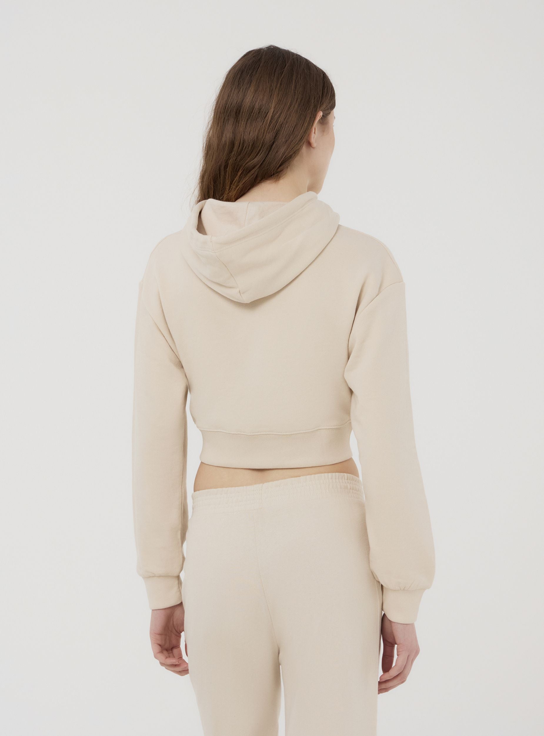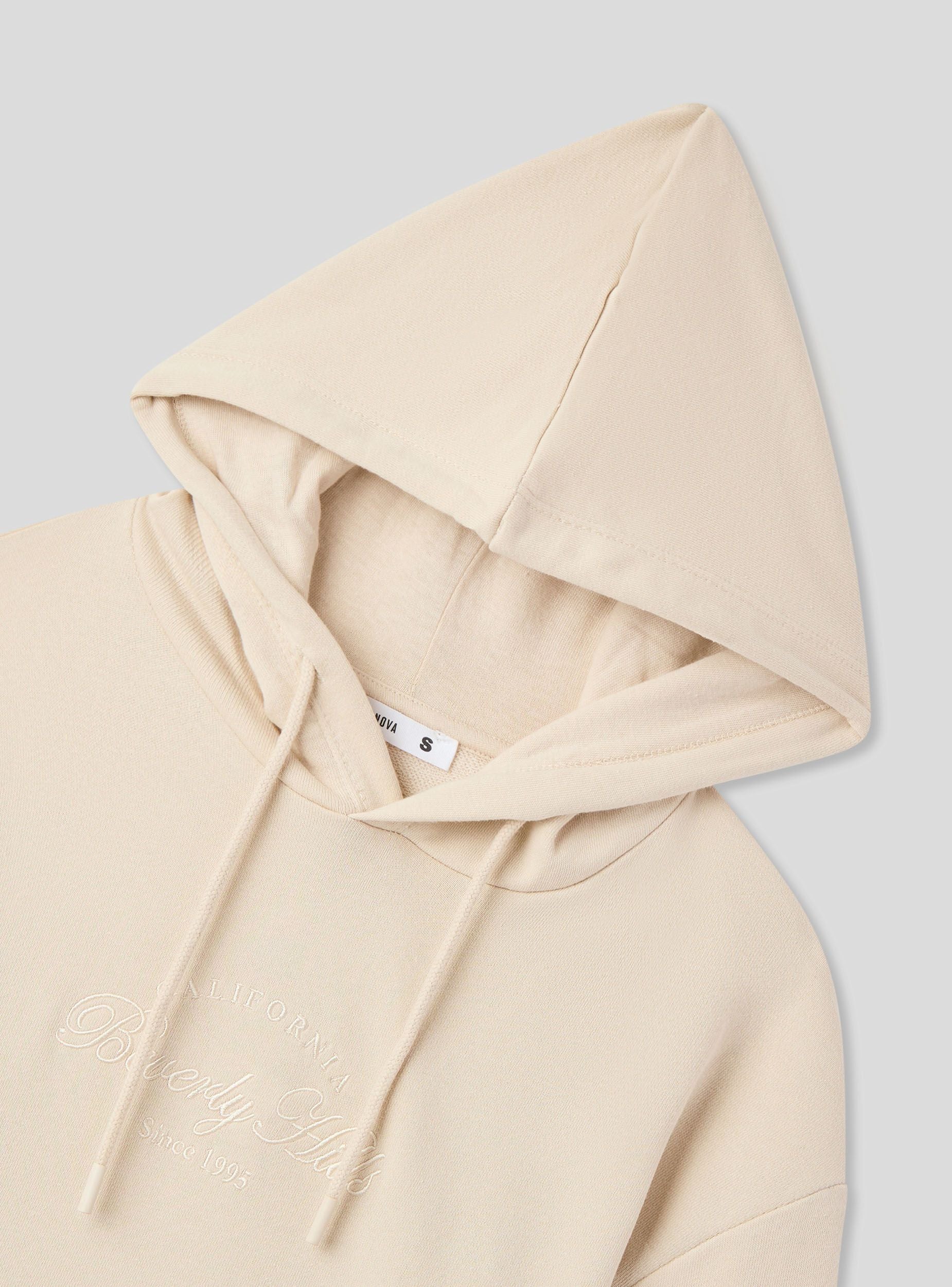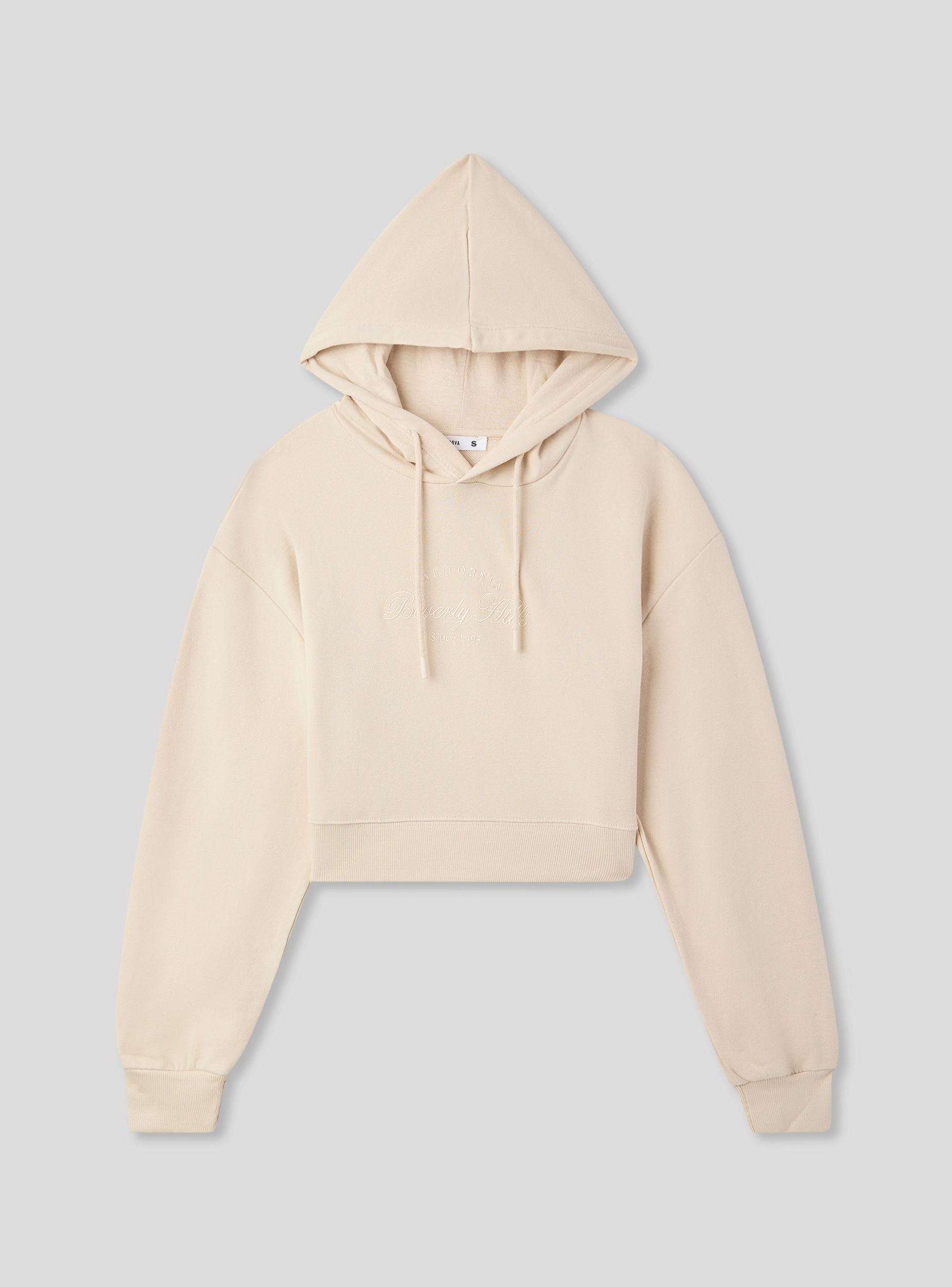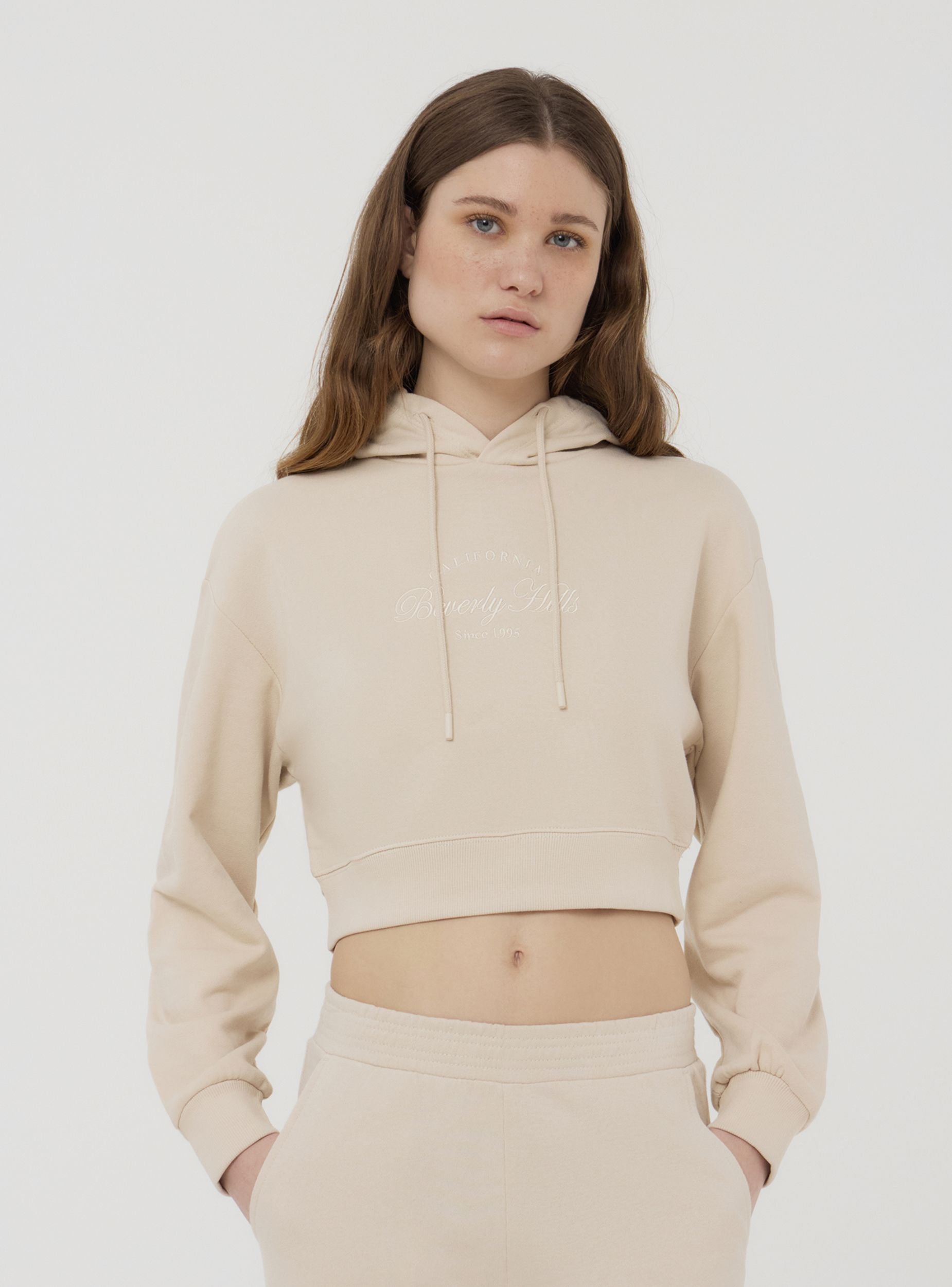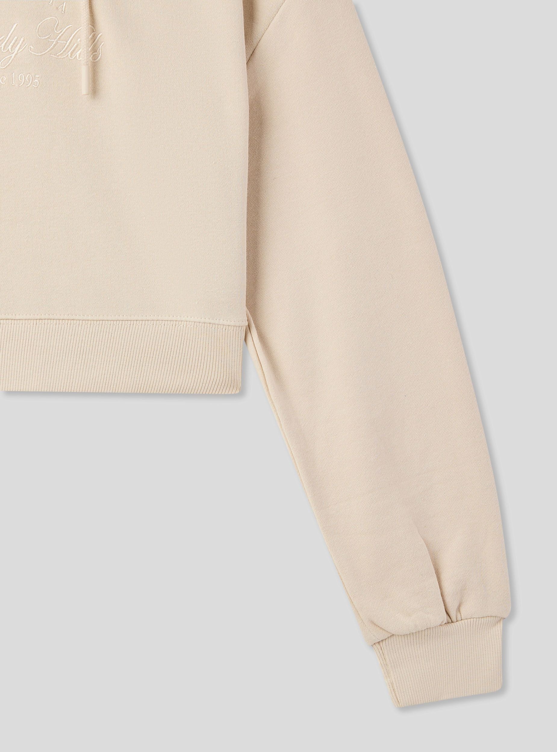 Felpa leggera da donna dal taglio crop, con maniche lunghe e cappuccio regolabile tramite coulisse. Il modello chiuso senza zip si distingue per la scritta ricamata in stile college, perfetta per un look trendy e sportivo. Ideale da abbinare a pantaloni a vita alta, joggers o leggings, è perfetta per il tempo libero, le uscite informali e per chi ama un tocco urban nei propri outfit.Dettagli