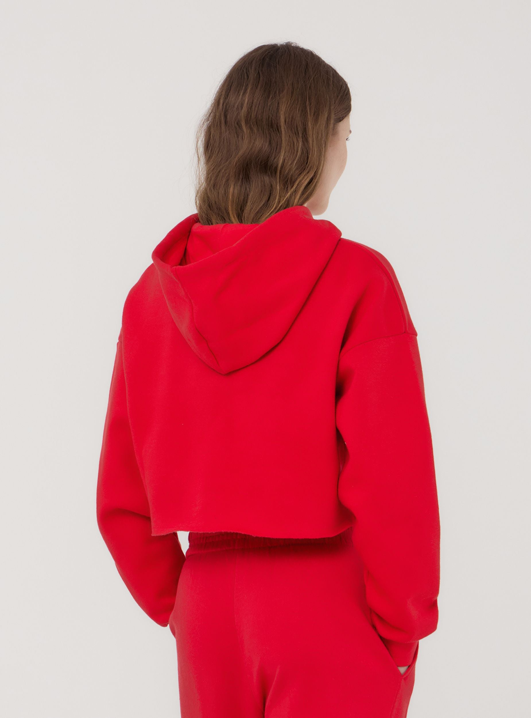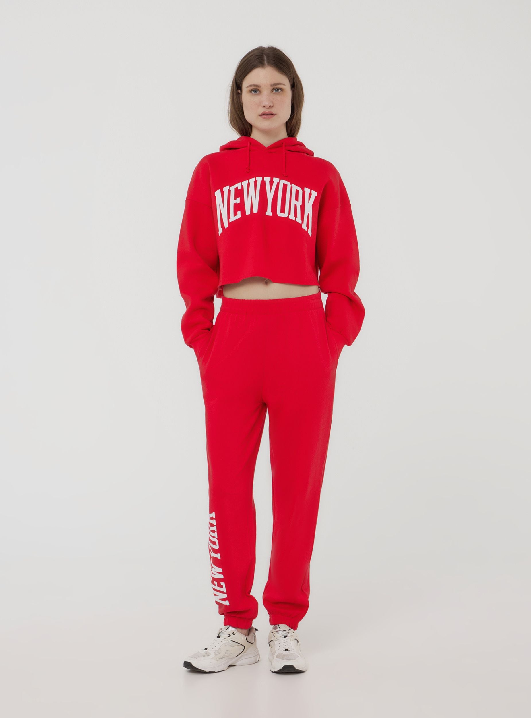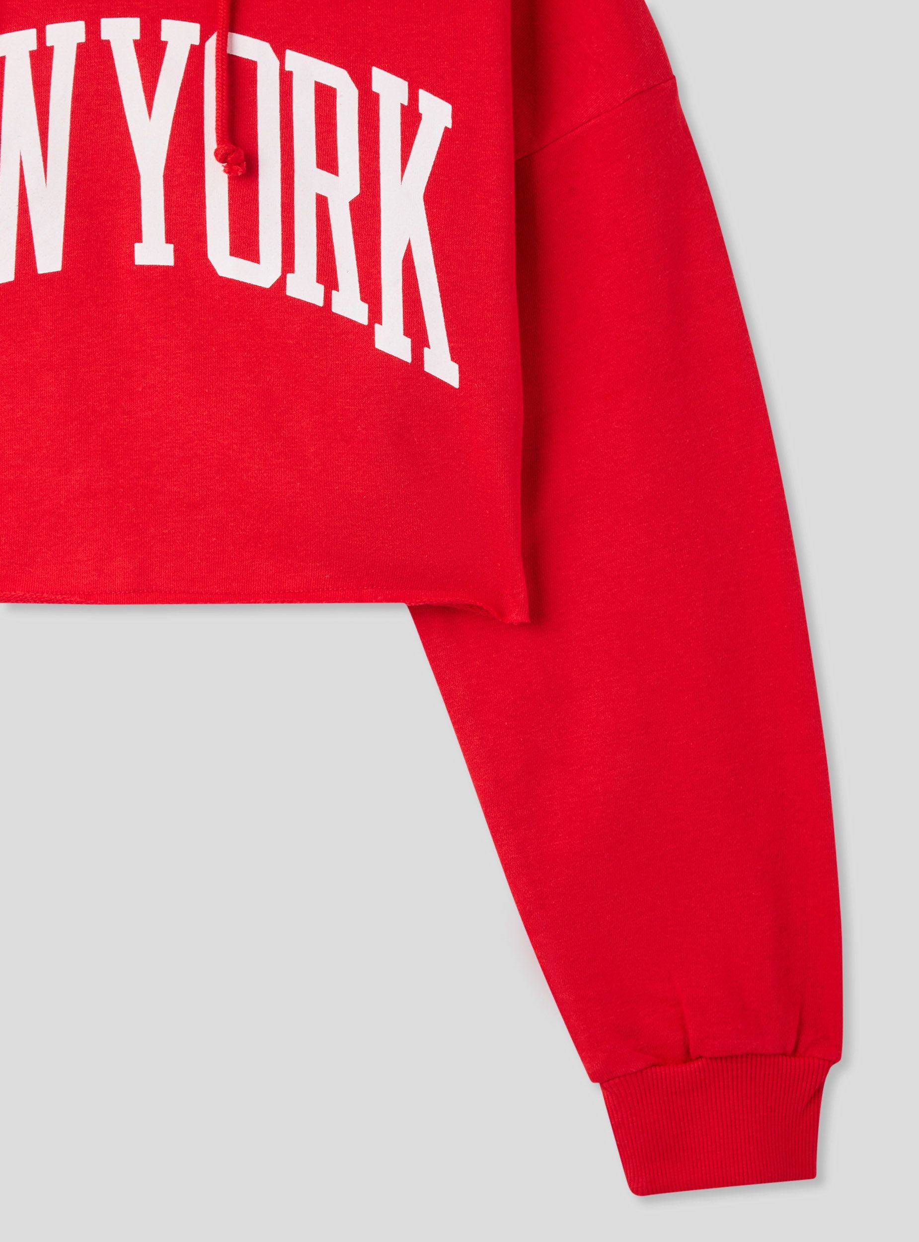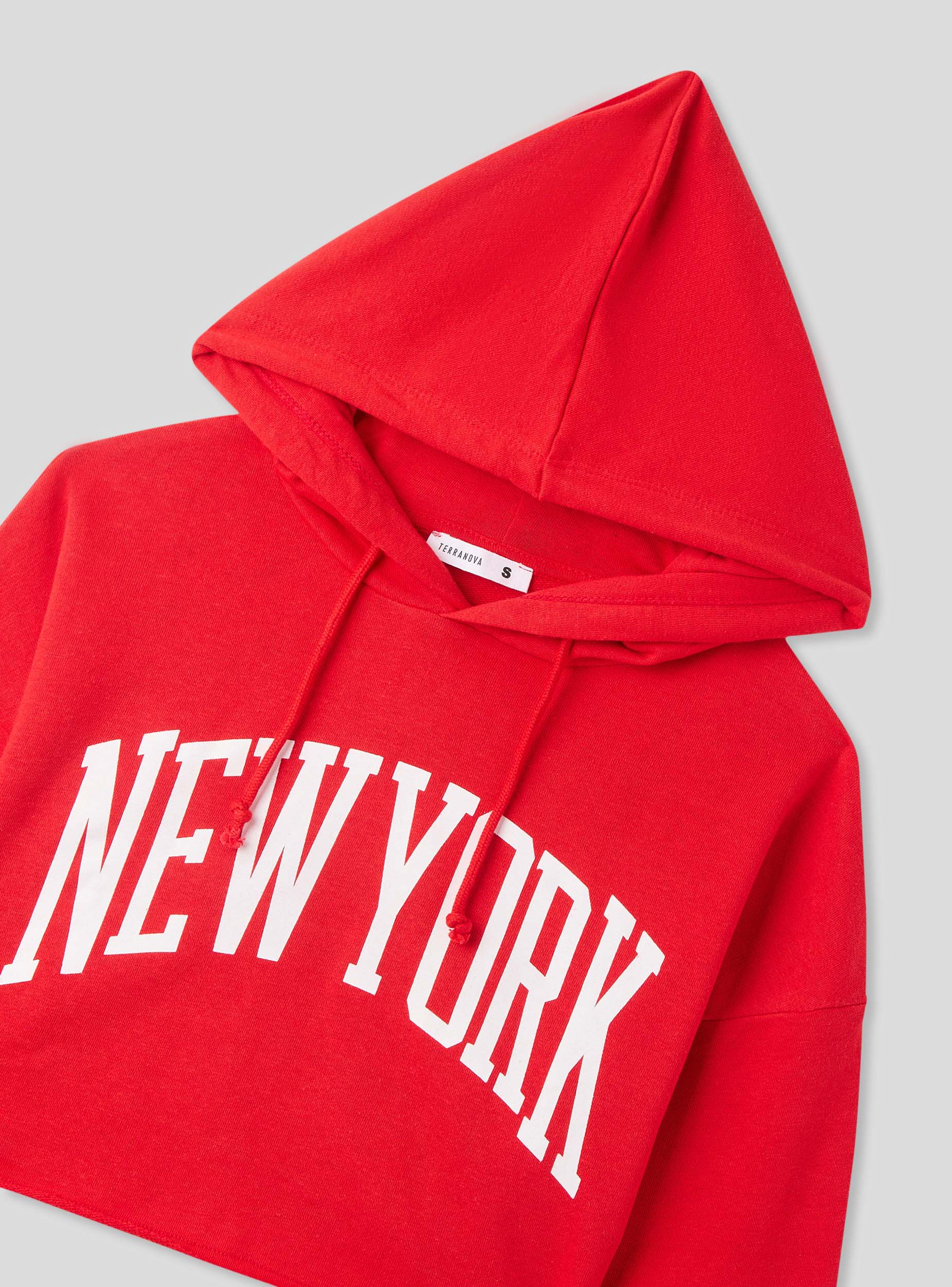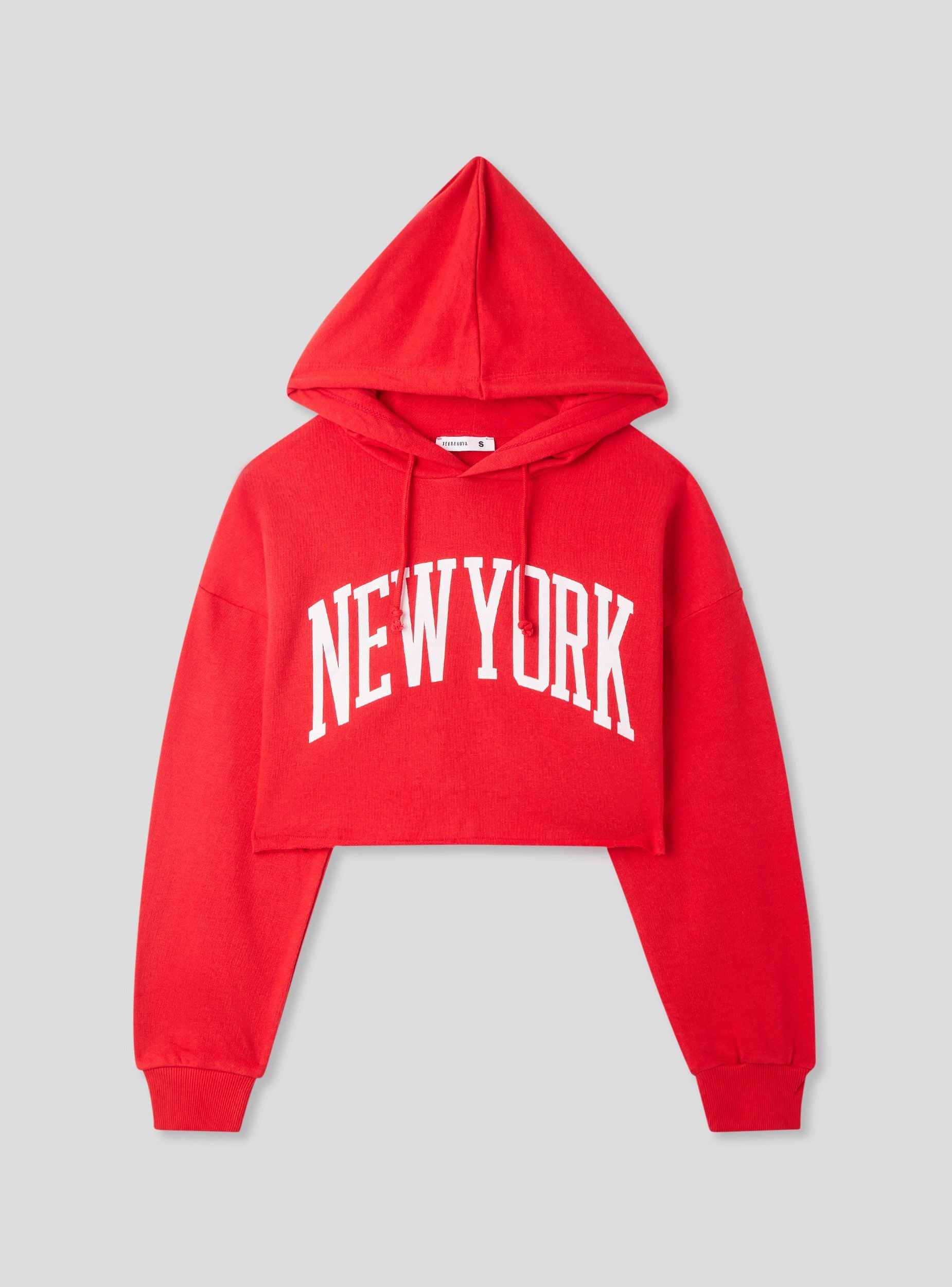Felpa leggera da donna, dalla vestibilità crop. Modello dotato di cappuccio regolabile tramite coulisse. La felpa presta una stampa frontale in stile college americano con la scritta New York. Ideale per outfit casual e sportivi. Si abbina perfettamente con pantaloni sportivi o jeans a vita alta.Dettagli