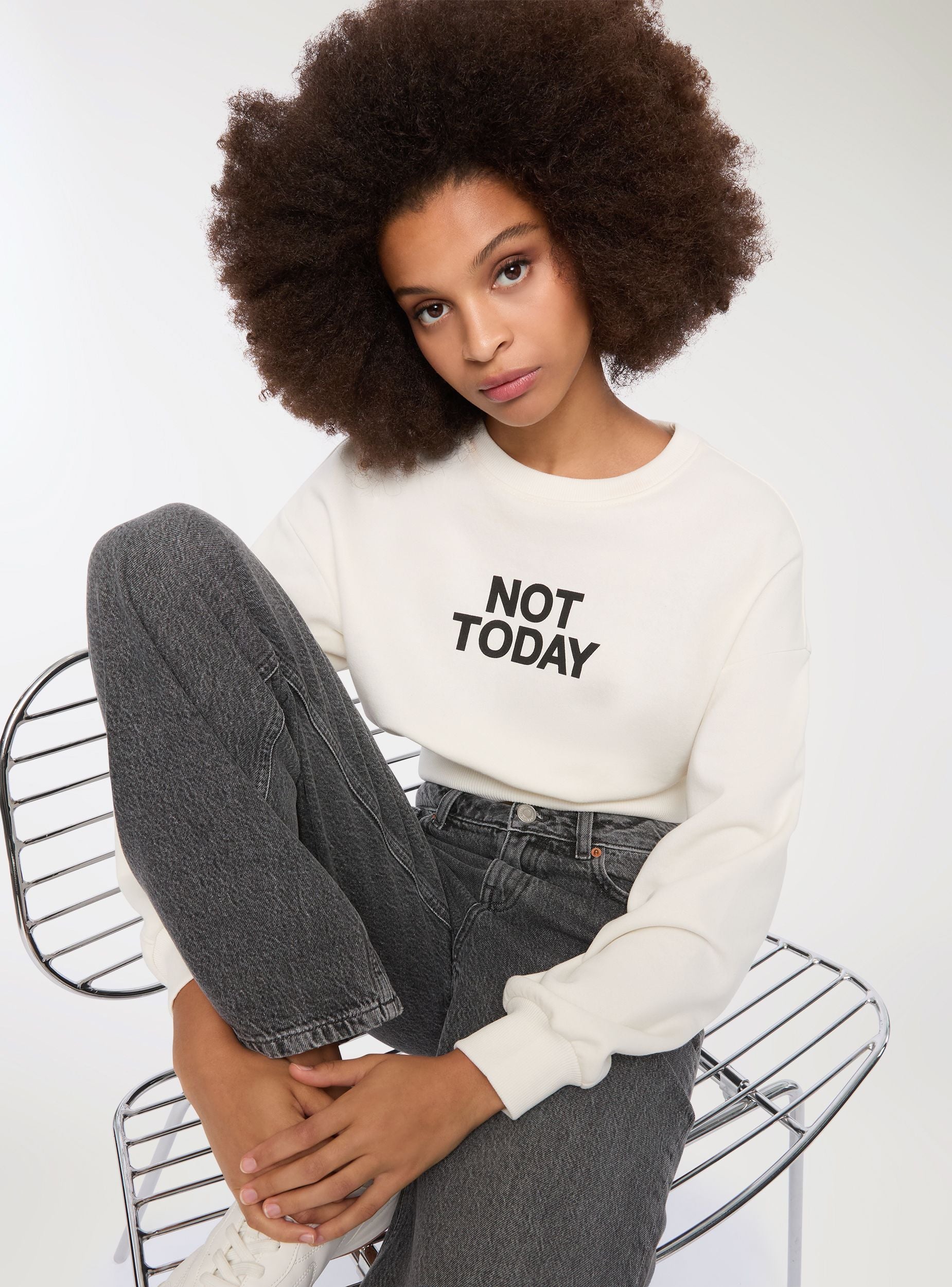 Felpa pesante da donna con scritta “Not Today” stampata sul davanti, perfetta per uno stile ironico e grintoso. Il modello cropped con fascia ampia in vita e polsi a costine valorizza la silhouette e offre una vestibilità confortevole. Realizzata in tessuto felpato è ideale per la stagione invernale. Da indossare con jeans o pantaloni relaxed per un look casual e deciso.Dettagli