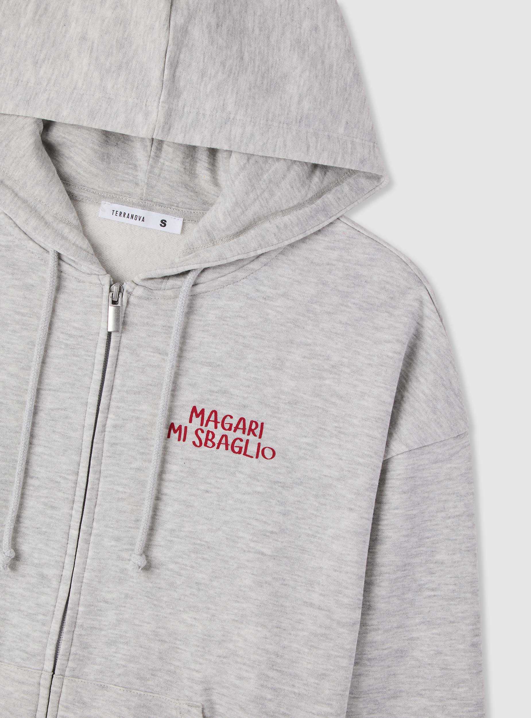 Felpa da donna con cappuccio e zip frontale, perfetta per il tempo libero e i look casual. Tasca a marsupio davanti e polsini e fondo in maglia a costine per una vestibilità confortevole. Grafica con scritta sul petto e messaggio stampato sul retro. Ideale su jeans e sneakers o sopra leggings per un outfit rilassato. Tessuto leggero.Dettagli