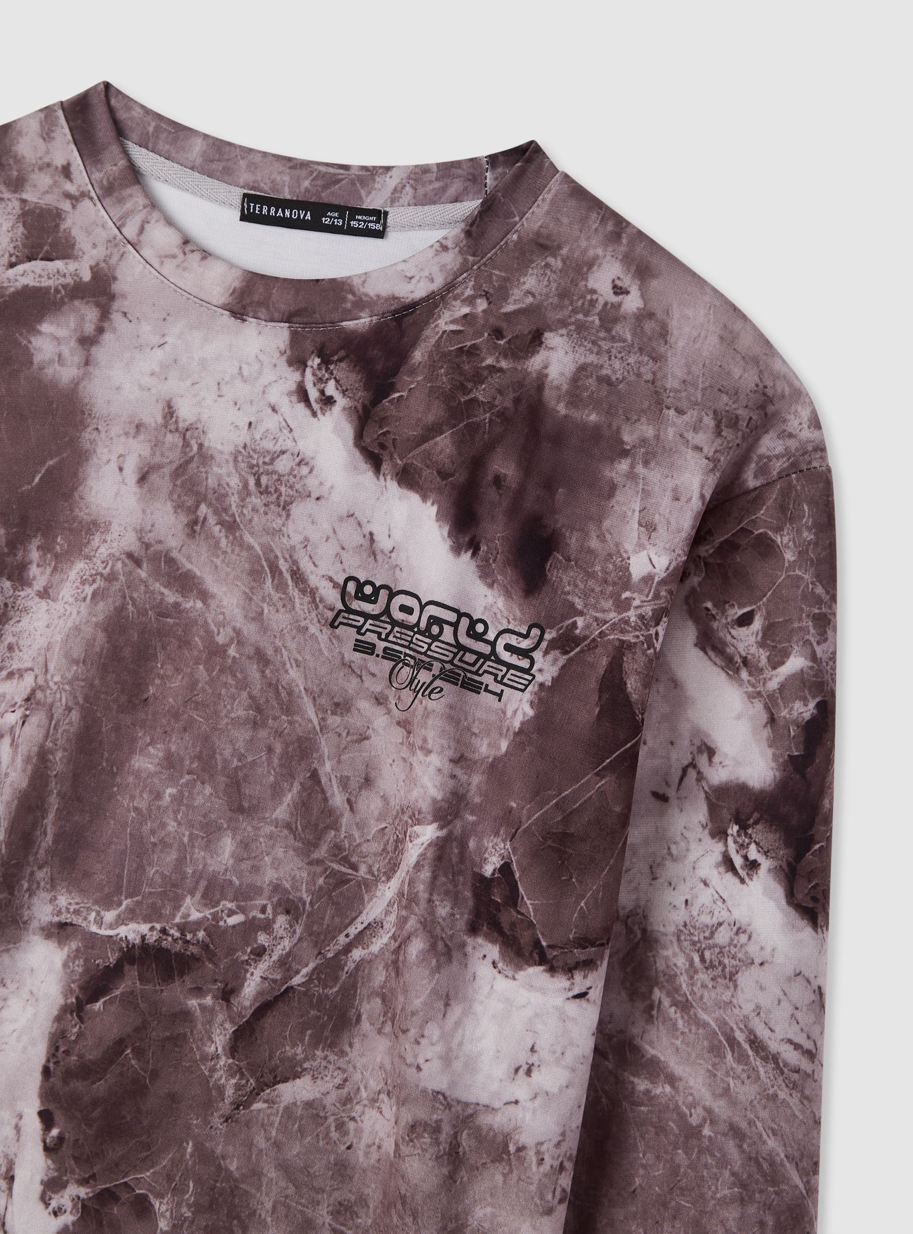 Felpa da bambino a maniche lunghe con stampa all over effetto marmo e scritta sul petto e sul polsino. Girocollo e fondo con bordo lavorato per una vestibilità confortevole. Modello senza cappuccio e senza zip. Perfetta per look casual con jeans e sneakers, ideale per scuola o tempo libero. Tessuto pesante.Dettagli