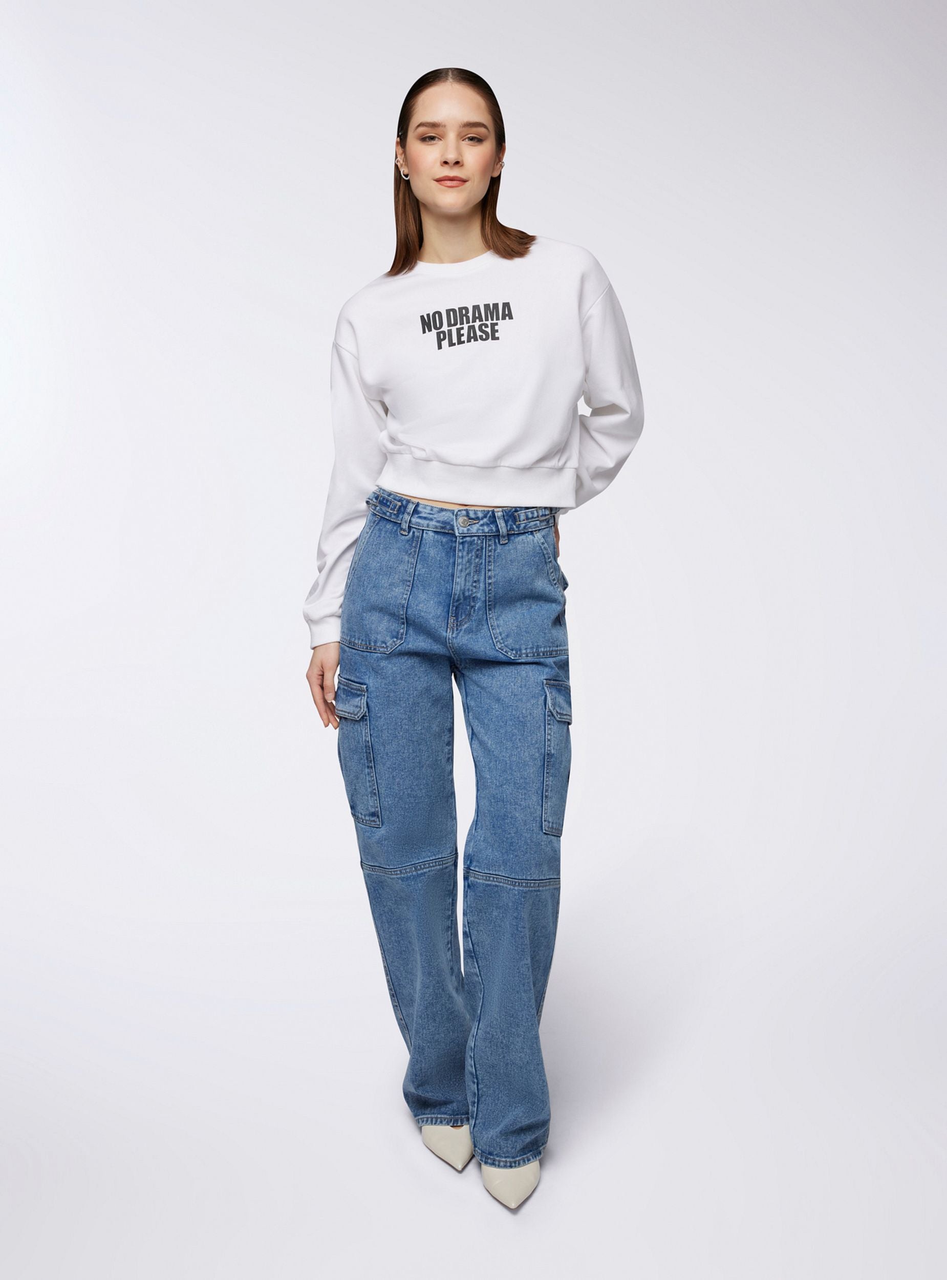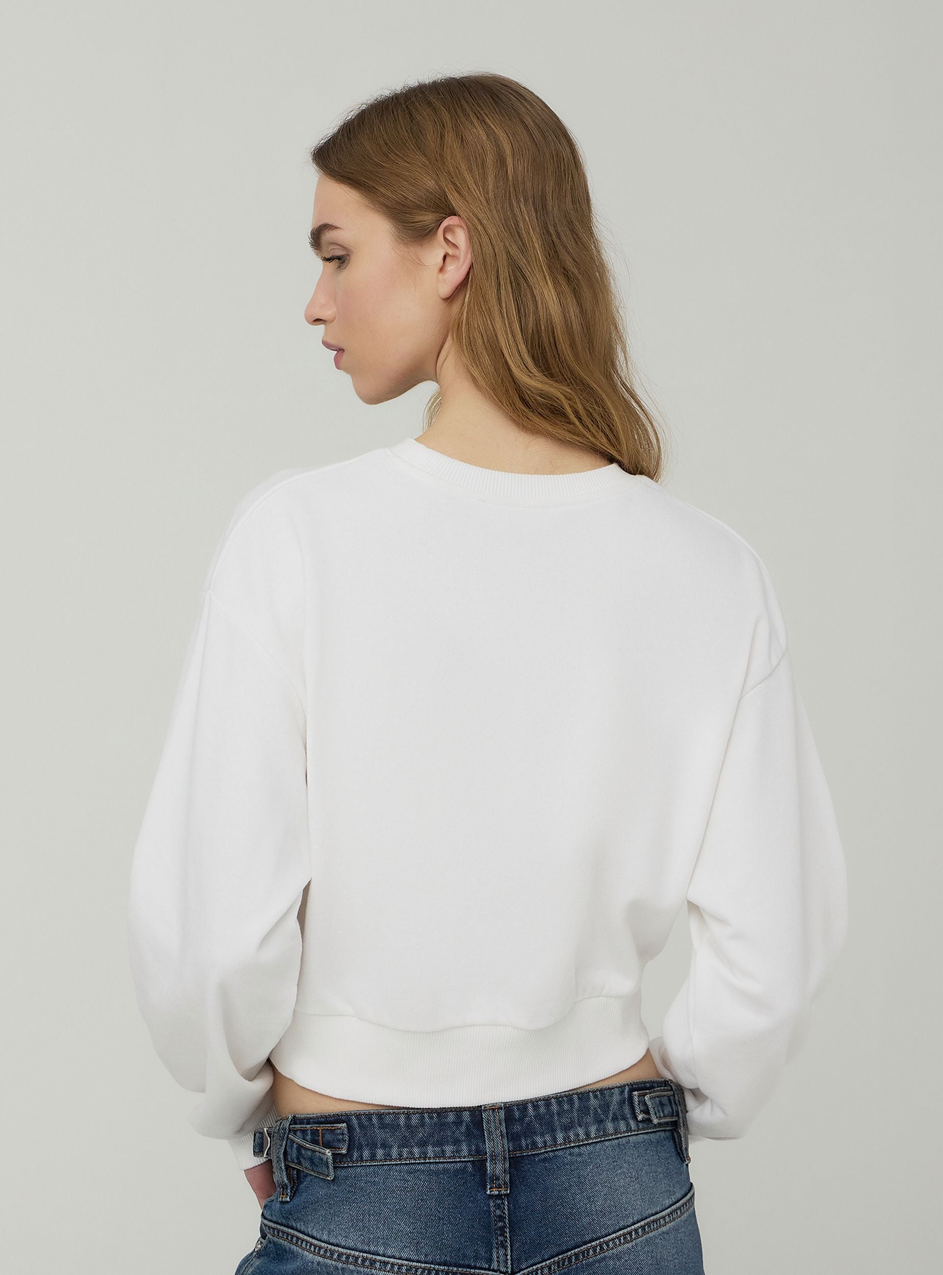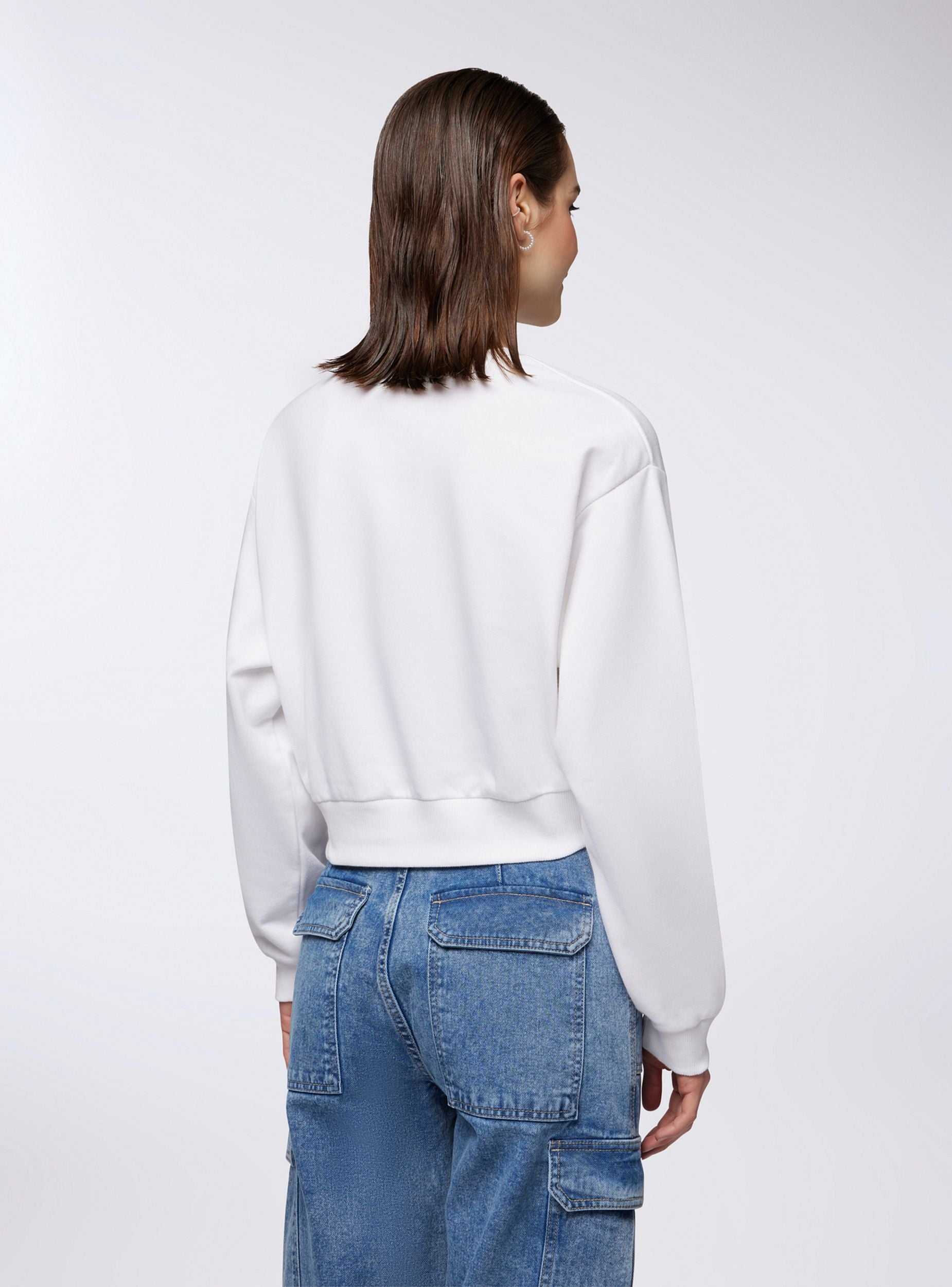 Felpa leggera da donna a tinta unita, caratterizzata da una scritta decorativa sul davanti che aggiunge un tocco di personalità al capo. Il design crop senza cappuccio e senza zip la rende ideale per un look moderno e informale. Perfetta da abbinare a pantaloni a vita alta o joggers, garantisce stile e comfort per ogni occasione casual.Dettagli