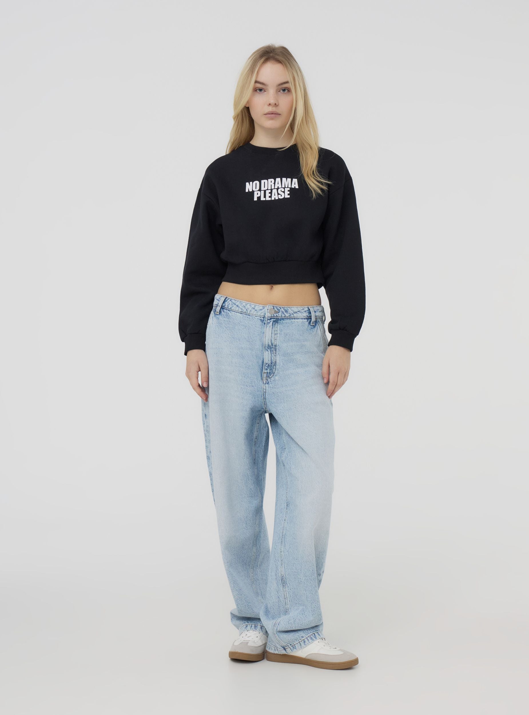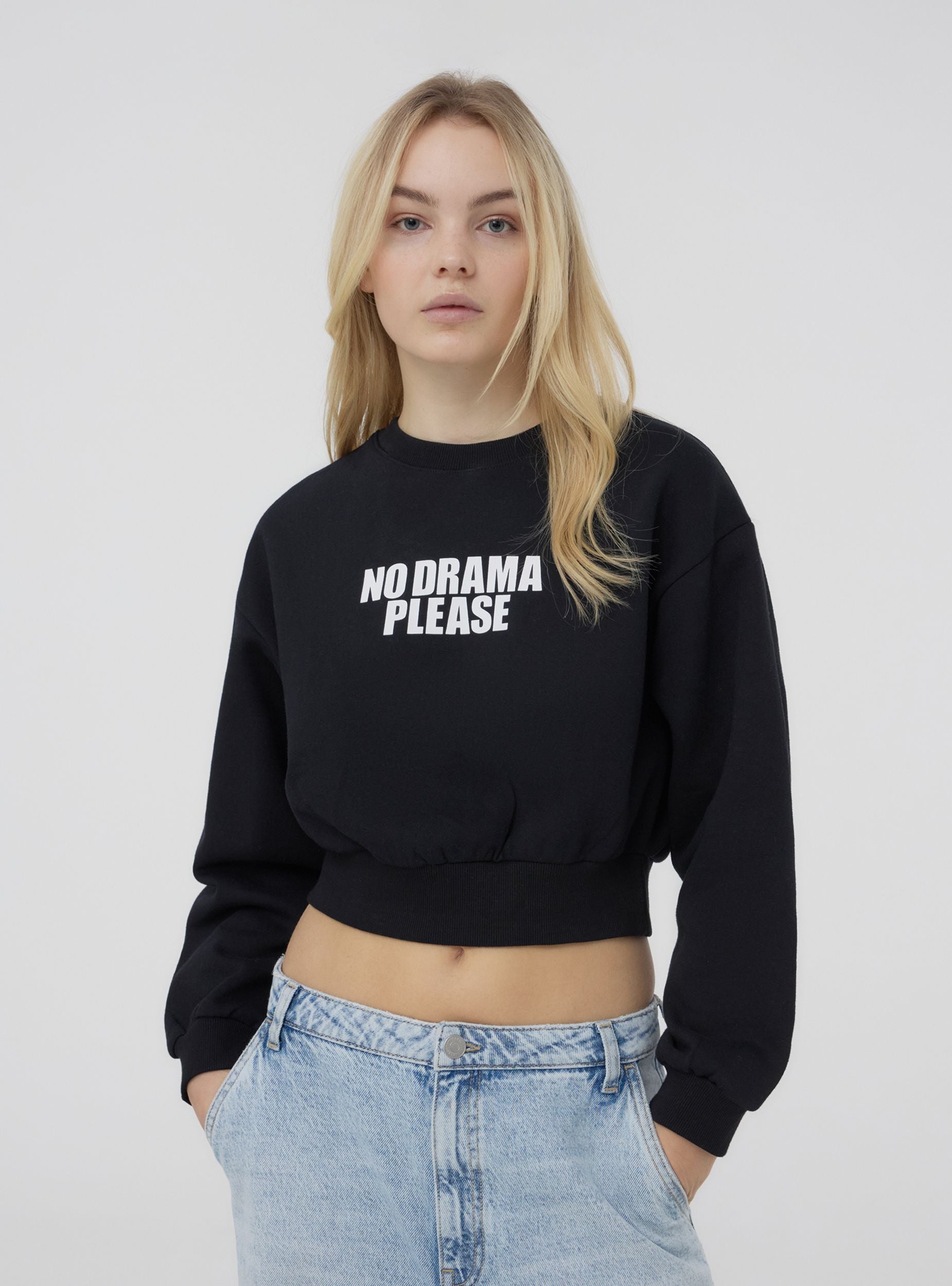Felpa leggera da donna a tinta unita, caratterizzata da una scritta decorativa sul davanti che aggiunge un tocco di personalità al capo. Il design crop senza cappuccio e senza zip la rende ideale per un look moderno e informale. Perfetta da abbinare a pantaloni a vita alta o joggers, garantisce stile e comfort per ogni occasione casual.Dettagli