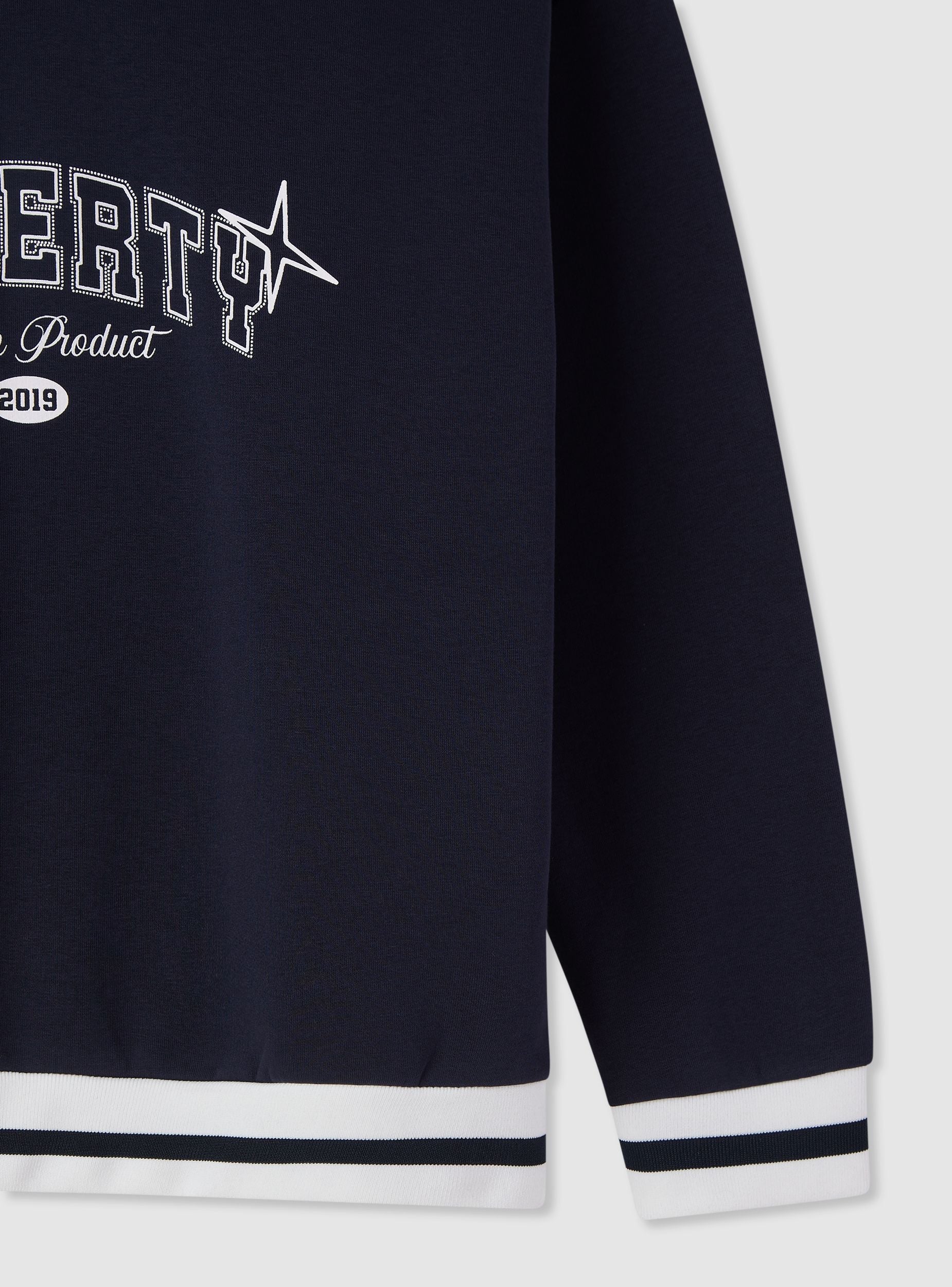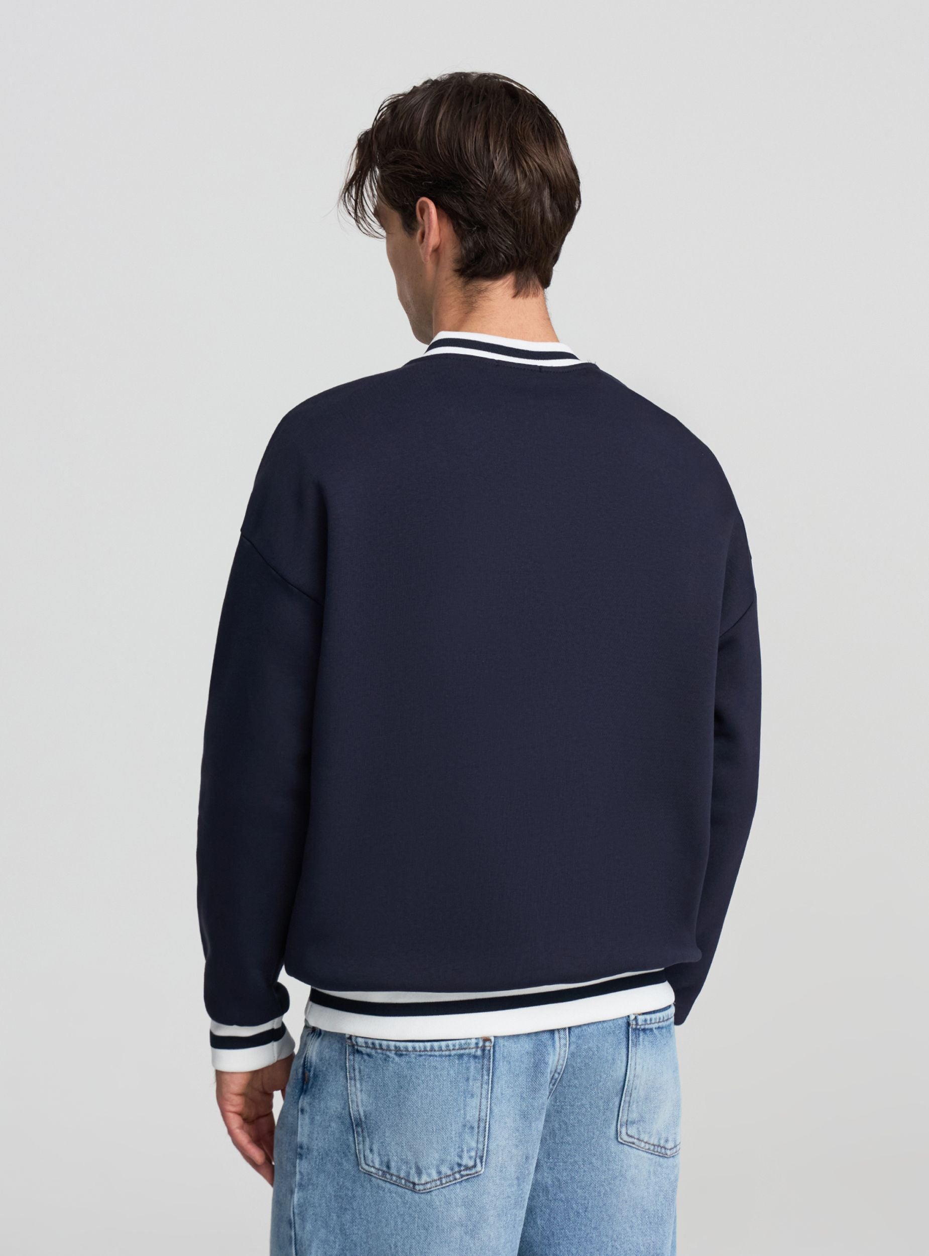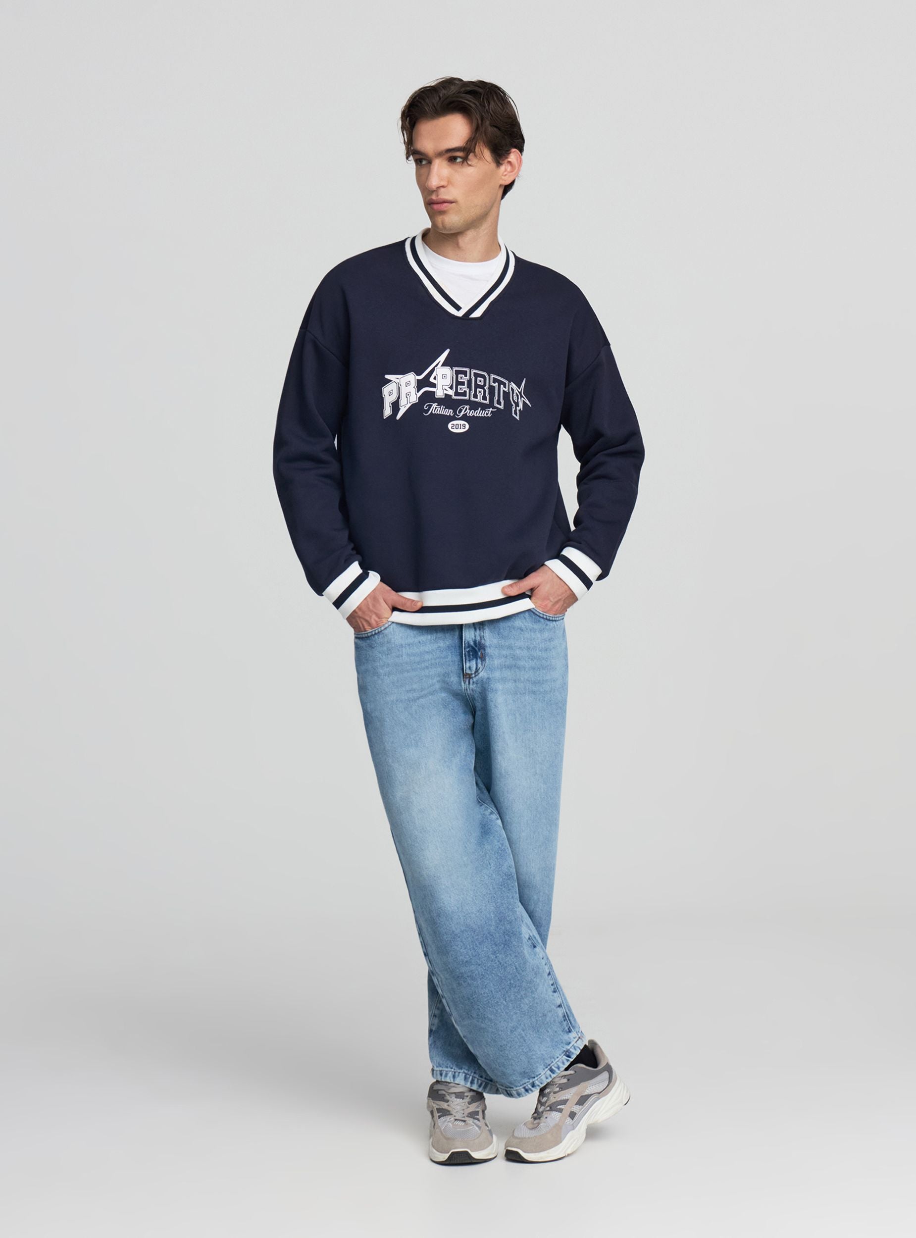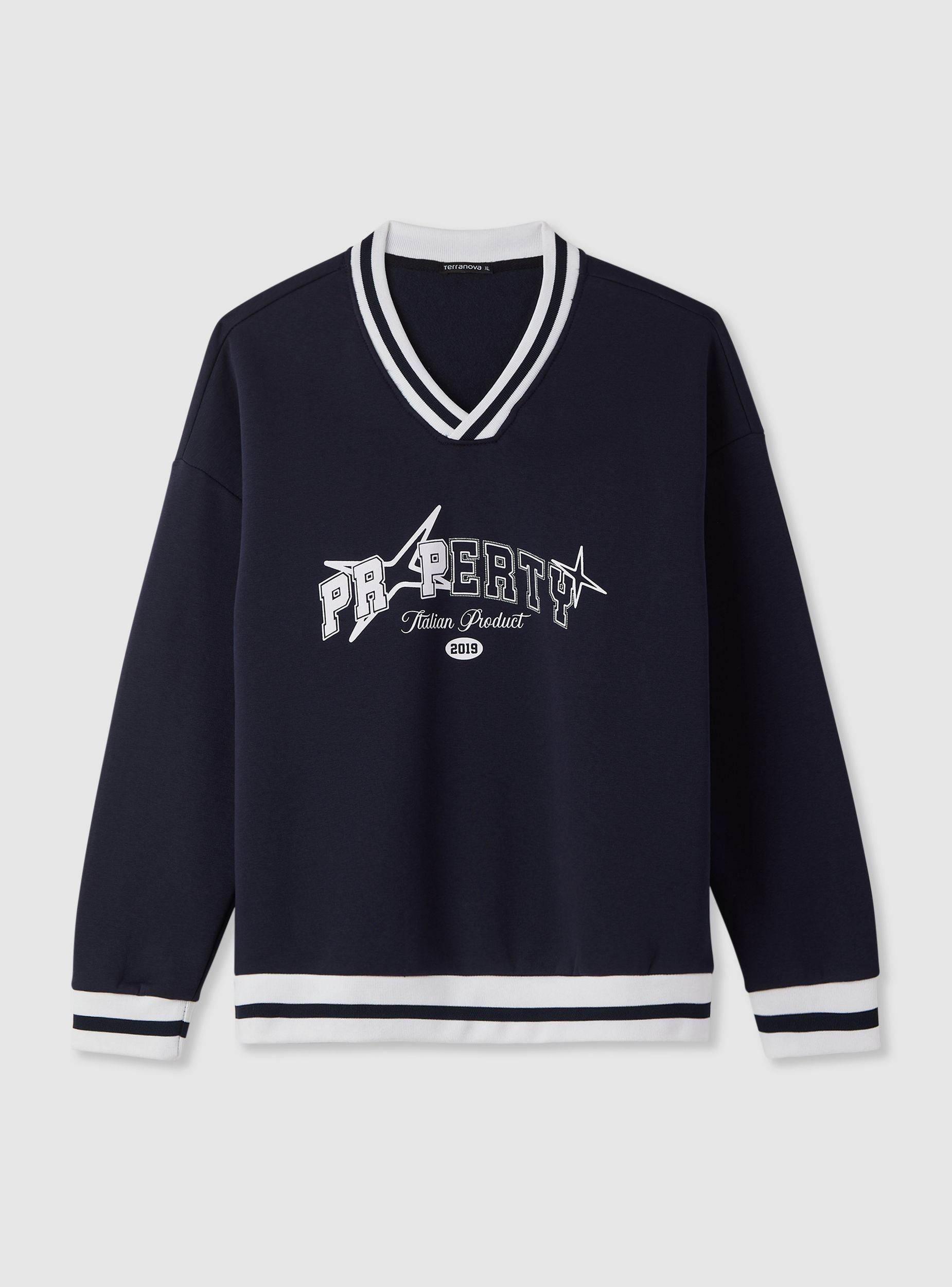 Felpa boxy da uomo senza zip e senza cappuccio, fantasia con scritta college sul davanti. Scollo a V con bordi a righe, maniche lunghe e polsini elasticizzati. Fondo con fascia a righe coordinata che dona un tocco sportivo e una vestibilità confortevole. Ideale per look casual con jeans e sneakers o per outfit urban. Tessuto pesante.Dettagli