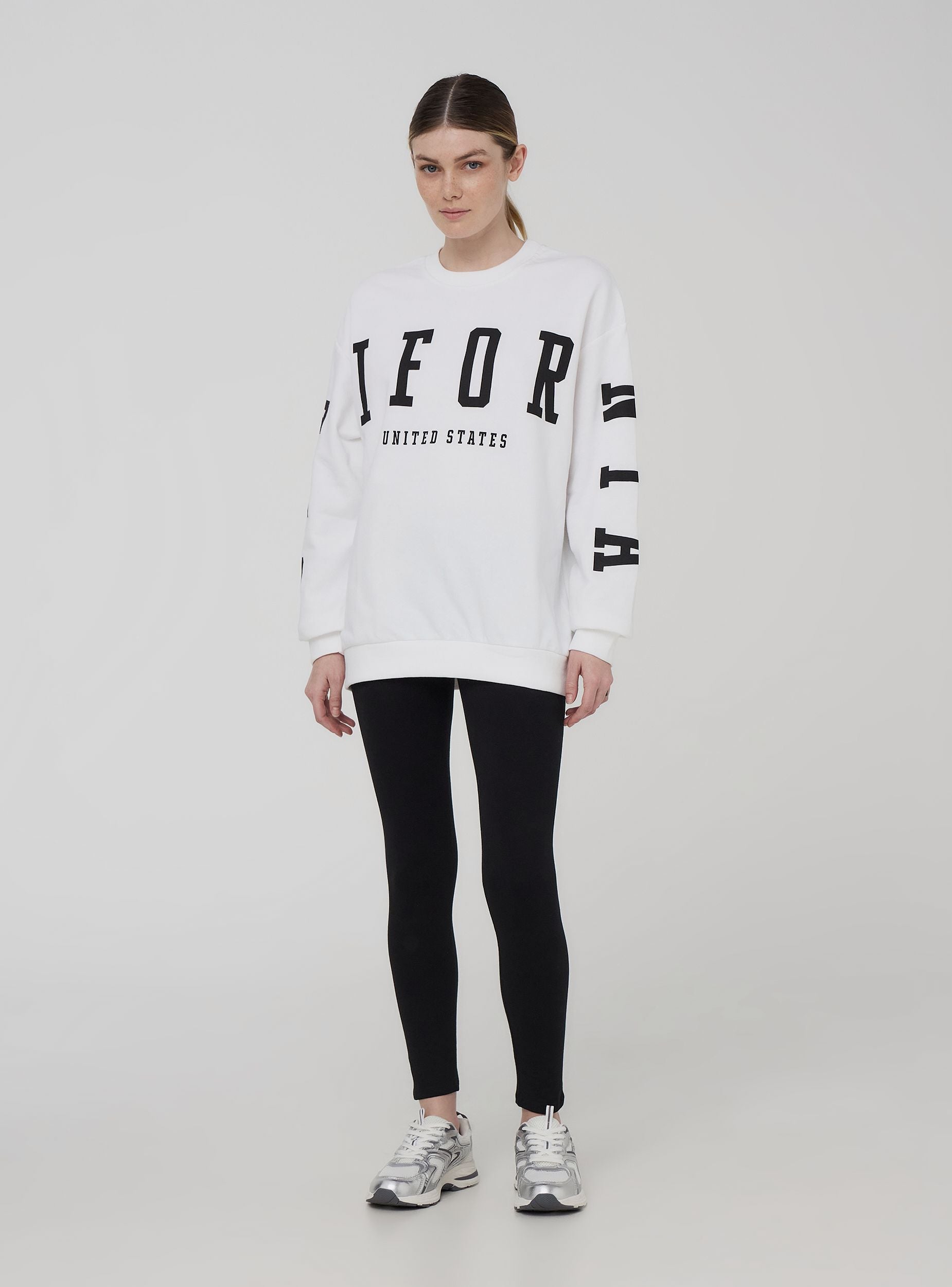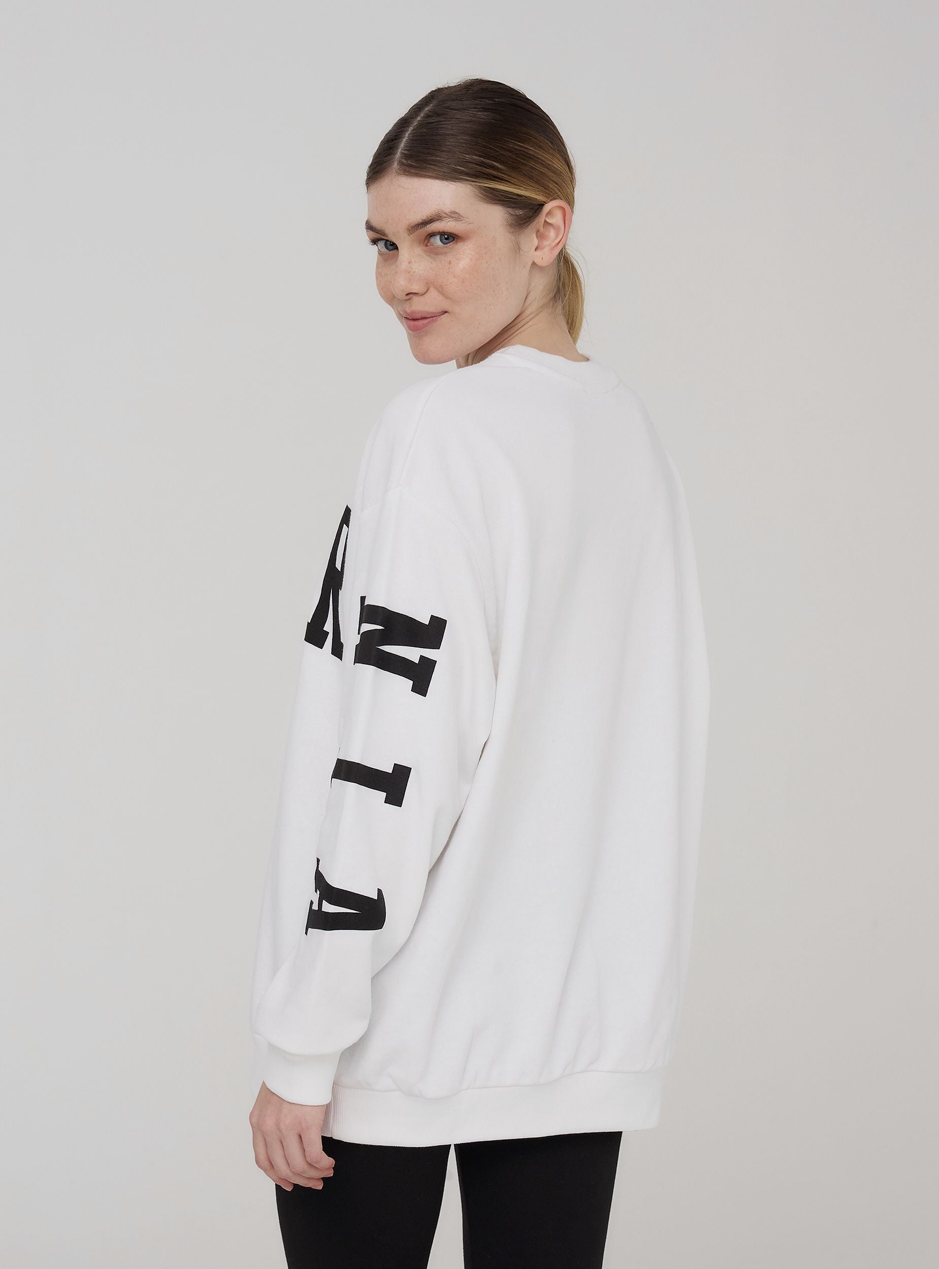 Felpa leggera da donna dal taglio maxi con maniche lunghe. Felpa senza zip e senza cappuccio. La scritta frontale che prende parte anche sulle maniche aggiunge un tocco grintoso e urbano, perfetto per chi ama lo streetwear. Ideale da abbinare a leggings, biker shorts o joggers, si presta a look casual e trendy, perfetti per il tempo libero e le giornate più rilassate.Dettagli