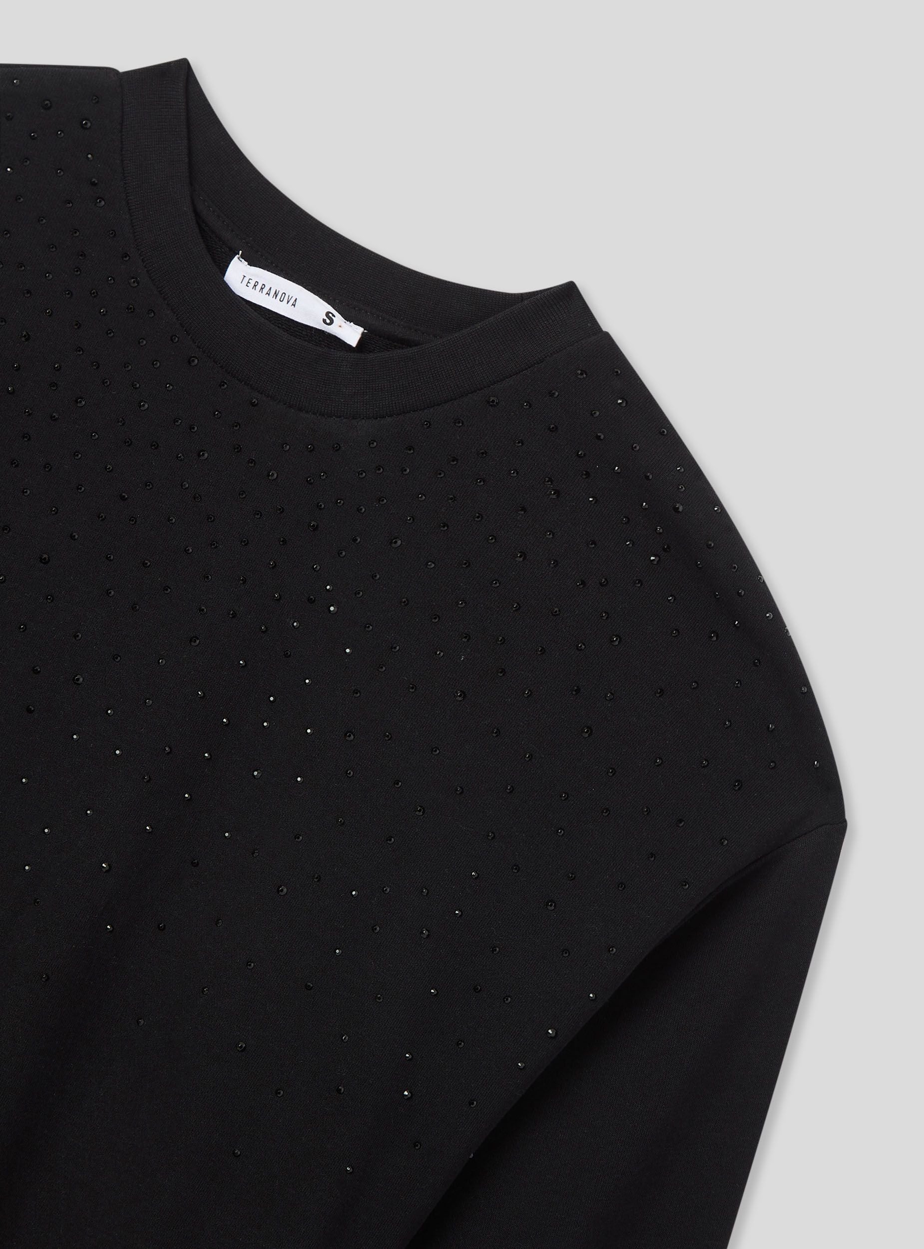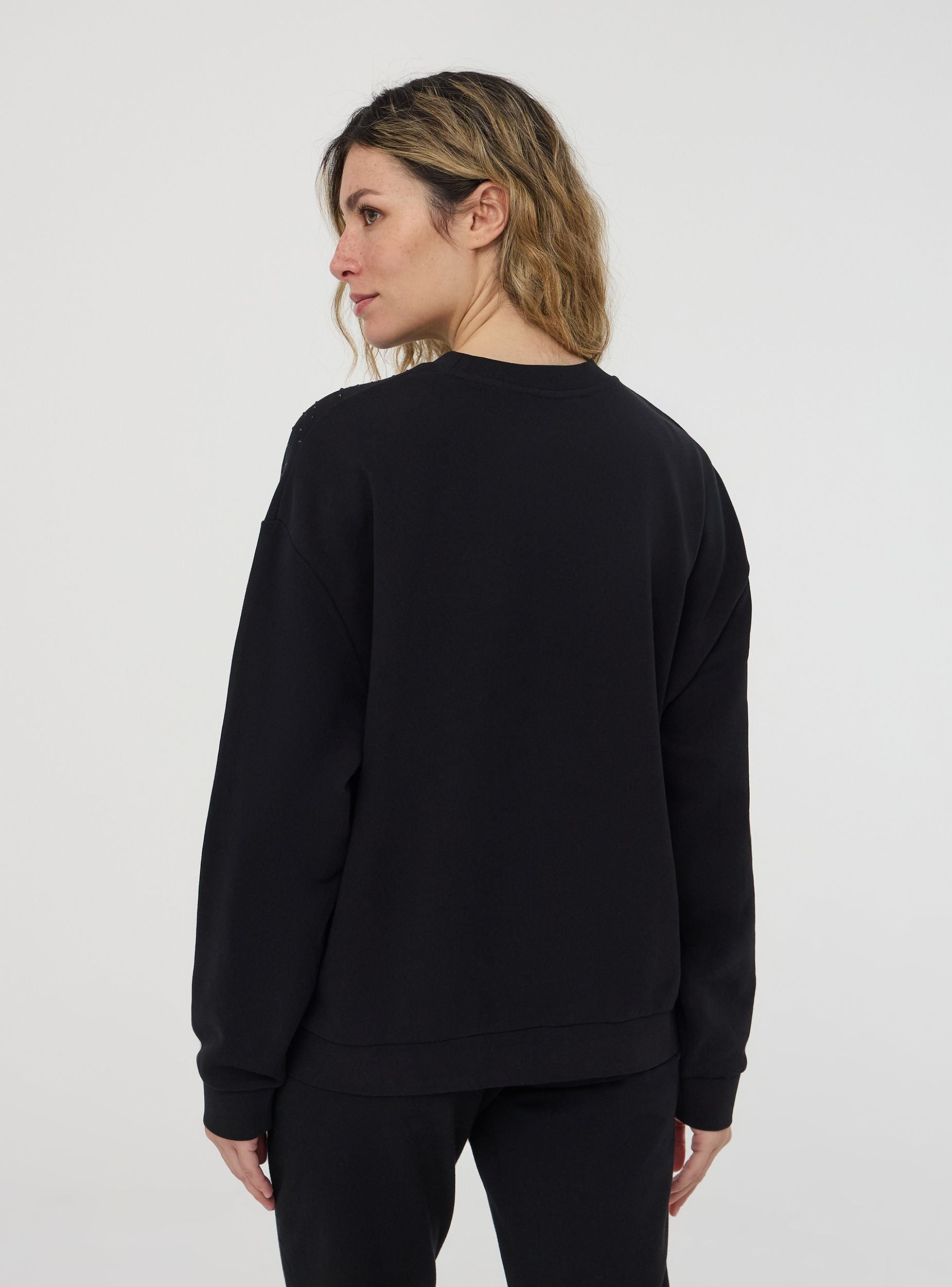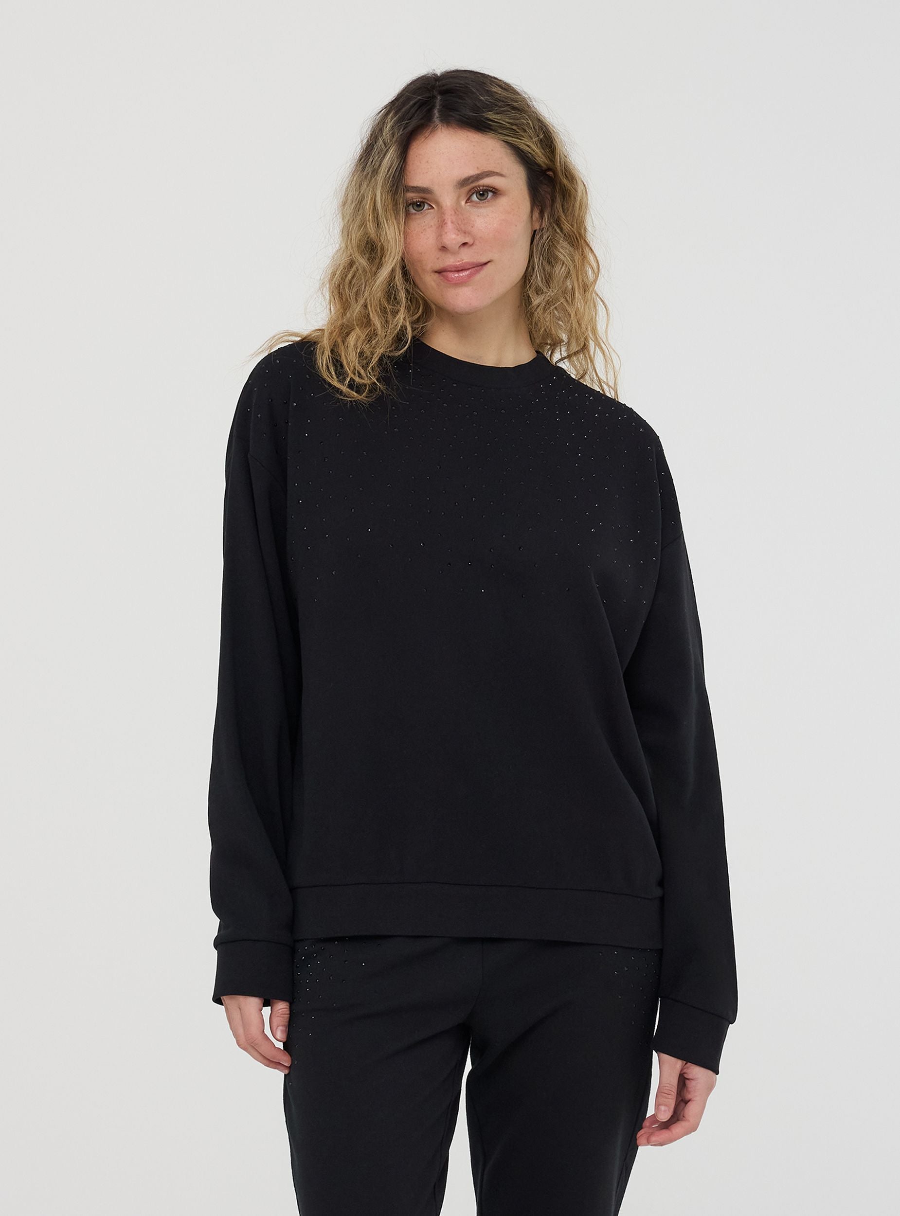 Felpa leggera da donna a maniche lunghe, senza zip e senza cappuccio, impreziosita da dettagli di strass che aggiungono un tocco luminoso e femminile. Perfetta per un look casual ma raffinato, si abbina facilmente a jeans, pantaloni eleganti o joggers per un outfit versatile. Ideale per il tempo libero, le uscite serali o per un tocco glamour nella quotidianità.Dettagli