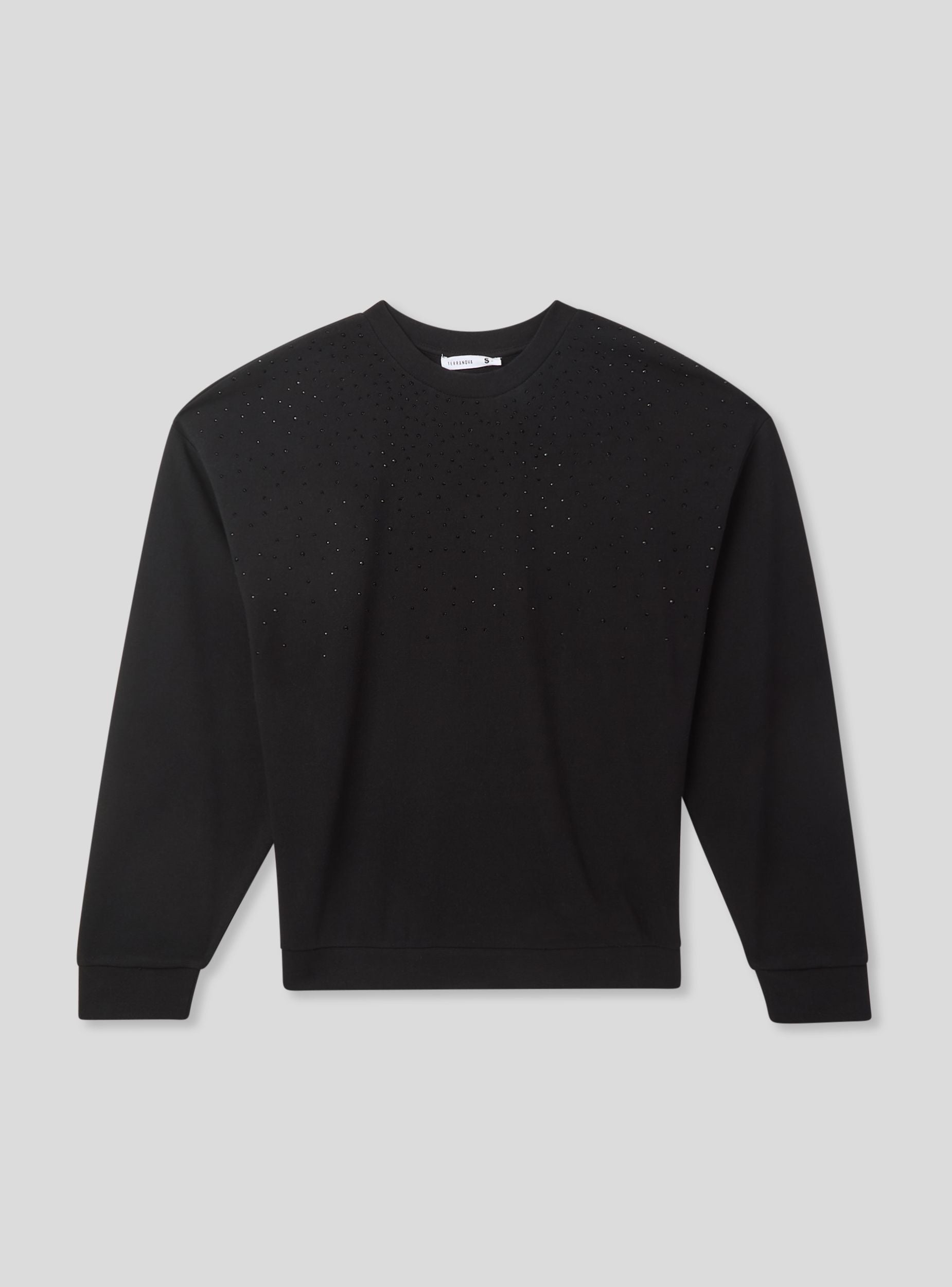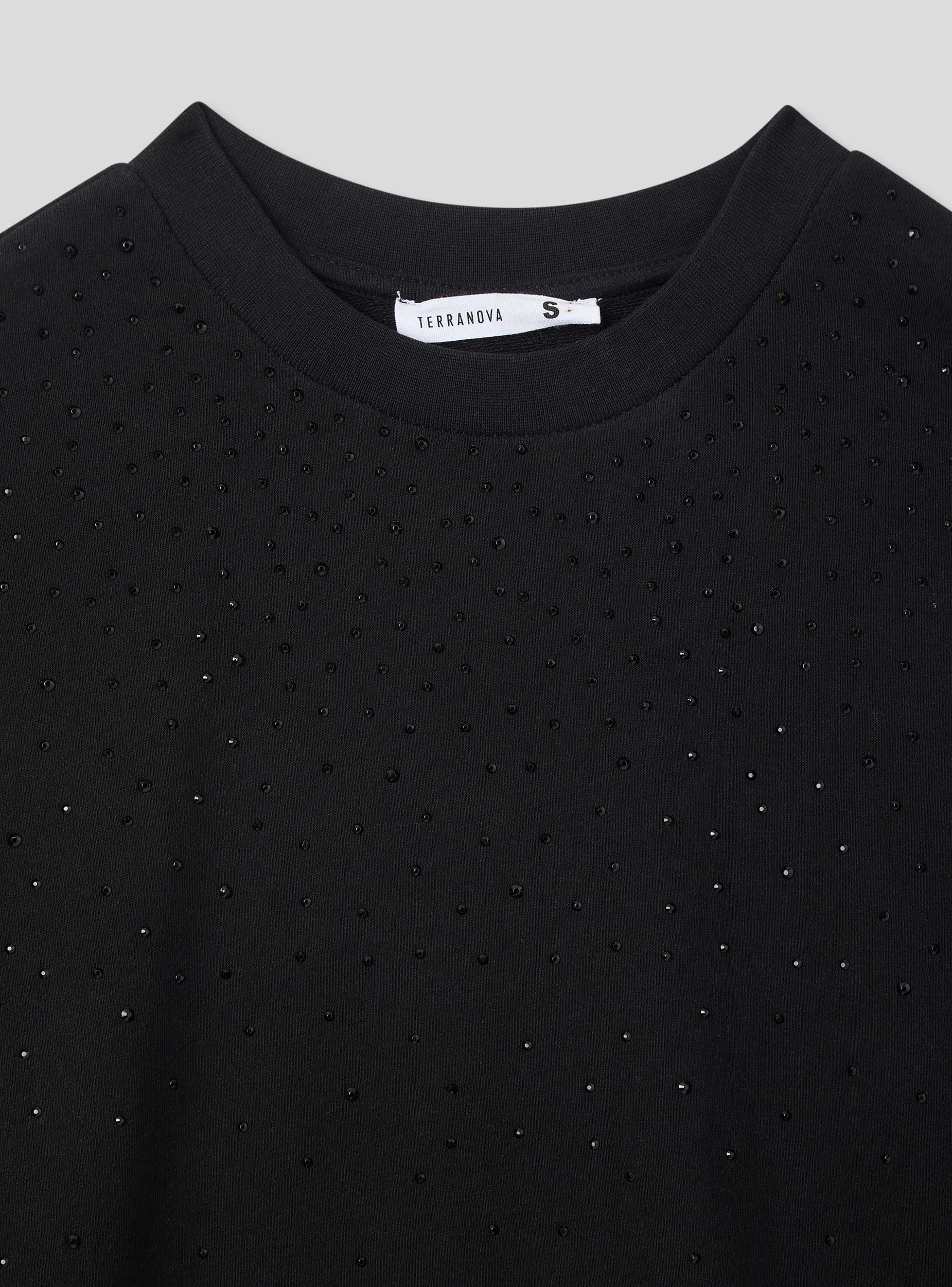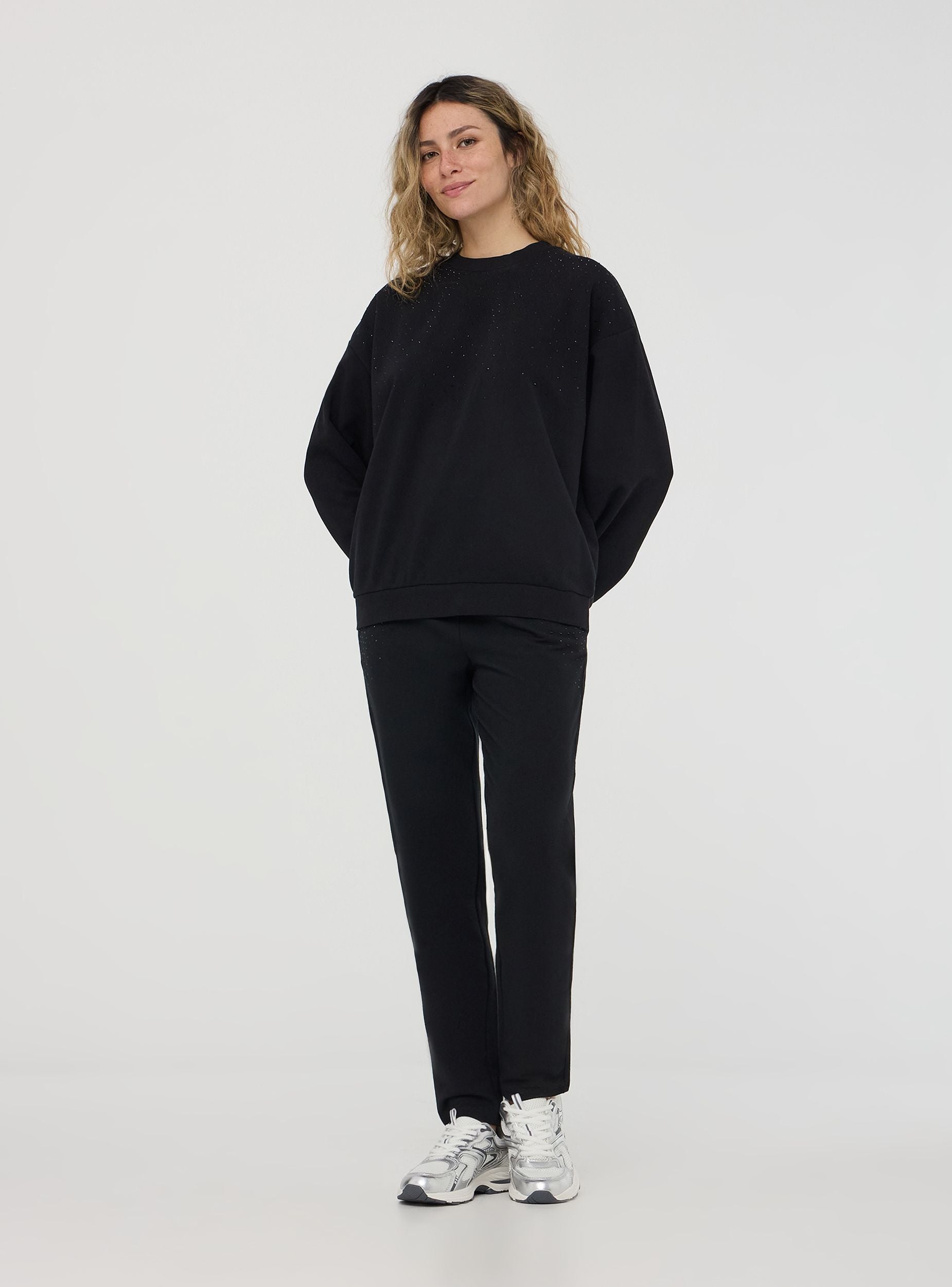 Felpa leggera da donna a maniche lunghe, senza zip e senza cappuccio, impreziosita da dettagli di strass che aggiungono un tocco luminoso e femminile. Perfetta per un look casual ma raffinato, si abbina facilmente a jeans, pantaloni eleganti o joggers per un outfit versatile. Ideale per il tempo libero, le uscite serali o per un tocco glamour nella quotidianità.Dettagli