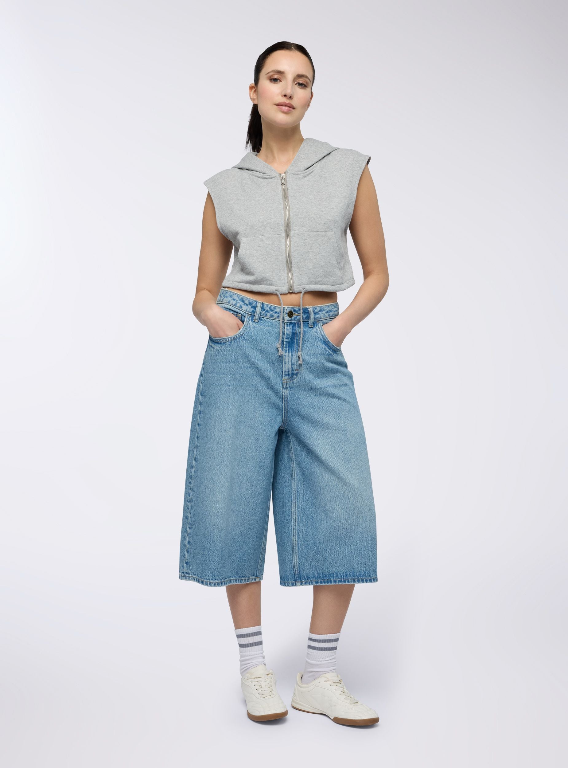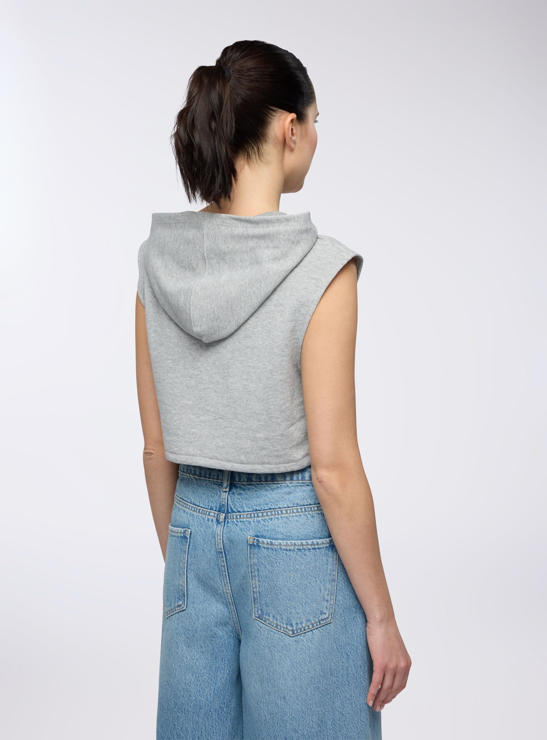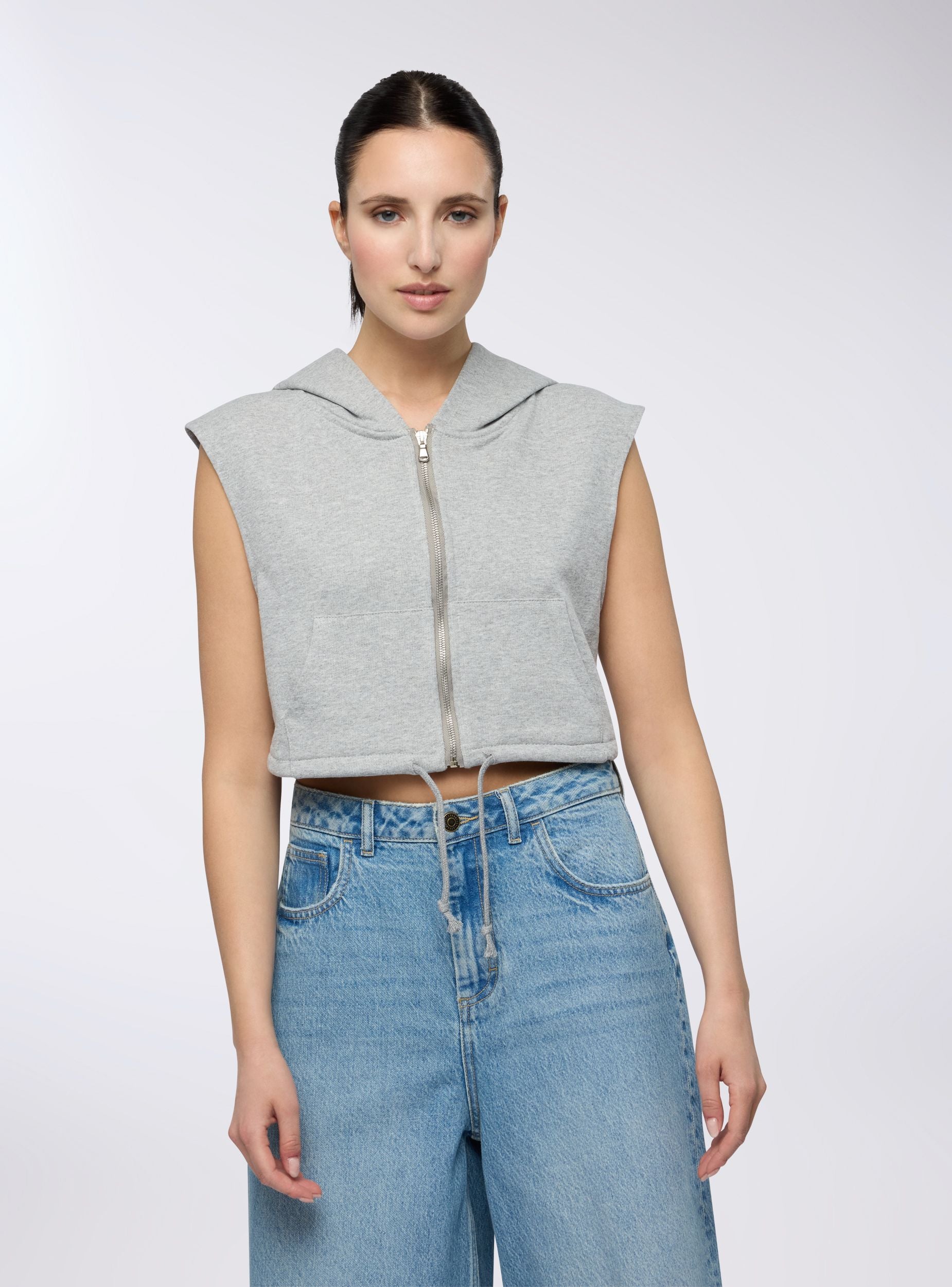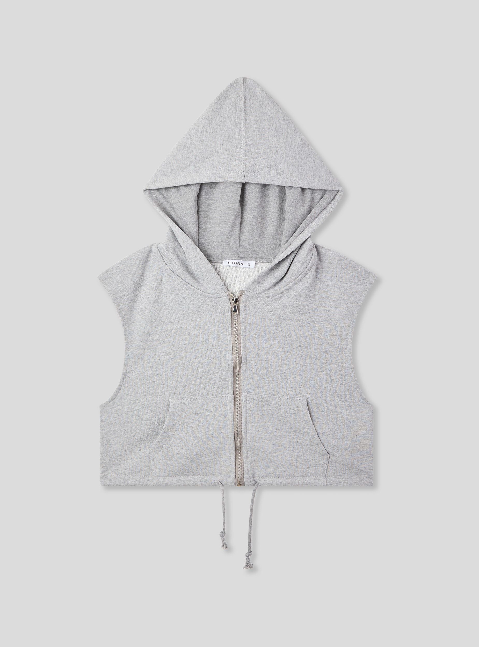 Felpa smanicata leggera da donna con cappuccio e chiusura a zip frontale, ideale per un look sporty e versatile. Il modello con coulisse sul fondo dona un tocco moderno, mentre la struttura senza maniche permette di indossarla sia come capo unico sia a strati. Comoda e leggera, è perfetta con top aderenti e pantaloni jogger per un outfit urban rilassato.Dettagli