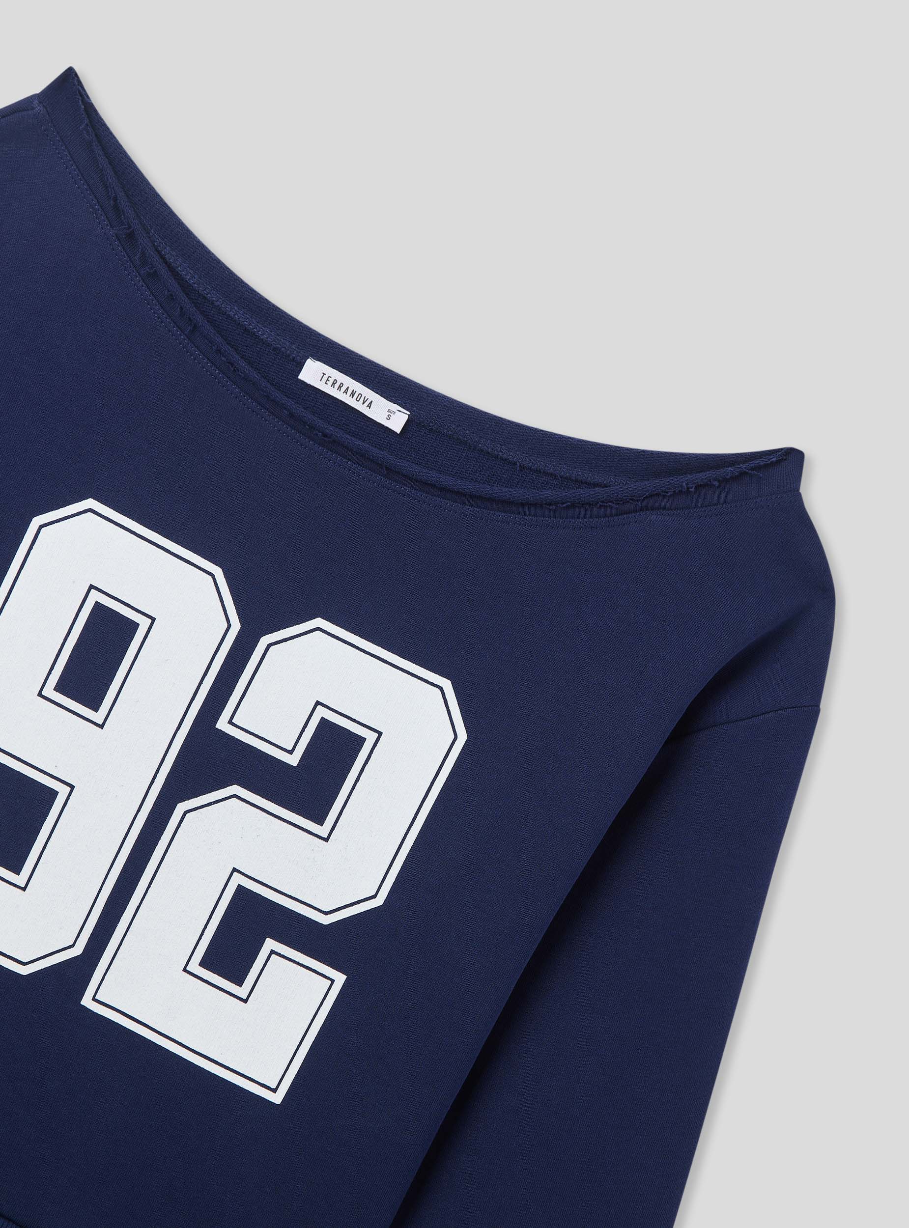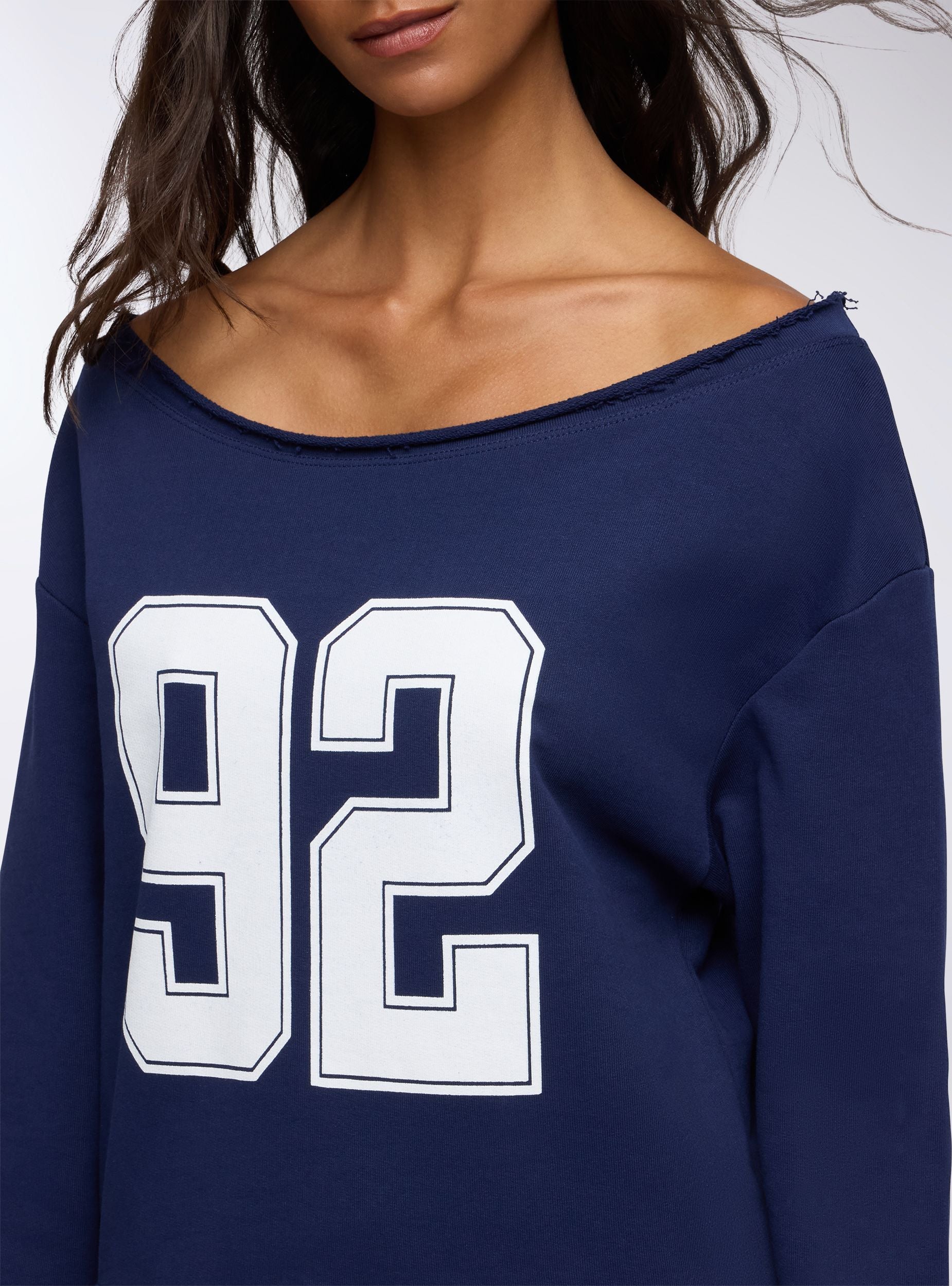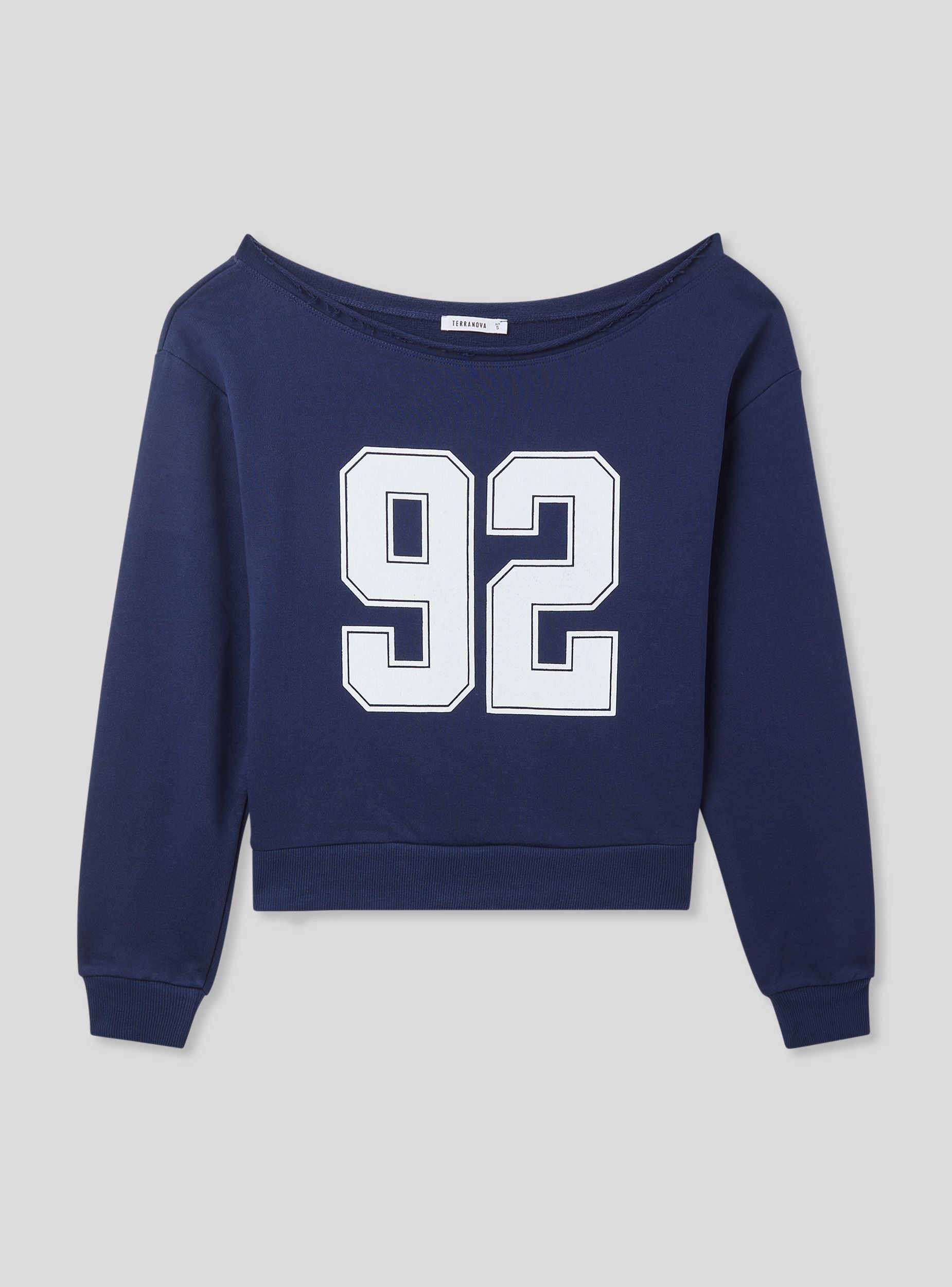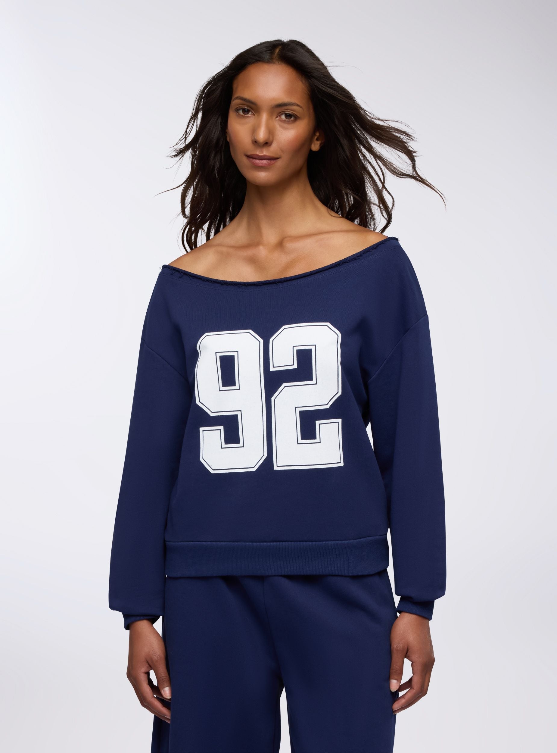 Felpa leggera da donna con stampa frontale ispirata allo stile college, perfetta per un look casual e sportivo. Lo scollo ampio che lascia le spalle scoperte donano un tocco femminile e moderno, ideale da abbinare a pantaloni jogger, jeans a vita alta o shorts per un outfit rilassato e dinamico. Ottima scelta per il tempo libero, le giornate di studio o per uno stile athleisure di tendenza.Dettagli